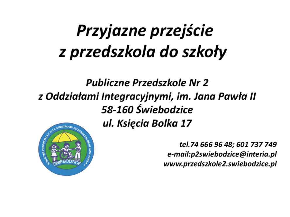 Przyjazne przejście z przedszkola do szkoły Publiczne Przedszkole Nr 2 z Oddziałami Integracyjnymi, im. Jana Pawła II 58-160 Świebodzice ul. Księcia Bolka 17 tel.74 666 96 48; 601 737 749 e-mail:[email protected] www.przedszkole2.swiebodzice.pl Prezentacja przedstawia formy współpracy przedszkola ze szkołami podstawowymi ze Świebodzic. Głównym celem wszystkich podejmowanych działań: jest przyjazna adaptacja dzieci sześcioletnich do edukacji szkolnej oraz promowanie aktywnego stylu życia, bezpieczeństwa i zdrowia wśród najmłodszych. Przed pierwszym dzwonkiem Przedszkolaki poznają drogę do szkoły: znają zasady ruchu drogowego, które obowiązują pieszych znają znaki drogowe: Przejście dla pieszych; Uwaga dzieci!; Stop! Dziecko na drodze znają zasady bezpiecznego przechodzenia przez jezdnię Wiedzą jak bezpiecznie poruszać się po drodze, idąc do i ze szkoły - Dzieci poznają pomieszczenia znajdujące się w szkole - Szkoła Podstawowa Nr 2 wejście do szkoły holl i korytarze szatnia sale lekcyjne Szkolny plac zabaw, Szkoła Podstawowa Nr 2 Organizowane ze szkołami imprezy środowiskowe stwarzają możliwość wzajemnego poznawania się dzieci, nauczycieli, rodziców Piknik rodzinny – Dla Ciebie Mamo , dla Ciebie tato, Plac apelowy przy Szkole Podstawowej Nr 2 Święto pieczonego ziemniaka, Plac apelowy przy Szkole Podstawowej Nr 2 Spotkania integracyjne – wspólne zabawy, prezentacje, uczą dzieci wiary we własne możliwości, pokonywania trudności, tolerancji „Świat bez zagrożeń” – spotkanie z uczniami Szkoły Podstawowej Nr 7 „Zielono mi, czyli w poszukiwaniu Wielkanocnego Zajączka”, Szkoła Podstawowa Nr 3 „Dzień Integracji’, w Szkole Podstawowej Nr 2 „Śniadanie daje moc”, Szkoła Podstawowa Nr 2 „Święto Pluszowego Misia”, w Szkole Podstawowej Nr 4 Prezentacje teatrzyków w wykonaniu uczniów uświadamiają dzieciom, że szkoła to nie tylko lekcje i zadania domowe Teatrzyk „Czarownica u Dentysty”, „Ekologiczny Kapturek”, Szkoła Podstawowa Nr 2 Teatrzyk „Śmieszka”, „Kopciuszek”, Szkoła Podstawowa Nr 2 Jasełka, Szkoła Podstawowa Nr 2 „Cała Polska czyta dzieciom” umiejętność czytania otwiera przed dziećmi nowe nieznane światy. Spotkanie w przedszkolu z uczniami i nauczycielami Szkoły Podstawowej Nr 2 „Bajkowe czwartki” – czytanie literatury Dziecięcej przez uczniów Szkoły Podstawowej Nr 2 w przedszkolu Lekcje otwarte – łagodzą obawy dzieci przed tym co nowe, nieznane, Szkoła Podstawowa Nr 2 Absolwenci przedszkola – uczniowie pierwszych klas dzielą się swoimi spostrzeżeniami i wrażeniami - szkoła to ciekawe, przyjazne miejsce, do którego z radością przychodzą każdego dnia, spotkanie w przedszkolu Drzwi otwarte organizowane przez szkoły podstawowe – pozwalają rodzicom i dzieciom zapoznać się z ofertą zajęć, pomieszczeniami, sposobem przygotowania się na przyjęcie sześciolatków, Szkoła Podstawowa Nr 2 Spotkania rodziców z Dyrektorami szkół podstawowych w przedszkolu