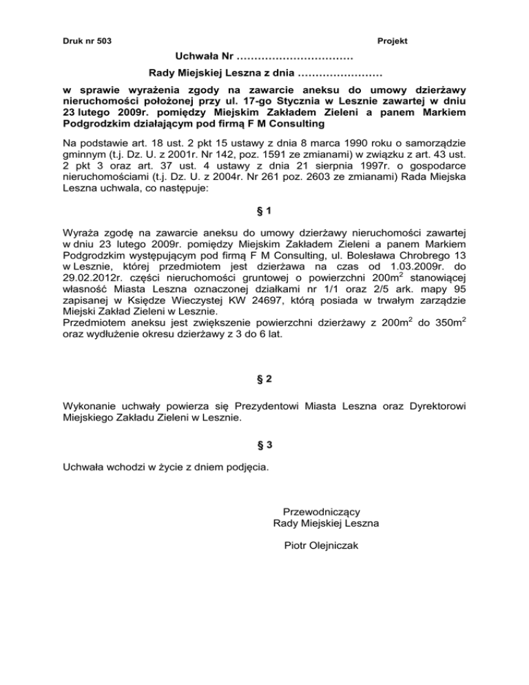 Druk nr 503 Projekt Uchwała Nr …………………………… Rady Miejskiej Leszna z dnia …………………… w sprawie wyrażenia zgody na zawarcie aneksu do umowy dzierżawy nieruchomości położonej przy ul. 17-go Stycznia w Lesznie zawartej w dniu 23 lutego 2009r. pomiędzy Miejskim Zakładem Zieleni a panem Markiem Podgrodzkim działającym pod firmą F M Consulting Na podstawie art. 18 ust. 2 pkt 15 ustawy z dnia 8 marca 1990 roku o samorządzie gminnym (t.j. Dz. U. z 2001r. Nr 142, poz. 1591 ze zmianami) w związku z art. 43 ust. 2 pkt 3 oraz art. 37 ust. 4 ustawy z dnia 21 sierpnia 1997r. o gospodarce nieruchomościami (t.j. Dz. U. z 2004r. Nr 261 poz. 2603 ze zmianami) Rada Miejska Leszna uchwala, co następuje: §1 Wyraża zgodę na zawarcie aneksu do umowy dzierżawy nieruchomości zawartej w dniu 23 lutego 2009r. pomiędzy Miejskim Zakładem Zieleni a panem Markiem Podgrodzkim występującym pod firmą F M Consulting, ul. Bolesława Chrobrego 13 w Lesznie, której przedmiotem jest dzierżawa na czas od 1.03.2009r. do 29.02.2012r. części nieruchomości gruntowej o powierzchni 200m2 stanowiącej własność Miasta Leszna oznaczonej działkami nr 1/1 oraz 2/5 ark. mapy 95 zapisanej w Księdze Wieczystej KW 24697, którą posiada w trwałym zarządzie Miejski Zakład Zieleni w Lesznie. Przedmiotem aneksu jest zwiększenie powierzchni dzierżawy z 200m2 do 350m2 oraz wydłużenie okresu dzierżawy z 3 do 6 lat. §2 Wykonanie uchwały powierza się Prezydentowi Miasta Leszna oraz Dyrektorowi Miejskiego Zakładu Zieleni w Lesznie. §3 Uchwała wchodzi w życie z dniem podjęcia. Przewodniczący Rady Miejskiej Leszna Piotr Olejniczak Uzasadnienie do Uchwały Nr ……………… Rady Miejskiej Leszna z dnia ……………………… w sprawie wyrażenia zgody na zawarcie aneksu do umowy dzierżawy nieruchomości położonej przy ul. 17-go Stycznia w Lesznie zawartej w dniu 23 lutego 2009r. pomiędzy Miejskim Zakładem Zieleni a panem Markiem Podgrodzkim działającym pod firmą F M Consulting Na będącej przedmiotem dzierżawy nieruchomości, zlokalizowanej w Parku 1000-lecia Pan Marek Podgrodzki wybudował własnym nakładem urządzenia do uprawiania aktywnej rekreacji w postaci Parku Linowego „Tarzan”. Park linowy stał się dużą atrakcją przyciągającą młodzież i dorosłych z Leszna i okolic, na trwałe wpisując się w ofertę aktywnego wypoczynku w Lesznie. Ponadto park linowy jest jednym z elementów realizowanego przez Miejski Zakład Zieleni procesu rewitalizacji Parku 1000-lecia. Z obserwacji poczynionych przez dzierżawcę w pierwszym sezonie funkcjonowania parku linowego wynika, że dla zaspokojenia możliwości korzystania z parku linowego przez każdą grupę wiekową, konieczne jest wybudowanie dodatkowej trasy przeznaczonej dla dzieci w wieku przedszkolnym i pierwszych klas szkoły podstawowej. W związku z powyższym Pan Marek Podgrodzki zwrócił się do Prezydenta Miasta Leszna z wnioskiem o zawarcie aneksu do umowy dzierżawy polegającego na zwiększeniu o 150m2 dzierżawionego terenu (obecnie 200m2) w celu lokalizacji nowej trasy oraz przedłużenie terminu dzierżawy terenu do 6 lat (obecnie 3 lata), które umożliwią mu zwrot poniesionych nakładów. Wybór dzierżawcy terenu, na którym został zlokalizowany park linowy oraz wysokość dzierżawy zostały ustalone w wyniku ogłoszonego przez Miejski Zakład Zieleni przetargu. Przychody Miejskiego zakładu zielenie z tytułu dzierżawy wzrosłyby proporcjonalnie do wzrostu dzierżawionej powierzchni. Zgodnie z treścią art. 43 ust. 2 pkt. 3 ustawy z dnia 21 sierpnia 1997r. o gospodarce nieruchomościami Miejski Zakład Zieleni ma prawo oddać posiadaną w trwałym zarządzie nieruchomość w dzierżawę na czas oznaczony dłuższy niż 3 lata za zgodą Rady Miejskiej. Opracował: Wydział GKiOŚ Zatwierdził: