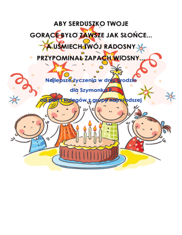 ABY SERDUSZKO TWOJE GORĄCE BYŁO ZAWSZE JAK SŁOŃCE... A UŚMIECH TWÓJ RADOSNY PRZYPOMINAŁ ZAPACH WIOSNY... Najlepsze życzenia w dniu urodzin dla Szymonka P. od pań i kolegów z grupy najmłodszej