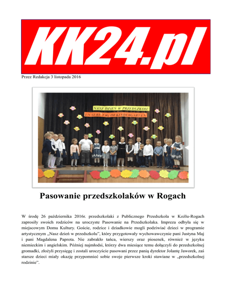 Przez Redakcja 3 listopada 2016 Pasowanie przedszkolaków w Rogach W środę 26 października 2016r. przedszkolaki z Publicznego Przedszkola w Koźlu-Rogach zaprosiły swoich rodziców na uroczyste Pasowanie na Przedszkolaka. Impreza odbyła się w miejscowym Domu Kultury. Goście, rodzice i dziadkowie mogli podziwiać dzieci w programie artystycznym „Nasz dzień w przedszkolu”, który przygotowały wychowawczynie pani Justyna Maj i pani Magdalena Paprota. Nie zabrakło tańca, wierszy oraz piosenek, również w języku niemieckim i angielskim. Później najmłodsi, którzy dwa miesiące temu dołączyli do przedszkolnej gromadki, złożyli przysięgę i zostali uroczyście pasowani przez panią dyrektor Jolantę Jaworek, zaś starsze dzieci miały okazję przypomnieć sobie swoje pierwsze kroki stawiane w „przedszkolnej rodzinie”.