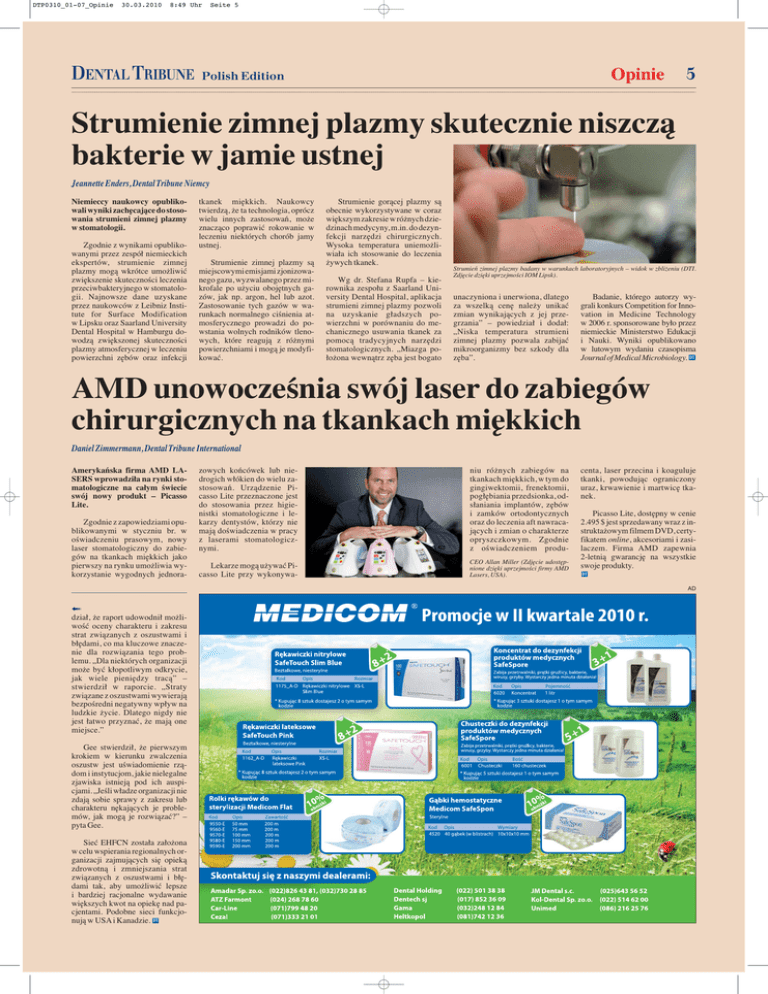 DTP0310_01-07_Opinie 30.03.2010 8:49 Uhr DENTAL TRIBUNE Seite 5 Opinie Polish Edition 5 Strumienie zimnej plazmy skutecznie niszczą bakterie w jamie ustnej Jeannette Enders, Dental Tribune Niemcy Niemieccy naukowcy opublikowali wyniki zachęcające do stosowania strumieni zimnej plazmy w stomatologii. Zgodnie z wynikami opublikowanymi przez zespół niemieckich ekspertów, strumienie zimnej plazmy mogą wkrótce umożliwić zwiększenie skuteczności leczenia przeciwbakteryjnego w stomatologii. Najnowsze dane uzyskane przez naukowców z Leibniz Institute for Surface Modification w Lipsku oraz Saarland University Dental Hospital w Hamburgu dowodzą zwiększonej skuteczności plazmy atmosferycznej w leczeniu powierzchni zębów oraz infekcji tkanek miękkich. Naukowcy twierdzą, że ta technologia, oprócz wielu innych zastosowań, może znacząco poprawić rokowanie w leczeniu niektórych chorób jamy ustnej. Strumienie zimnej plazmy są miejscowymi emisjami zjonizowanego gazu, wyzwalanego przez mikrofale po użyciu obojętnych gazów, jak np. argon, hel lub azot. Zastosowanie tych gazów w warunkach normalnego ciśnienia atmosferycznego prowadzi do powstania wolnych rodników tlenowych, które reagują z różnymi powierzchniami i mogą je modyfikować. Strumienie gorącej plazmy są obecnie wykorzystywane w coraz większym zakresie w różnych dziedzinach medycyny, m.in. do dezynfekcji narzędzi chirurgicznych. Wysoka temperatura uniemożliwiała ich stosowanie do leczenia żywych tkanek. Wg dr. Stefana Rupfa – kierownika zespołu z Saarland University Dental Hospital, aplikacja strumieni zimnej plazmy pozwoli na uzyskanie gładszych powierzchni w porównaniu do mechanicznego usuwania tkanek za pomocą tradycyjnych narzędzi stomatologicznych. „Miazga położona wewnątrz zęba jest bogato Strumień zimnej plazmy badany w warunkach laboratoryjnych – widok w zbliżeniu (DTI. Zdjęcie dzięki uprzejmości IOM Lipsk). unaczyniona i unerwiona, dlatego za wszelką cenę należy unikać zmian wynikających z jej przegrzania” – powiedział i dodał: „Niska temperatura strumieni zimnej plazmy pozwala zabijać mikroorganizmy bez szkody dla zęba”. Badanie, którego autorzy wygrali konkurs Competition for Innovation in Medicine Technology w 2006 r. sponsorowane było przez niemieckie Ministerstwo Edukacji i Nauki. Wyniki opublikowano w lutowym wydaniu czasopisma Journal of Medical Microbiology. DT AMD unowocześnia swój laser do zabiegów chirurgicznych na tkankach miękkich Daniel Zimmermann, Dental Tribune International Amerykańska firma AMD LASERS wprowadziła na rynki stomatologiczne na całym świecie swój nowy produkt – Picasso Lite. Zgodnie z zapowiedziami opublikowanymi w styczniu br. w oświadczeniu prasowym, nowy laser stomatologiczny do zabiegów na tkankach miękkich jako pierwszy na rynku umożliwia wykorzystanie wygodnych jednora- zowych końcówek lub niedrogich włókien do wielu zastosowań. Urządzenie Picasso Lite przeznaczone jest do stosowania przez higienistki stomatologiczne i lekarzy dentystów, którzy nie mają doświadczenia w pracy z laserami stomatologicznymi. niu różnych zabiegów na tkankach miękkich, w tym do gingiwektomii, frenektomii, pogłębiania przedsionka, odsłaniania implantów, zębów i zamków ortodontycznych oraz do leczenia aft nawracających i zmian o charakterze opryszczkowym. Zgodnie z oświadczeniem produ- Lekarze mogą używać Picasso Lite przy wykonywa- CEO Allan Miller (Zdjęcie udostępnione dzięki uprzejmości firmy AMD Lasers, USA). centa, laser przecina i koaguluje tkanki, powodując ograniczony uraz, krwawienie i martwicę tkanek. Picasso Lite, dostępny w cenie 2.495 $ jest sprzedawany wraz z instruktażowym filmem DVD, certyfikatem online, akcesoriami i zasilaczem. Firma AMD zapewnia 2-letnią gwarancję na wszystkie swoje produkty. DT AD ª dział, że raport udowodnił możliwość oceny charakteru i zakresu strat związanych z oszustwami i błędami, co ma kluczowe znaczenie dla rozwiązania tego problemu. „Dla niektórych organizacji może być kłopotliwym odkrycie, jak wiele pieniędzy tracą” – stwierdził w raporcie. „Straty związane z oszustwami wywierają bezpośredni negatywny wpływ na ludzkie życie. Dlatego nigdy nie jest łatwo przyznać, że mają one miejsce.” Gee stwierdził, że pierwszym krokiem w kierunku zwalczenia oszustw jest uświadomienie rządom i instytucjom, jakie nielegalne zjawiska istnieją pod ich auspicjami. „Jeśli władze organizacji nie zdają sobie sprawy z zakresu lub charakteru nękających je problemów, jak mogą je rozwiązać?” – pyta Gee. Sieć EHFCN została założona w celu wspierania regionalnych organizacji zajmujących się opieką zdrowotną i zmniejszania strat związanych z oszustwami i błędami tak, aby umożliwić lepsze i bardziej racjonalne wydawanie większych kwot na opiekę nad pacjentami. Podobne sieci funkcjonują w USA i Kanadzie. DT