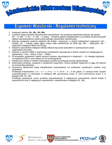 1. Kolejność startów: KL, ML, KA, MA. 2. Uczelnie mogą wystawić dowolną ilość zawodników. Do punktacji zespołowej wliczać się będzie: KA – 2, MA – 3, KL – 2 i ML – 2 osoby . Uczelnia będzie klasyfikowana w punktacji drużynowej jeśli będzie reprezentowana nawet przez jednego zawodnika/ zawodniczkę. 3. Zawody rozegrane zostaną odrębnie dla kobiet i mężczyzn, w dwóch kategoriach wagowych: KA – kobiety, KL – kobiety waga lekka (masa ciała zawodniczki do 61,5 kg); MA – mężczyźni, ML – mężczyźni kategoria lekka (do 75 kg). 4. Ważenie zawodników kategorii lekkiej odbywa się przed zawodami w wyznaczonym przez organizatora terminie. 5. Zawody w ramach AMW w ergometrze wioślarskim obywają się w dwóch rzutach na następujących dystansach: I rzut – 500m, II rzut – 1000m. 6. W przypadku uzyskania 2 takich samych czasów, decydujących o miejscach I – III, nastąpi dogrywka na dystansie 200 m oraz dalsze aż do rozstrzygnięcia. 7. Ostateczne zdanie w kwestii interpretacji wyników przysługuje komisji sędziowskiej. 8. Ewentualne protesty, związane z działaniem ergometru, można składać wyłącznie w ciągu 20 sekund po komendzie startowej. 9. Uczestnicy Mistrzostw będą klasyfikowani indywidualnie na podstawie uzyskanych czasów oraz zespołowo. Punktacja indywidualna: I m – n + 1, II m – n –1, III m – n – 2 itd. gdzie „n” oznacza ilość Uczelni uczestniczących w zawodach w kategorii MA pomnożoną przez 3, oraz pomnożoną przez 2 w kategorii KA, KL i ML. Punktacja zespołowa: suma punktów indywidualnych 3 najlepszych zawodników (wśród kobiet 2 zawodniczki) oraz 2 najlepszych zawodników i zawodniczek w kategorii KL i ML.