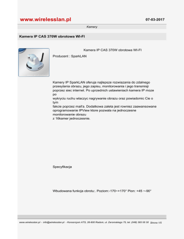 www.wirelesslan.pl 07-03-2017 Kamery Kamera IP CAS 370W obrotowa WI-FI Kamera IP CAS 370W obrotowa WI-FI Producent : SparkLAN Kamery IP SparkLAN oferuja najlepsze rozwiazania do zdalnego przesylania obrazu, jego zapisu, monitorowania i jego transmisji poprzez siec internet. Po uprzednich ustawieniach kamera IP moze po wykryciu ruchu wlaczyc nagrywanie obrazu oraz powiadomic Cie o tym fakcie poprzez mail'a. Dodatkowa zaleta jest rowniez zaawansowane oprogramowanie IPView ktore pozwala na jednoczesne monitorowanie obrazu z 16kamer jednoczesnie. Specyfikacja Wbudowana funkcja obrotu:. Poziom:-170~+170° Pion: +45 ~-90° www.wirelesslan.pl - [email protected] - Konsorcjum ATS, 26-600 Radom, ul. Zeromskiego 75, tel. (048) 383 00 30 Strona 1/5 www.wirelesslan.pl 07-03-2017 Typ Kompresji: MJPEG Czujnik: Kolor CMOS Czestotliwosc przechwytywania obrazu: QCIF@30fps,25fps@CIF, 10fps@VGA Minimalny poziom jasnosci: 2.5Lux. Obsluguje wykrycie ruchu Opis www.wirelesslan.pl - [email protected] - Konsorcjum ATS, 26-600 Radom, ul. Zeromskiego 75, tel. (048) 383 00 30 Strona 2/5 www.wirelesslan.pl 07-03-2017 - Prosta w uzyciu, po prostu podlacz kamere i ogladaj obraz z kamery IP poprzez siec i wlasciwy numer IP - Konfiguracja poprzez www z ochrona poprzez haslo -Zdalny dostep poprzez siec i przegladarke web dla ogladania obrazu na zywo - Obsluguje TCP/IP, SMTP e-mail, HTTP oraz inne powiazane protokoly internetowe - Wspolpracuje z platformami PC (Windows) oraz MAC - Doskonale oprogramowanie - IPView dla zapisu obrazu lub nagrywania sekwencji wideo. - Obsluguje ActiveX dla Internet Explorer oraz aplet Javy dla Internet Explorer i Netscape Navigator www.wirelesslan.pl - [email protected] - Konsorcjum ATS, 26-600 Radom, ul. Zeromskiego 75, tel. (048) 383 00 30 Strona 3/5 www.wirelesslan.pl 07-03-2017 - Doskonale narzedzie do monitorowania domow, biur, bankow, szpitali oraz wszelakich miejsc publicznych czy przemyslowych. - Zaimplementowano mechanizmy wykrywajace wlamywaczy lub "nieproszonych gosci" - automatycznie wlacza sie nagrywanie oraz jest wysylany mail pod podany adres mail. Obraz - Stopien kompresji: 5 poziomow, very low/low/medium/high/very high - Czestotliwosc klatek: 1/5/7/15/20/ Auto - Rozdzielczosc Video: 160x120/320x240 / 640x480 www.wirelesslan.pl - [email protected] - Konsorcjum ATS, 26-600 Radom, ul. Zeromskiego 75, tel. (048) 383 00 30 Strona 4/5 www.wirelesslan.pl 07-03-2017 - Ustawianie jasnosci: Tak - Ustawianie kontrastu: Tak - Zoom cyfrowy: 2x Gwarancja 2 lata www.wirelesslan.pl - [email protected] - Konsorcjum ATS, 26-600 Radom, ul. Zeromskiego 75, tel. (048) 383 00 30 Strona 5/5
