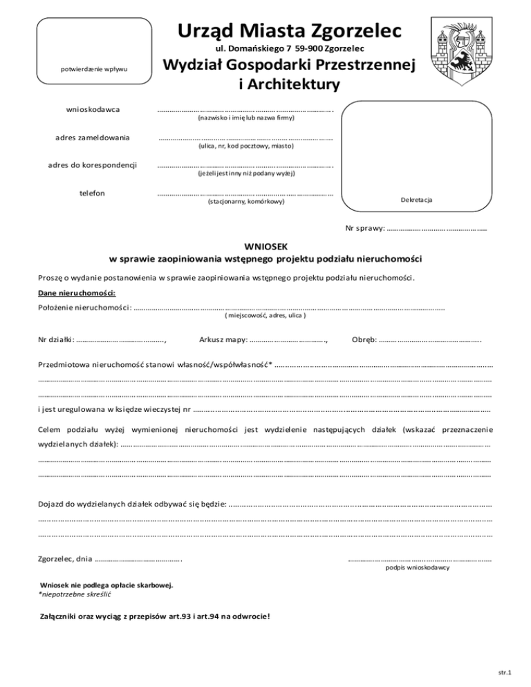 Urząd Miasta Zgorzelec ul. Domańskiego 7 59-900 Zgorzelec potwierdzenie wpływu wnioskodawca Wydział Gospodarki Przestrzennej i Architektury …………………………………………….……………………………. (nazwisko i imię lub nazwa firmy) adres zameldowania …………………………………………….…..………………………. (ulica, nr, kod pocztowy, miasto) adres do korespondencji ………………………………………………….………………………. (jeżeli jest inny niż podany wyżej) telefon ………………………………………………………..………………… (stacjonarny, komórkowy) Dekretacja Nr sprawy: ………..……………………………….. WNIOSEK w sprawie zaopiniowania wstępnego projektu podziału nieruchomości Proszę o wydanie postanowienia w sprawie zaopiniowania wstępnego projektu podziału nieruchomości. Dane nieruchomości: Położenie nieruchomości: …………………………………………………………………………………………………………………………………….. ( miejscowość, adres, ulica ) Nr działki: ……………………………………., Arkusz mapy: ………………………………., Obręb: ………………………………………….. Przedmiotowa nieruchomość stanowi własność/współwłasność* ...........................………………………………………………………………..… ……………………………………………………………………………………………………………………………………………………………………………………..…………… ……………………………………………………………………………………………………………………………………………………………………………………..…………… i jest uregulowana w księdze wieczystej nr ..................................................................................................................……………….. Celem podziału wyżej wymienionej nieruchomości jest wydzielenie następujących działek (wskazać przeznaczenie wydzielanych działek): ………………….……………………………………………………………………………………………………………………………..…………… ……………………………………………………………………………………………………………………………………………………………………………………..…………… ……………………………………………………………………………………………………………………………………………………………………………………..…………… Dojazd do wydzielanych działek odbywać się będzie: ..................................................................................................................... .......................................................................................................................................................................................................... .......................................................................................................................................................................................................... Zgorzelec, dnia ……………………………………. …………….…………………..……………………….… podpis wnioskodawcy Wniosek nie podlega opłacie skarbowej. *niepotrzebne skreślić Załączniki oraz wyciąg z przepisów art.93 i art.94 na odwrocie! str.1 Załączniki: Aktualny oryginał odpisu z księgi wieczystej dla dzielonej nieruchomości. Wypis z rejestru gruntów. Kopia mapy ewidencyjnej. Wstępny projekt podziału (…......egz.) - minimum 3 egz. Pozwolenie wojewódzkiego konserwatora zabytków w przypadku nieruchomości wpisanej do rejestru zabytków. Opinia rzeczoznawcy ds. zabezpieczeń przeciwpożarowych wraz z rzutami poszczególnych kondygnacji dzielonego obiektu budowlanego, na których przedstawiono przebieg projektowanej granicy. Inne (wymienić): ............................................................................................................................................... Wyciąg z przepisów Ust awy z dnia 21 sierpnia 1997 roku o gospodarce nieruchomościami (t.j. Dz.U. z 2010r. nr 102 poz. 651 późniejszym i zmianami): Art. 93. 1. Podzia łu nieruchomoś ci można dokona ć, jeżeli jest on zgodny z ustaleniami planu miejs cowego. W ra zie bra ku tego planu stosuje się przepis y a rt. 94. 2. Zgodnoś ć z ustaleniami planu w myśl us t. 1 dotyczy za równo przezna czenia terenu, jak i możliwoś ci zagospoda rowania wydziel onych dzia łek gruntu. 2a . Podzia ł nieruchomoś ci położonych na obsza ra ch przeznaczonych w planach miejscowych na cele rolne i leśne, a w przypadku b raku planu miejs cowego wykorzys tywanych na cele rol ne i leśne, powodujący wydzielenie działki gruntu o powierzchni mniejs zej ni ż 0,3000 ha, jes t dopuszczalny, pod wa runkiem że dzia łka ta zostanie przezna czona na powi ęks zenie sąsiedniej nieruchomoś ci lub dokonana zo stanie regula cja grani c między sąsiadującymi nieruchomoś ciami . W decyzji za twierdzającej podział nieruchomoś ci o kreśla si ę termin na przeniesienie praw do wydzielonych działek gruntu, który nie może być dłużs zy ni ż 6 miesięcy od dnia, w którym decyzja za twie rdza jąca podział nieruchomoś ci s ta ła si ę osta teczna . Przepisu nie s tosuje się w przypadku podziałów nieruchomoś ci, o których mowa w a rt. 95. 3. Podział nieruchomoś ci nie jest dopuszczalny, jeżeli projektowane do wydzielenia działki gruntu nie ma ją dos tępu do drogi p ubli cznej; za dostęp do drogi publicznej uwa ża się również wydzielenie dro