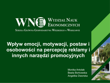 Wpływ emocji, motywacji, postaw i osobowości na percepcję reklamy i innych narzędzi promocyjnych Monika Antolak Beata Borkowska Angelika Dworska Plan prezentacji 1. Definicje percepcji. 2. Etapy oddziaływania reklamy. 3. Emocje w reklamie. 4. 5. 6. 7. a) Rodzaje emocji pozytywnych b) Rodzaje emocji negatywnych Motywacja w reklamie. a) Potrzeby b) Typy motywacji Postawy w reklamie. a) Funkcje postaw b) Rodzaje postaw Osobowość w reklamie. a) Teorie osobowości b) Typy osobowości Bibliografia. Jak rozumiecie pojęcie „percepcja reklamy” ? Definicja • Psychologiczny proces reakcji człowieka na odebrane informacje otoczenia. • Rozumienie bądź pogląd, jaki ludzie mają o rzeczach znajdujących się w ich otoczeniu. • Subiektywne odzwierciedlanie przez człowieka przedmiotów, zjawisk i procesów znajdujących się w jego otoczeniu. Etapy oddziaływania reklamy Etapy oddziaływania reklamy 1. Tworzenie świadomości produktu, firmy lub marki. 2. Wzbudzanie zainteresowania produktem, firmą lub marką. 3. Wzbudzanie pożądania oferty. 4. Wywoływanie oczekiwanej reakcji (np. zakupu). Emocje w reklamie Emocje • Badania nad zachowaniami konsumenckimi dowodzą, że ludzie podczas oglądania reklam doświadczają szerokiej gamy emocji. • Najważniejsze z nich to: radość, zainteresowanie, zaskoczenie, zmartwienie, gniew, pogarda, wstręt, lęk, wina i wstyd. Rodzaje emocji 1. Emocje pozytywne 2. Emocje negatywne. Emocje pozytywne • Klient czuje się bardziej wartościowy • Przeniesienie w świat marzeń • Towarzyszące uczucia: szczęście, radość czy zadowolenie Rodzaje emocji pozytywnych 1. Metoda „przed i po”. 2. Dziecko w reklamie. 3. Humor. 4. Chęć wyróżnienia się, bycia lepszym od innych. 5. Emocje związane ze zwycięstwem, rywalizacją. 6. Reklama wykorzystująca emocje związane z seksualnością. Metoda „przed i po” • Porównanie dwu przeciwstawnych sobie sytuacji, w których mogą znaleźć się potencjalni klienci. • Wykorzystanie wizerunku aktorów, muzyków, sportowców. Dziecko w reklamie • Klient łatwiej zapamiętuje obraz oraz reklamowany produkt. • Towarzyszące odczucia: tkliwość czy rozczulenie u osób dorosłych. Humor „Reklamy nieestetycznej i bez humoru nie można w żadnym wypadku uznać za zbrodnię, grozi jej coś gorszego, nie zostanie zauważona” Chęć wyróżnienia się, bycia lepszym od innych Nakierowane na dwa rodzaje osób: • osoby z niższym poczuciem własnej wartości, • osoby za wszelką cenę dążącym do wyróżnienia się z tłumu. Emocje związane ze zwycięstwem, rywalizacją Reklama wykorzystująca emocje związane z seksualnością • Cel: przyciągnięcie wzroku płci męskiej na dany produkt. Rodzaje emocji negatywnych 1. Strach, uprzedzenia. 2. Szok, kontrowersja. 3. Wina, wstyd. Strach, uprzedzenia • Zrozumienie problemu klienta. • Oferta pomocy w walce z nim, np. walka ze szkodnikami. Szok, kontrowersja • Używane w reklamach społecznych. • Zwrócenie uwagi na konkretny problem. Wina, wstyd • Emocje szczególnie dotkliwe dla człowieka Motywacja w reklamie Motywacja • Zespół procesów inicjowania określonych działań, prowadzące do osiągnięcia wyznaczonego celu. • Bodźce uruchamiające motywację konsumenta: • Potrzeby (motywy) • Aspiracje • Życzenia • Inne Potrzeby - motywy Potrzeby fizjologiczne Przykłady produktów: podstawowe produkty żywnościowe, lekarstwa, woda Potrzeby bezpieczeństwa Przykłady produktów: polisy ubezpieczeniowe, systemy alarmowe, ochrona Potrzeby przynależności Przykłady produktów: ubrania, słodycze, napoje Potrzeby szacunku Przykłady produktów: samochód, obrazy, biżuteria, karty kredytowe, meble Potrzeby samorealizacji Przykłady produktów: podróże, hobby, kursy doszkalające Typy motywacji konsumenckiej 1. Motywacja do uzyskania optymalnego poziomu stymulacji. 2. Motywacja utylitarna. 3. Motywacja hedonistyczna. 4. Motywacja wolności behawioralnej. 5. Motywacja do unikania ryzyka. 6. Motywacja do wyjaśniania przyczyn zjawisk. Motywacja do uzyskania optymalnego poziomu stymulacji • Czynnik motywujący: uzyskanie optymalnego poziomu stymulacji. • Poziom optymalnej stymulacji: • Niski – osoby preferują zakupy o niskim poziomie ryzyka, wybierają sprawdzone marki. • Wysoki – szybko się nudzą pod wpływem monotonnych bodźców. Motywacja utylitarna • Dążenie do osiągnięcia celów praktycznych, korzyści i wygód. • Nabywanie produktów w sposób zamierzony i efektywny. • Kupowanie = praca umysłowa. Motywacja hedonistyczna • Przeżywanie przyjemnych emocji za pomocą zmysłów. • Potrzeba używania produktów i usług do zaspokojenia wizji, fantazji. Motywacja wolności behawioralnej • Wolny wybór przez konsumenta produktów. • Zagrożenia wolności wyboru: • Zagrożenie społeczne – nacisk innych ludzi na zakup danego produktu • Zagrożenie bezosobowe – bariery wynikające z niewystarczającej ilości produktu Motywacja do unikania ryzyka • Unikanie decyzji zakupowych, które zawierają zbyt duże ryzyko. • Przykłady: kupno samochodu. Motywacja do wyjaśniania przyczyn zjawisk • Szukanie przyczyn zjawisk zachodzących w reklamach. • „Czy znana aktorka reklamuje produkt, bo naprawdę go lubi czy tylko dlatego, że jej za to płacą?” Postawy w reklamie Postawa • Wyuczona predyspozycja do zachowania w sposób zgodny z przekonaniami • Źródło sympatii lub antypatii do określonych przedmiotów, ludzi, grup sytuacji • Ocena przedmiotu w kategoriach jego wartości Funkcje postaw konsumentów • Praktyczne • Obronne • Wartościujące • Poznawcze Funkcje postaw konsumenta • praktyczna - przedstawianie korzyści z produktu lub możliwość uniknięcia przykrych konsekwencji za pomocą produktu • obronna - ochrona konsumenta przed zagrożeniami zewnętrznymi bądź wewnętrznymi (kompleksy, uprzedzenia) • wartościujące – pomagają wyrazić