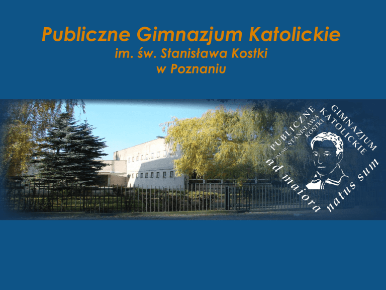 Publiczne Gimnazjum Katolickie im. św. Stanisława Kostki w Poznaniu SZKOŁA NA DZIEŃ DZISIEJSZY www.dobregimnazjum.pl ul. Kanclerska 31, 61-327 Poznań tel/fax 0048 61 66 22 429 285 uczniów/35 nauczycieli 11 oddziałów klasowych (w każdym roczniku jedna lub dwie klasy z poszerzonym językiem angielskim – 5 godzin tygodniowo) 15 sal lekcyjnych - w tym jedna pracownia informatyczna z 12 stanowiskami - jedna pracownia informatyczno – językowa 16 stanowisk - w każdej sali: komputer z dostępem do Internetu projektor z ekranem magnetofon wyremontowana sala gimnastyczna i stołówka nowoczesne szatnie z natryskami biblioteka wyposażona w dwa stanowiska komputerowe pokój nauczycielski wyposażony w dwa stanowiska komputerowe tablice multimedialne w 9 salach dziennik elektroniczny elektroniczny system zarządzania informacją jednolity strój szkolny www.dobregimnazjum.pl ul. Kanclerska 31, 61-327 Poznań tel/fax 0048 61 66 22 429 NASZA SZKOŁA TO KATOLICKOŚĆ • wychowujemy w oparciu o zasady personalizmu chrześcijańskiego; DOBRA ATMOSFERA NOWOCZESNOŚĆ • tablice interaktywne • sprzęt komputerowy w każdej sali, • e- dziennik; PROFESJONALIZM • doskonale przygotowana kadra nauczycielska • wysoki poziom nauczania – finaliści konkursów przedmiotowych • dobre przygotowanie do testów, nasi absolwenci dostają się do najlepszych poznańskich liceów; SZEROKA OFERTA ZAJĘĆ POZALEKCYJNYCH ponad 30 kół zainteresowań (naukowych, językowych i artystycznych), m.in.: • Dyskusyjny Klub Polityczny, Dyskusyjny Klub Filmowy, Caritas, • Koło Teatralne, Koło Plastyczne • Zespół Muzyczny, Zespół Instrumentalny • Koło Miłośników Tolkiena • Piłka Nożna, Koszykówka, Siatkówka PROJEKTY: międzynarodowe - Wielowyznaniowe Oblicze Europy muzealne/ językowe historyczne: Z Grecją Starożytną na TY Polska Szlachecka • innowacje pedagogiczne np.: Dziedzictwo Europy Środkowej Szkoła w Muzeum; LICZNE SUKCESY SPORTOWE m.in. Mistrz Poznania w Halowej Piłce Nożnej, II miejsce w punktacji całorocznej Szkół Gimnazjalnych Poznań Grunwald Południe; ZORGANIZOWANE WYJŚCIA do muzeów, teatrów, kin; WYCIECZKI KRAJOWE I ZAGRANICZNE (Kraków, Gdańsk, Mazury, Kotlina Kłodzka) (Paryż, Londyn, Berlin, Praga, Rzym); WYJAZDY PROJEKTOWE (Anglia, Grecja) WYJAZDY INTEGRACYJNE DLA UCZNIÓW KLAS I LEKCJE www.dobregimnazjum.pl ul. Kanclerska 31, 61-327 Poznań tel/fax 0048 61 66 22 429 LEKCJE INFORMATYKI p. wicedyrektor Agata Maćkowiak www.dobregimnazjum.pl ul. Kanclerska 31, 61-327 Poznań tel/fax 0048 61 66 22 429 LEKCJE RELIGII obecnie uczą: ks. diakon Damian Wachowiak ks. diakon Paweł Szkoda ks. dyrektor Piotr Kuś www.dobregimnazjum.pl ul. Kanclerska 31, 61-327 Poznań tel/fax 0048 61 66 22 429 LEKCJE JĘZYKA POLSKIEGO u pani Katarzyny Błajet www.dobregimnazjum.pl ul. Kanclerska 31, 61-327 Poznań tel/fax 0048 61 66 22 429 LEKCJE JĘZYKA POLSKIEGO p. Ewa Zawieja języka polskiego uczą u nas również pani Marta Gołkowska i Joanna Tritt www.dobregimnazjum.pl ul. Kanclerska 31, 61-327 Poznań tel/fax 0048 61 66 22 429 LEKCJE JĘZYKA ANGIELSKIEGO u p. wicedyrektor Katarzyny Lisieckiej uczą również: pani Anna Nowaczyk, Agnieszka Weydmann i Małgorzata Andryszak www.dobregimnazjum.pl ul. Kanclerska 31, 61-327 Poznań tel/fax 0048 61 66 22 429 LEKCJA WOS-u p. Maria Pacholska www.dobregimnazjum.pl ul. Kanclerska 31, 61-327 Poznań tel/fax 0048 61 66 22 429 LEKCJA HISTORII p. Anna Bielawska www.dobregimnazjum.pl ul. Kanclerska 31, 61-327 Poznań tel/fax 0048 61 66 22 429 LEKCJA CHEMII p. Barbara Guzek www.dobregimnazjum.pl ul. Kanclerska 31, 61-327 Poznań tel/fax 0048 61 66 22 429 LEKCJA WYCHOWANIA FIZYCZNEGO p. Jan Tasiemski – Pituła uczą także panowie: Janusz Pituła oraz Grzegorz Płończak www.dobregimnazjum.pl ul. Kanclerska 31, 61-327 Poznań tel/fax 0048 61 66 22 429 GABINET PEDAGOGA pracują w nim: pan pedagog Marcin Nowak oraz ks. psycholog Przemysław Przybylski www.dobregimnazjum.pl ul. Kanclerska 31, 61-327 Poznań tel/fax 0048 61 66 22 429 POKÓJ NAUCZYCIELSKI www.dobregimnazjum.pl ul. Kanclerska 31, 61-327 Poznań tel/fax 0048 61 66 22 429 BIBLIOTEKA p. Marianna Kieliszewska www.dobregimnazjum.pl ul. Kanclerska 31, 61-327 Poznań tel/fax 0048 61 66 22 429 KORYTARZ www.dobregimnazjum.pl ul. Kanclerska 31, 61-327 Poznań tel/fax 0048 61 66 22 429 ks. dyrektor Piotr Kuś DYREKCJA SZKOŁY wicedyrektor Katarzyna Lisiecka wicedyrektor Agata Maćkowiak www.dobregimnazjum.pl ul. Kanclerska 31, 61-327 Poznań tel/fax 0048 61 66 22 429 STRÓJ SZKOLNY www.dobregimnazjum.pl ul. Kanclerska 31, 61-327 Poznań tel/fax 0048 61 66 22 429 www.dobregimnazjum.pl ul. Kanclerska 31, 61-327 Poznań tel/fax 0048 61 66 22 429 PRZERWY www.dobregimnazjum.pl ul. Kanclerska 31, 61-327 Poznań tel/fax 0048 61 66 22 429 NA KORYTARZU SZKOLNYM www.dobregimnazjum.pl ul. Kanclerska 31, 61-327 Poznań tel/fax 0048 61 66 22 429 DUŻA PRZERWA NA BOISKU SZKOLNYM www.dobregimnazjum.pl ul. Kanclerska 31, 61-327 Poznań tel/fax 0048 61 66 22 429 STOŁÓWKA www.dobregimnazjum.pl ul. Kanclerska 31, 61-327 Poznań tel/fax 0048 61 66 22 429 UROCZYSTOŚCI www.dobregimnazjum.pl ul. Kanclerska 31, 61-327 Poznań tel/fax 0048 61 66 22 429 UROCZYSTA INAUGURACJA ROKU SZKOLNEGO ORAZ DZIEŃ PATRONA www.dobregimnazjum.pl ul. Kanclerska 31, 61-327 Poznań tel/fax 0048 61 66 22 429 OTRZĘSINY KLAS PIERWSZYCH 2009 2011 2012 2010 www.dobregimnazjum.pl ul. Kanclerska 31, 61-327 Poznań tel/fax 0048 61 66 22 429 BAL ABSOWENTÓW www.dobregimnazjum.pl ul. Kanclerska 31, 61-327 Poznań tel/fax 0048 61 66 22 429 WYJAZD KLAS TRZECICH DO CZĘSTOCHOWY DOROCZNA PIELGRZYMKA DZIĘKCZYNNA www.dobregimnazjum.pl ul. Kanclerska 31, 61-327 Poznań tel/fax 0048 61 66 22 429 KOSTKI ŚWIĘTEGO STANISŁAWA www.dobregimnazjum.pl ul. Kanclerska 31, 61-327 Poznań tel/fax 0048 61 66 22 429 UROCZYSTE ZAKOŃCZENIE SZKOŁY w 2010 roku 24 uczniów klas trzecich otrzymało świadectwa z wyróżnieniem (30%) w 2011 i 12 roku 27