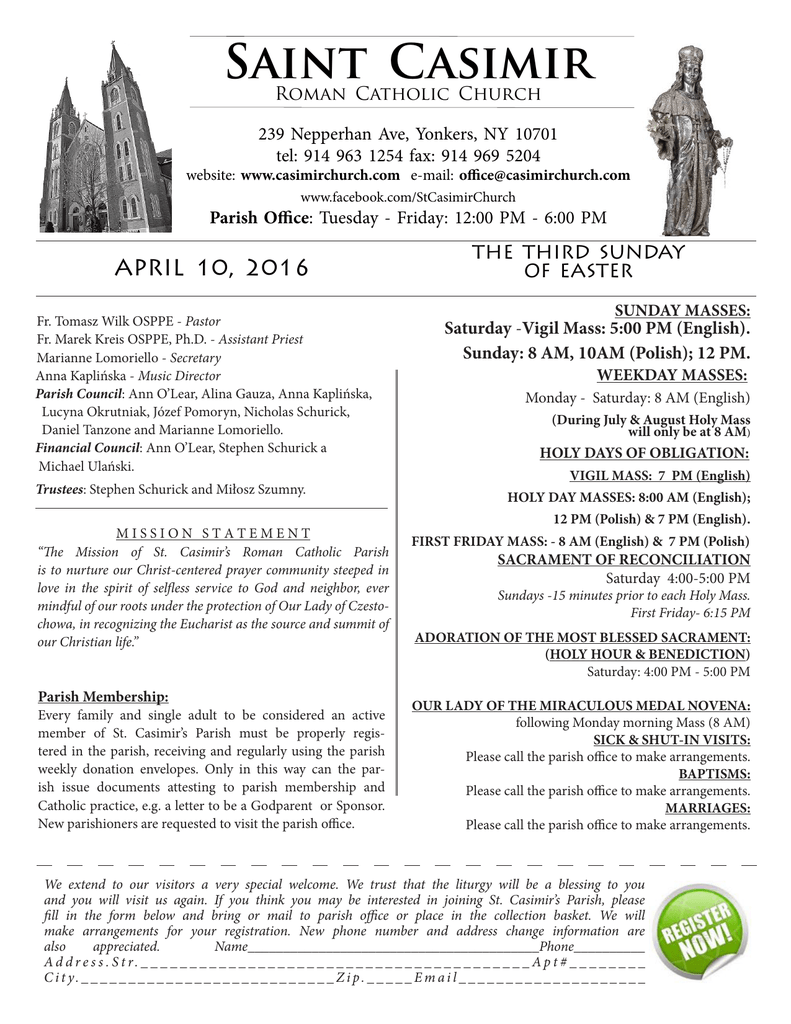 Saint Casimir Roman Catholic Church 239 Nepperhan Ave, Yonkers, NY 10701 tel: 914 963 1254 fax: 914 969 5204 website: www.casimirchurch.com e-mail: [email protected] www.facebook.com/StCasimirChurch Parish Office: Tuesday - Friday: 12:00 PM - 6:00 PM APRIL 10, 2016 Fr. Tomasz Wilk OSPPE - Pastor Fr. Marek Kreis OSPPE, Ph.D. - Assistant Priest Marianne Lomoriello - Secretary Anna Kaplińska - Music Director Parish Council: Ann O’Lear, Alina Gauza, Anna Kaplińska, Lucyna Okrutniak, Józef Pomoryn, Nicholas Schurick, Daniel Tanzone and Marianne Lomoriello. Financial Council: Ann O’Lear, Stephen Schurick a Michael Ulański. Trustees: Stephen Schurick and Miłosz Szumny. MISSION STATEMENT “The Mission of St. Casimir’s Roman Catholic Parish is to nurture our Christ-centered prayer community steeped in love in the spirit of selfless service to God and neighbor, ever mindful of our roots under the protection of Our Lady of Czestochowa, in recognizing the Eucharist as the source and summit of our Christian life.” Parish Membership: Every family and single adult to be considered an active member of St. Casimir’s Parish must be properly registered in the parish, receiving and regularly using the parish weekly donation envelopes. Only in this way can the parish issue documents attesting to parish membership and Catholic practice, e.g. a letter to be a Godparent or Sponsor. New parishioners are requested to visit the parish office. THE THIRD SUNDAY OF EASTER SUNDAY MASSES: Saturday -Vigil Mass: 5:00 PM (English). Sunday: 8 AM, 10AM (Polish); 12 PM. WEEKDAY MASSES: Monday - Saturday: 8 AM (English) (During July & August Holy Mass will only be at 8 AM) HOLY DAYS OF OBLIGATION: VIGIL MASS: 7 PM (English) HOLY DAY MASSES: 8:00 AM (English); 12 PM (Polish) & 7 PM (English). FIRST FRIDAY MASS: - 8 AM (English) & 7 PM (Polish) SACRAMENT OF RECONCILIATION Saturday 4:00-5:00 PM Sundays -15 minutes prior to each Holy Mass. First Friday- 6:15 PM ADORATION OF THE MOST BLESSED SACRAMENT: (HOLY HOUR & BENEDICTION) Saturday: 4:00 PM - 5:00 PM OUR LADY OF THE MIRACULOUS MEDAL NOVENA: following Monday morning Mass (8 AM) SICK & SHUT-IN VISITS: Please call the parish office to make arrangements. BAPTISMS: Please call the parish office to make arrangements. MARRIAGES: Please call the parish office to make arrangements. We extend to our visitors a very special welcome. We trust that the liturgy will be a blessing to you and you will visit us again. If you think you may be interested in joining St. Casimir’s Parish, please fill in the form below and bring or mail to parish office or place in the collection basket. We will make arrangements for your registration. New phone number and address change information are also appreciated. Name_________________________________________Phone__________ A d d r e s s . S t r. _ _ _ _ _ _ _ _ _ _ _ _ _ _ _ _ _ _ _ _ _ _ _ _ _ _ _ _ _ _ _ _ _ _ _ _ _ _ _ _ A p t # _ _ _ _ _ _ _ _ C i t y. _ _ _ _ _ _ _ _ _ _ _ _ _ _ _ _ _ _ _ _ _ _ _ _ _ _ _ Z i p. _ _ _ _ _ E m a i l _ _ _ _ _ _ _ _ _ _ _ _ _ _ _ _ _ _ _ _ THE THIRD SUNDAY OF EASTER MASS INTENTIONS FOR THE WEEK THE THIRD SUNDAY OF EASTER 8:00 A.M. - All Living & Deceased Parishioners. 10:00 A.M. + St. Jan Paweł II i St. John XXIII On the Second Anniversary of Their Canonization Od: Marian Baker. 12:00 P. M. - God’s Blessings & Good Health Upon Jennifer Soberman By: Ms. Mary Mazzeo. 4/10/16 MONDAY St. Stanislaus, Bishop & Martyr 7:00 A.M. + Grażyna Dominik 8:00 A.M. + Frances A. Badamo By: The Zieliński Family. 4/11/16 SAINT CASIMIR CHURCH ********************************************** SANCTUARY LAMP April 10th to April 17th, 2016 IN LOVING MEMORY OF PARENTS BY: CHILDREN ****************************************************************** SECOND SUNDAY OF EASTER SUNDAY, APRIL 3, 2016 SATURDAY, APRIL 2, 2016 ATTENDANCE: ; ATTENDANCE: ; ATTENDANCE: ; TUESDAY 4/12/16 7:00 A.M. + All Decxeased Members of The Kwiatkowski, Siuta & Zakrajsek Family By: Celeste A. Zack. 8:00 A.M. God’s blessing and good health upon Barbara WEDNESDAY St. Martin I, Pope & Martyr 7:00 A.M. Dantis 8:00 A.M. Dantis 4/13/16 THURSDAY 7:00 A.M. Dantis 8:00 A M. Dantis 4/14/16 FRIDAY 7:00 A.M. Dantis 8:00 AM. + Helena Jankowska Od: Mama, Anna Jankowska. 4/15/16 SATURDAY 4/16/16 8:00 A.M. - God’s Blessings & Happy Birthday Upon Rev. Marek Kreis OSPPE, PhD. By: Christina Koo. 4:00 P.M. CONFESSIONS (Polish & English). 4:00 P.M. HOLY HOUR (Private Adoration with the Exposition of the Blessed Sacrament. 5:00 P. M. + Edward & Mary Fila By: Daughter, Elaine. THE FOURTH SUNDAY OF EASTER 8:00 A.M. - All Living & Deceased Parishioners. 10:00 A.M. + Helen Ann Jankowska (XV) Od: Siostra, Eva & Stanley Nowak. 12:00 P. M. Viapiana. APRIL10, 2016 4/17/16 WE EXTEND A SINCERE INVITATION AND HEARTFELT WELCOME TO ALL CATHOLICS (FAMILIES and INDIVIDUALS) WHO WOULD LIKE TO COME AND WORSHIP WITH OUR PARISH COMMUNITY FOR THE HONOR, PRAISE & GLORY OF OUR ALMIGHTY SAVIOR. ANYONE WISHING TO REGISTER AS A PARISHIONER OF OUR CHURCH, WE ENCOURAGE YOU TO DO SO BY COMPLETING THE LOWER PORTION OF THE FRONT COVER OF OUR BULLETIN AND LEAVING YOUR INFORMATION WITH ONE OF OUR USHERS OR AT OUR RECTORY. PLEASE NOTE: MASS Intentions listed in our Bulletin denoted as “DANTIS” are NOT WITHOUT INTENTIONS and, therefore, CANNOT BE BOOKED for an intention once they are listed as DANTIS. However, ALL MASS Intentions; which are left BLANK in the Bulletin; may be REQUESTED by the faithful for personal Intentions. Please contact the Rectory and we will gladly assist you in fulfilling all Mass Intention requests. ATTENDANCE: ; MASS AT 5:00 P.M. COLLECTION: $ N/A SUNDAY, APRIL 3, 2016 MASS AT 8:00 A.M. COLLECTION: $ N/A MASS AT 10:00 A.M. COLLECTION: $ N/A MASS AT 12:00 P. M. COLLECTION: $ N/A MASS AT 3:00 P.M. TOTAL ATTENDANCE: ; COLLECTION: N/A CHURCH REPAIR & MAINTENANCE FUND: N/A *************************************************************** THE THIRD SUNDAY OF EASTER JESUS appears to se