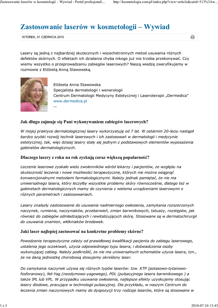Zastosowanie laserów w kosmetologii – Wywiad - Portal profesjonali... 1z3 http://kosmetologia.com.pl/index.php?view=article&catid=313%3Aw... Zastosowanie laserów w kosmetologii – Wywiad WTOREK, 01 CZERWCA 2010 Lasery są jedną z najbardziej skutecznych i wszechstronnych metod usuwania różnych defektów skórnych. O efektach ich działania chyba nikogo już nie trzeba przekonywać. Czy wiemy wszystko o przeprowadzaniu zabiegów laserowych? Naszą wiedzę zweryfikujemy w rozmowie z Elżbietą Anną Stawowską. Elżbieta Anna Stawowska Specjalista dermatologii i wenerologii Centrum Dermatologii Medycyny Estetycznej i Laseroterapii „Dermedica” www.dermedica.pl -- Jak długo zajmuje się Pani wykonywaniem zabiegów laserowych? W mojej praktyce dermatologicznej lasery wykorzystuję od 7 lat. W ostatnim 20-leciu nastąpił bardzo szybki rozwój technik laserowych i ich zastosowań w dermatologii i medycynie estetycznej, tak, więc dzisiaj lasery stały się jednym z podstawowych elementów wyposażenia gabinetów dermatologicznych. Dlaczego lasery z roku na rok zyskują coraz większą popularność? Leczenie laserowe zyskało wielu zwolenników wśród lekarzy i pacjentów, ze względu na skuteczność leczenia i nowe możliwości terapeutyczne, których nie można osiągnąć konwencjonalnymi metodami farmakologicznymi. Należy jednak pamiętać, że nie ma uniwersalnego lasera, który leczyłby wszystkie problemy skóry równocześnie, dlatego też w gabinetach dermatologicznych mamy do czynienia z wieloma urządzeniami laserowymi o różnych parametrach i zastosowaniach. Lasery znalazły zastosowanie do usuwania nadmiernego owłosienia, zamykania rozszerzonych naczynek, rumienia, naczyniaków, przebarwień, zmian barwnikowych, tatuaży, rozstępów, jak również do zabiegów odmładzających i rewitalizujących skórę. Stosowane są w dermatochirurgii do usuwania znamion, włókniaków brodawek. Jaki laser najlepiej zastosować na konkretne problemy skórne? Powodzenie terapeutyczne zależy od prawidłowej kwalifikacji pacjenta do zabiegu laserowego, ustalenia jego oczekiwań, użycia odpowiedniego typu lasera, i doświadczenia osoby wykonującej zabieg. Należy podkreślić, że nie ma uniwersalnych schematów użycia lasera, tzn., że na daną jednostkę chorobową stosujemy określony laser. Do zamykania naczynek używa się różnych typów laserów: tzw. KTP (potasowo-tytanowofosforanowy), Nd-Yag (neodymowo-yagowego), PDL (pulsacyjnego lasera barwnikowego ) a także IPL lub VPL. W przypadku usuwania owłosienia, najlepsze efekty uzyskujemy stosując lasery diodowe, pracujące w technologii pulsacyjnej. Dla przykładu, w naszym Centrum do leczenia zmian naczyniowych mamy do dyspozycji trzy rodzaje laserów, które są stosowane w 2010-07-24 13:43 Zastosowanie laserów w kosmetologii – Wywiad - Portal profesjonali... 2z3 http://kosmetologia.com.pl/index.php?view=article&catid=313%3Aw... zależności od potrzeb. Posiadanie różnych typów laserów umożliwia uzyskanie zadawalających efektów. Kto może wykonywać zabiegi laserowe? Lasery stosowane w dermatologii i medycynie estetyczne są urządzeniami medycznymi i powinny być obsługiwane przez lekarzy, bądź prze przeszkolony personel pod nadzorem lekarza. Osoby stosujące terapię laserowa muszą posiadać wiedzę i umiejętności w zakresie techniki zabiegowej, diagnozy i kwalifikowania pacjentów do zabiegów laserowych, powinni znać i rozumieć względne korzyści i ograniczenia stosowania zabiegów laserowych, a także skuteczność leczenia przy użyciu innych, bardziej tradycyjnych metod leczenia. Brak odpowiedniej wiedzy i umiejętności u personelu wykonującego zabiegi laserowe, skutkować może, brakiem efektów terapeutycznych, a nawet pojawieniem się poważnych powikłań pozabiegowych. W jakich warunkach kosmetolog może obsługiwać laser? Należy rozgraniczyć lasery kosmetyczne, biostymulujące i medyczne. Urządzenia medyczne przynoszą najlepsze efekty terapeutyczne, ale używanie ich, może być związane z wystąpieniem powikłań, dlatego też powinny być używane tylko przez przeszkolonych lekarzy lub pod ich ścisłym nadzorem. Jakie są przeciwwskazania do stosowania zabiegów laserowych? Przeciwwskazaniem do zabiegów laserowy są zmiany zapalne na skórze - bakteryjne, wirusowe, alergiczne, skłonność do bliznowców, fotoalergie, stosowanie leków uwrażliwiających skórę na światło, ciąża, opalenizna. Jakie są powikłania laserotrapii i czym są one najczęściej spowodowane? Powikłania po zastosowaniu terapii laserowej wynikają najczęściej z niewłaściwej techniki wykonania zabiegu, doboru nieodpowiednich parametrów. Bardzo ważna jest prawidłowa kwalifikacja pacjenta do zabiegu, doświadczenie lekarzy wykonujących zabiegi i właściwe postępowanie pozabiegowe. Powikłana występują bardzo rzadko i mogą być związane z uszkodzeniem skóry. Może dojść do wystąpienia pęcherzy, strupów, blizn i bliznowców. Pojawienia się odbarwień i przebarwień skóry głownie u osób opalonych i z wysokim fototypem skóry, które nie stosują fotoprotekcji i nie chronią się od słońca po zabiegu. Należy również mieć na uwadze możliwość wystąpienia reakcji alergicznych, infekcjach bakteryjnych, wirusowych, grzybiczych. Jak wygląda okres rekonwalescencji i stosowanie się pacjentów do zaleceń? Okres rekonwalescencji jest cechą indywidualną każdego pacjenta, zależy od rodzaju zastosowanego lasera i techniki zabiegowej. Zabiegi laserowe z naruszeniem ciągłości tkanek wymagają dłuższego okresu rekonwalescencji, oraz częstszej i wnikliwszej obserwacji pozabiegowej Ważnym elementem laseroterapii jest dokładne poinformowanie pacjenta o postępowaniu pozabiegowym. Pacjenci z reguły bardzo dokładnie wykonują zalecenia lekarskie, w związku z tym okres rekonwalescencji przebiega prawidłowo i bez powikłań. Jakie substancje należy stosować po zabiegac