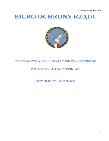 Załącznik Nr 1c do SIWZ BIURO OCHRONY RZĄDU PODSTAWOWE WYMAGANIA TECHNICZNO-UśYTKOWE OBUWIE SPECJALNE TROPIKOWE Nr ewidencyjny – 75/BOR/2010 1 SPIS TREŚCI. 1. Rysunek poglądowy wyrobu. 3 2. Opis ogólny wyrobu. 4 3. Podstawowe wymagania dla systemu sznurowania. 4 4. Podstawowe wymagania dla wyrobu. 5 5. Podstawowe wymagania dla wkładki. 5 6. Podstawowe wymagania dla podeszwy. 6 7. Podstawowe wymagania techniczno-uŜytkowe. 6-7 8. Wykaz rozmiarów. 7-8 2 1. RYSUNEK POGLĄDOWY WYROBU. Rysunek nr 1 – rysunek poglądowy wyrobu. Uwaga: W górnej części cholewki dopuszcza się moŜliwość innego rozmieszczenia wzmocnień i usztywnień wykonanych ze skóry. 3 2. OPIS OGÓLNY WYROBU. Buty specjalne letnie wykonane są ze skóry welurowej, hydrofobowej o grubości 2,2 - 2,4 mm oraz z materiałów o wysokich parametrach oddychających oraz odporności na otarcia w kolorze pustynnym. Wstawki z tkaniny włókienniczej typu „Cordura” lub równowaŜnej. Na wewnętrznych stronach cholewki w okolicach kostki i śródstopia, symetrycznie po obu stronach musi znajdować się co najmniej 20 sztuk otworów wentylacyjnych. Z tyłu buta na cholewce musi znajdować się co najmniej 15 otworów wentylacyjnych dla poprawienia wentylacji w bucie. Przednia część buta jest wykonana z jednego kawałka skóry, co sprawia, Ŝe but jest wystarczająco twardy. Dzięki temu but nie posiada przeszyć w miejscach o duŜym napięciu miejscowym. Przeszycia w strefie pięty oraz w części środkowej buta i w strefie pięty wykonane są nićmi poliamidowymi, które są niezwykle odporne na przetarcia. Harmonijkowy język jest wykonany z podwójnej warstwy materiału o wysokiej oddychalności w celu ochrony buta przed wnikaniem do wewnątrz kurzu. Język jest zintegrowany z butem co zapewnia jego stabilizację oraz dodatkową ochronę stopy. Wewnątrz buta, wyściółka typu „Clima” lub równowaŜna, musi znajdować się na całej powierzchni buta, takŜe na łączeniu języka z cholewką. Zapiętek wewnątrz trzewika musi być zabezpieczony przed przecieraniem dodatkową warstwą bardzo wytrzymałej włókniny. 3. PODSTAWOWE WYMAGANIA DLA SYSTEMU SZNUROWANIA. Sznurowanie buta obejmuje obszar od palców do góry cholewki, co gwarantuje dobrą stabilizację stóp o róŜnej szerokości. W górnej części cholewki muszą znaleźć się co najmniej 3 pary haków pojedynczo nitowanych oraz dodatkowo 1 para haków podwójnie nitowanych. W środkowej części buta musi znaleźć się 1 para haków pojedynczo nitowanych ze stoperem odpowiedzialna za tzw.dwustrefowe wiązanie, czyli umoŜliwiające wiązanie buta tak, aby stopa mogła się dopasować do obuwia niezaleŜnie od terenu. W dolnej części cholewki muszą znaleźć się co najmniej 4 pary przelotek tzw. ringów. Ringi i haki muszą być wykonane z materiałów odpornych na rdzę – stal cynkowa i dogłębnie przefarbowane na kolor piaskowy. 4 4. PODSTAWOWE WYMAGANIA DLA WYROBU. Cholewka buta wykonana jest w duŜej części mocnej i hydrofobowej skóry welurowej. Język oraz połączenie języka z cholewką musi być wykonany z materiału włókienniczego typu „Cordura” lub równowaŜnego niezwykle odpornego na otarcia, wzmacniany w środkowej i górnej jego części skórą welurową. Górna część języka wykonana jest z miękkiej skóry cielęcej. But na łączeniu przyszwy i obłoŜyny posiada wstawki z materiału włókienniczego typu „Cordura” lub równowaŜnej. Wysokość cholewki zewnętrzna w obrębie kostki powinna zawierać się w przedziale od 220 240 mm. Wysokość cholewki wewnętrzna mierzona w strefie kostki powinna zawierać się w przedziale od 180 - 200 mm. W obszarze pięty znajduje się zapiętek, który wykonany jest z miękkiej skóry o grubości od 1,2-1,3 mm, dodatkowo zabezpieczonej od wewnętrznej strony, skórą welurową o kształcie "języczka". Rozwiązanie takie poprawia komfort chodzenia. W strefie palców oraz w strefie pięty muszą znajdować się elementy, trwale podtrzymujące formę buta. Elementy te nie mogą ulegać odkształceniu pod wpływem wysokiej i niskiej temperatury. But jest wyposaŜony w wyściółkę tekstylną typu „Clima” lub równowaŜną. Wyściółka musi szybko schnąć, posiadać wysoką oddychalność oraz odporność na przetarcie. CięŜar buta dla rozmiaru 8 UK powinien mieścić się w przedziale 1505 - 1550 g – para butów. Buty muszą być wykonane w kolorze piaskowym (dotyczy wszystkich elementów zewnętrznych i sznurowadeł oraz podeszwy). 5. PODSTAWOWE WYMAGANIA DLA WKŁADKI. Wyjmowana wkładka powinna być wykonana ze specjalnego materiału, który zapewnia wysoki komfort podczas noszenia buta. Wyściółka wkładki powinna wchłaniać pot i odprowadzać go z dala od stopy, przy czym sama w sobie powinna bardzo szybko wysychać. Ostatnia warstwa musi być wyposaŜona w kanaliki słuŜące do odprowadzania nadmiaru wilgoci. Wkładka powinna być 3 warstwowa z moŜliwością prania w temperaturze do 30°C. Wkładka musi być wyposaŜona dodatkowo piankę typu EVA na pięcie odpowiedzialną za dodatkową amortyzację. 5 6. PODSTAWOWE WYMAGANIA DLA PODESZWY. Podeszwa typu Multigrip, Vibram lub o parametrach równorzędnych lub wyŜszych, musi być wykonana z miękkiej gumy posiadająca parametry zapewniające bardzo dobrą przyczepność w róŜnorodnym terenie. Podeszwa musi być odporna na ścieranie, jednocześnie musi posiadać bardzo dobre właściwości antypoślizgowe. BieŜnik podeszwy musi posiadać profil samoczyszczący oraz strefy hamujące, amortyzujące oraz stabilizujące. Obcas musi zapewnić skuteczne hamowanie w chwili poślizgu, wyłapuje pierwsze napotkane nierówności podłoŜa. Podeszwa musi być w 100% antystatyczna oraz odporna na oleje i benzyny. Podeszwa musi być koloru piaskowego. Podeszwa w butach musi być przytwierdzona do cholewki metodą klejoną gwarantując trwałe i nie ulegające rozwarstwieniu połączenie. 7. PODSTAWOWE WYMAGA