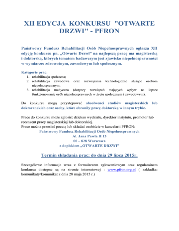 XII EDYCJA KONKURSU "OTWARTE DRZWI" - PFRON Państwowy Fundusz Rehabilitacji Osób Niepełnosprawnych ogłasza XII edycję konkursu pn. „Otwarte Drzwi” na najlepszą pracę ma magisterską i doktorską, których tematem badawczym jest zjawisko niepełnosprawności w wymiarze: zdrowotnym, zawodowym lub społecznym. Kategorie prac: 1. rehabilitacja społeczna; 2. rehabilitacja zawodowa oraz rozwiązania technologiczne służące osobom niepełnosprawnym; 3. rehabilitacja medyczna (dotyczy rozwiązań mających wpływ na lepsze funkcjonowanie osób niepełnosprawnych w życiu społecznym i zawodowym). Do konkursu mogą przystępować absolwenci studiów magisterskich lub doktoranckich oraz osoby, które obroniły pracę doktorską w innym trybie. Prace do konkursu może zgłosić: dziekan wydziału, dyrektor instytutu, promotor lub recenzent pracy magisterskiej lub doktorskiej. Prace można przesłać pocztą lub składać osobiście w kancelarii PFRON: Państwowy Fundusz Rehabilitacji Osób Niepełnosprawnych Al. Jana Pawła II 13 00 – 828 Warszawa z dopiskiem „OTWARTE DRZWI” Termin składania prac: do dnia 29 lipca 2015r. Szczegółowe informacje wraz z formularzem zgłoszeniowym oraz regulaminem konkursu dostępne są na stronie internetowej : www.pfron.org.pl ( zakładka: komunikaty/komunikat z dnia 28 maja 2015 r.)