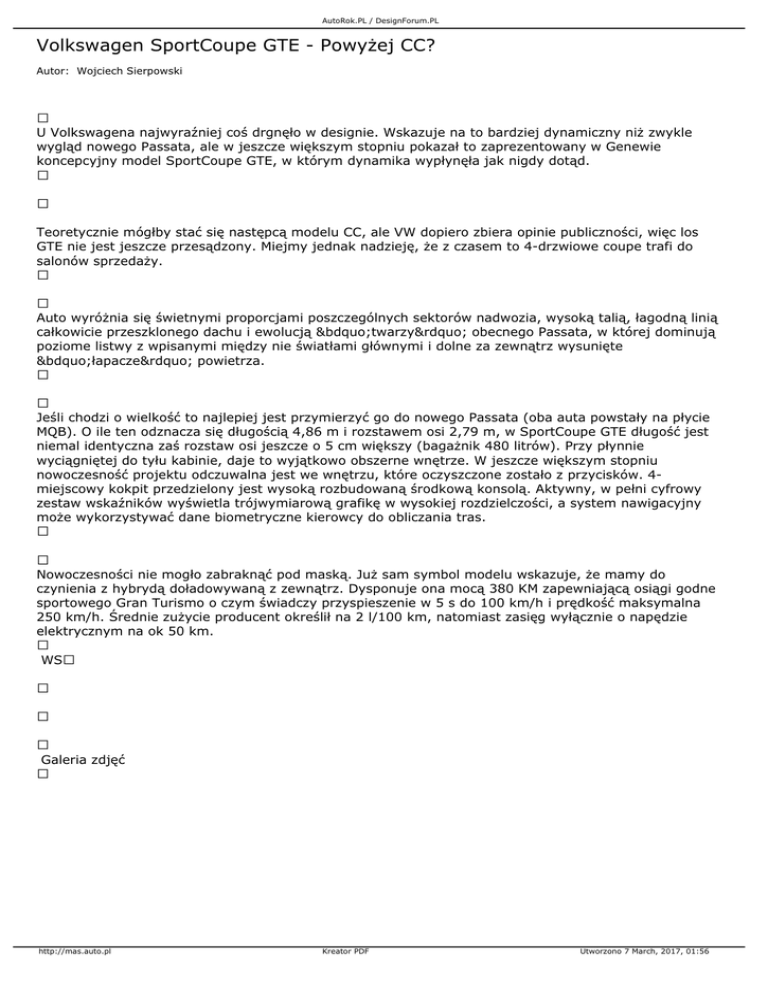 AutoRok.PL / DesignForum.PL Volkswagen SportCoupe GTE - Powyżej CC? Autor: Wojciech Sierpowski U Volkswagena najwyraźniej coś drgnęło w designie. Wskazuje na to bardziej dynamiczny niż zwykle wygląd nowego Passata, ale w jeszcze większym stopniu pokazał to zaprezentowany w Genewie koncepcyjny model SportCoupe GTE, w którym dynamika wypłynęła jak nigdy dotąd. Teoretycznie mógłby stać się następcą modelu CC, ale VW dopiero zbiera opinie publiczności, więc los GTE nie jest jeszcze przesądzony. Miejmy jednak nadzieję, że z czasem to 4-drzwiowe coupe trafi do salonów sprzedaży. Auto wyróżnia się świetnymi proporcjami poszczególnych sektorów nadwozia, wysoką talią, łagodną linią całkowicie przeszklonego dachu i ewolucją „twarzy” obecnego Passata, w której dominują poziome listwy z wpisanymi między nie światłami głównymi i dolne za zewnątrz wysunięte „łapacze” powietrza. Jeśli chodzi o wielkość to najlepiej jest przymierzyć go do nowego Passata (oba auta powstały na płycie MQB). O ile ten odznacza się długością 4,86 m i rozstawem osi 2,79 m, w SportCoupe GTE długość jest niemal identyczna zaś rozstaw osi jeszcze o 5 cm większy (bagażnik 480 litrów). Przy płynnie wyciągniętej do tyłu kabinie, daje to wyjątkowo obszerne wnętrze. W jeszcze większym stopniu nowoczesność projektu odczuwalna jest we wnętrzu, które oczyszczone zostało z przycisków. 4miejscowy kokpit przedzielony jest wysoką rozbudowaną środkową konsolą. Aktywny, w pełni cyfrowy zestaw wskaźników wyświetla trójwymiarową grafikę w wysokiej rozdzielczości, a system nawigacyjny może wykorzystywać dane biometryczne kierowcy do obliczania tras. Nowoczesności nie mogło zabraknąć pod maską. Już sam symbol modelu wskazuje, że mamy do czynienia z hybrydą doładowywaną z zewnątrz. Dysponuje ona mocą 380 KM zapewniającą osiągi godne sportowego Gran Turismo o czym świadczy przyspieszenie w 5 s do 100 km/h i prędkość maksymalna 250 km/h. Średnie zużycie producent określił na 2 l/100 km, natomiast zasięg wyłącznie o napędzie elektrycznym na ok 50 km. WS Galeria zdjęć http://mas.auto.pl Kreator PDF Utworzono 7 March, 2017, 01:56