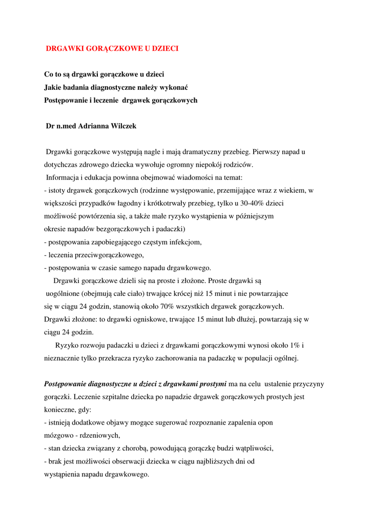 DRGAWKI GORĄCZKOWE U DZIECI Co to są drgawki gorączkowe u dzieci Jakie badania diagnostyczne należy wykonać Postępowanie i leczenie drgawek gorączkowych Dr n.med Adrianna Wilczek Drgawki gorączkowe występują nagle i mają dramatyczny przebieg. Pierwszy napad u dotychczas zdrowego dziecka wywołuje ogromny niepokój rodziców. Informacja i edukacja powinna obejmować wiadomości na temat: - istoty drgawek gorączkowych (rodzinne występowanie, przemijające wraz z wiekiem, w większości przypadków łagodny i krótkotrwały przebieg, tylko u 30-40% dzieci możliwość powtórzenia się, a także małe ryzyko wystąpienia w późniejszym okresie napadów bezgorączkowych i padaczki) - postępowania zapobiegającego częstym infekcjom, - leczenia przeciwgorączkowego, - postępowania w czasie samego napadu drgawkowego. Drgawki gorączkowe dzieli się na proste i złożone. Proste drgawki są uogólnione (obejmują całe ciało) trwające krócej niż 15 minut i nie powtarzające się w ciągu 24 godzin, stanowią około 70% wszystkich drgawek gorączkowych. Drgawki złożone: to drgawki ogniskowe, trwające 15 minut lub dłużej, powtarzają się w ciągu 24 godzin. Ryzyko rozwoju padaczki u dzieci z drgawkami gorączkowymi wynosi około 1% i nieznacznie tylko przekracza ryzyko zachorowania na padaczkę w populacji ogólnej. Postępowanie diagnostyczne u dzieci z drgawkami prostymi ma na celu ustalenie przyczyny gorączki. Leczenie szpitalne dziecka po napadzie drgawek gorączkowych prostych jest konieczne, gdy: - istnieją dodatkowe objawy mogące sugerować rozpoznanie zapalenia opon mózgowo - rdzeniowych, - stan dziecka związany z chorobą, powodującą gorączkę budzi wątpliwości, - brak jest możliwości obserwacji dziecka w ciągu najbliższych dni od wystąpienia napadu drgawkowego. Badanie płynu mózgowo - rdzeniowego u dziecka z drgawkami gorączkowymi, należy rozważyć, gdy podejrzewamy zakażenie układu nerwowego, dziecko leczone było antybiotykiem przed wystąpieniem drgawek. Na ogół u dzieci z drgawkami gorączkowymi prostymi, zwłaszcza nawrotowymi, nie ma konieczności wykonania badań dodatkowych. Postępowanie diagnostyczne u dziecka z drgawkami gorączkowymi złożonymi. 1. Większość dzieci po napadzie drgawek gorączkowych złożonych wymaga hospitalizacji w celu wykluczenia lub potwierdzenia różnych chorób. Rozpoznanie drgawek gorączkowych złożonych ustalić można bowiem dopiero po wykluczeniu innej przyczyny niż gorączka. 2.Wskazane jest wykonanie: pełnego badania biochemicznego surowicy krwi lub innych badań specjalistycznych w zależności od rodzaju podejrzewanego schorzenia metabolicznego, 3. Badanie płynu mózgowo- rdzeniowego wg Amerykańskiej Akademii zalecane jest u wszystkich dzieci poniżej 18 miesiąca życia . 4. Zaleca się badanie EEG w celu różnicowania z drgawkami gorączkowymi prostymi i napadami padaczkowymi, które mogą być wyzwolone gorączką. Badanie EEG nie ma wartości prognostycznej!! Częstsze stwierdzanie nieprawidłowych zapisów u dzieci w wieku 3-5 lat jest spowodowane fizjologicznym procesem dojrzewania mózgu. 5. Badania obrazowe TK i/lub NMR służą do oceny struktur mózgu i ustalenia lub wykluczenia przyczyny objawowej drgawek, 6. W wybranych przypadkach u dzieci z drgawkami gorączkowymi złożonymi może być wskazane wykonanie innych specjalistycznych badań dodatkowych. Dzieci, u których nie ustalono w sposób ostateczny podłoża drgawek, wymagają dalszej obserwacji pediatrycznej i neurologicznej. Postępowanie terapeutyczne w drgawkach gorączkowych. Wybór metody postępowania powinien być uzgodniony i zaakceptowany przez rodziców chorego dziecka. Rodzice dziecka muszą mieć zapewnione poczucie bezpieczeństwa. 1. Podstawowym celem jest przerwanie napadu drgawkowego trwającego powyżej 2-3 minut przez podanie doodbytniczo diazepamu przez przeszkolonych rodziców (wlewki diazepamu są tylko na receptę) 2. W razie wystąpienia ponownego napadu drgawkowego należy powtórzyć dawkę 0,5 mg/kg (średnio u dzieci do 3 lat-5 mg, powyżej 3 lat - 10 mg) 3. Jeżeli dotychczas stosowane postępowanie nie przerwało napadu drgawkowego, dalsze leczenie musi prowadzić lekarz Postępowanie zapobiegawcze 1.Profilaktyka napadów powinna polegać na: - ochronie dziecka przed zakażeniami, prawidłowym leczeniu chorób gorączkowych, a także innych stanów przebiegających z gorączką, np. po szczepieniach profilaktycznych - zaleceniu podawania leków przeciwgorączkowych (paracetamol w czopku) i lub obniżania ciepłoty ciała przez schładzanie zewnętrzne. 2. Stosowanie terapii profilaktycznej przez stałe podawanie luminalu lub leków przeciwpadaczkowych jest zbędne!! Leczenie profilaktyczne powinno być stosowane tylko wyjątkowo, a jedyną zalecaną w takich przypadkach metodą jest podawanie dziecku diazepamu we wlewce doodbytniczej w czasie gorączki przez okres 24-48 godzin. Leczenie takie zalecamy dzieciom ze szczególnie wysokim ryzykiem nawrotów. Do czynników ryzyka nawrotów drgawek gorączkowych należą: -rodzinne występowanie drgawek, -młody wiek dziecka w czasie pierwszego napadu drgawkowego, -ujawnienie się drgawek bezpośrednio po wystąpieniu gorączki, Piśmiennictwo: Tenna Rosser. Pediatric Neurology 2007, 65-68. Lippincott Williams/Wilkins Wendorff J. Występowanie drgawek gorączkowych w populacji dzieci łódzkich Neurol.Dziec.;1997:6 (supl.II)19 Dr n. med. Adrianna Wilczek - specjalista neurologii dziecięcej, pediatra. Doktorantka Instytutu Psychoneurolgii w Warszawie, z dużym doświadczeniem klinicznym (wieloletnia praca w Oddziale Neurologii Dziecięcej we Wrocławiu ),staże zagraniczne w USA, publikacje międzynarodowe, aktywny udział w konferencjach i kongresach międzynarodowych. Recenzent amerykańskiej gazety STROKE od 2002 roku Miejsce praktyki prywatnej : Specjalistyczny Gabinet Neurologii Dziecięcej ul.. Czeremchowa 7 tel.0-603785509 53-009 Wrocł