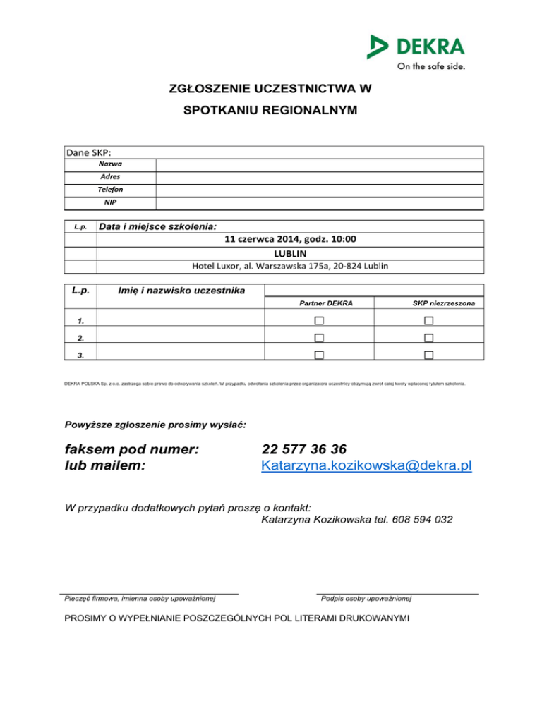 ZGŁOSZENIE UCZESTNICTWA W SPOTKANIU REGIONALNYM Dane SKP: Nazwa Adres Telefon NIP L.p. Data i miejsce szkolenia: 11 czerwca 2014, godz. 10:00 LUBLIN Hotel Luxor, al. Warszawska 175a, 20‐824 Lublin L.p. Imię i nazwisko uczestnika Partner DEKRA 1. 2. 3. □ □ □ SKP niezrzeszona □ □ □ DEKRA POLSKA Sp. z o.o. zastrzega sobie prawo do odwoływania szkoleń. W przypadku odwołania szkolenia przez organizatora uczestnicy otrzymują zwrot całej kwoty wpłaconej tytułem szkolenia. Powyższe zgłoszenie prosimy wysłać: faksem pod numer: lub mailem: 22 577 36 36 [email protected] W przypadku dodatkowych pytań proszę o kontakt: Katarzyna Kozikowska tel. 608 594 032 Pieczęć firmowa, imienna osoby upoważnionej Podpis osoby upoważnionej PROSIMY O WYPEŁNIANIE POSZCZEGÓLNYCH POL LITERAMI DRUKOWANYMI
