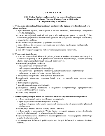 OGŁOSZENIE Wójt Gminy Dopiewo ogłasza nabór na stanowisko kierownicze Kierownik Referatu Oświaty, Kultury, Sportu i Zdrowia w Urzędzie Gminy w Dopiewie 1. Wymagania niezbędne, które kandydat na stanowisko będące przedmiotem naboru winien spełniać: a) wykształcenie wyższe, fakultatywne z zakresu ekonomii, administracji, zarządzania oświatą, pedagogiki, b) posiada co najmniej trzyletni staż pracy lub wykonywała przez co najmniej 3 lata działalność gospodarczą o charakterze zgodnym z wymaganiami na danym stanowisku; c) obywatelstwo polskie, d) niekaralność za przestępstwa popełnione umyślnie, e) pełna zdolność do czynności prawnych oraz korzystanie z pełni praw publicznych, f) nieposzlakowana opinia, g) stan zdrowia pozwalający na wykonywanie czynności na stanowisku. 2. Wymagania dodatkowe: a) praca na stanowiskach kierowniczych w jednostkach sektora finansów publicznych w okresie co najmniej 3 lat w jednostkach samorządu terytorialnego, służbie cywilnej, służbie zagranicznej lub innych urzędach państwowych b) znajomość przepisów z zakresu: − funkcjonowania systemu oświaty, − kodeksu postępowania administracyjnego − funkcjonowania i gospodarki finansowej jednostek samorządu terytorialnego, − zadań gminy w zakresie kultury sportu i zdrowia, c) umiejętność redagowania i analizowania dokumentów, d) umiejętność kierowania zespołem ludzi, pracy w zespole oraz rozwiązywania problemów, e) dobra organizacja pracy, f) wysokie poczucie odpowiedzialności, g) umiejętność obsługi komputera i znajomość komputerowego oprogramowania Microsoft Office (Word, Excel), h) prawo jazdy kategorii B. 3. Zakres wykonywanych zadań na stanowisku będzie obejmować w szczególności: a) wykonywanie zadań gminy określonych w przepisach: − regulujących funkcjonowanie systemu oświaty, − regulujących prawa i obowiązki nauczycieli oraz pozostałych pracowników placówek oświatowych, b) koordynacja zadań z zakresu kultury, sportu i zdrowia, c) wykonywanie z upoważnienia Wójta Gminy czynności nadzoru wobec dyrektorów placówek oświatowych i wychowania przedszkolnego, d) wykonywanie nadzoru i kontroli w zakresie planowania i realizacji planu finansowego placówek oświatowych, e) opracowywanie informacji publicznych oraz innych informacji z zakresu działania referatu. f) przygotowywanie projektów uchwał Rady i zarządzeń Wójta w zakresie działania referatu, g) prowadzenie spraw dotyczących awansu zawodowego nauczycieli, h) współpraca z kierownikami referatów Urzędu Gminy, szkołami oraz organizacjami i związkami zawodowymi pracowników oświaty, 4. Wymagane dokumenty: a. List motywacyjny; b. CV; c. Oświadczenia o: - wyrażeniu zgody na przetwarzanie danych osobowych zawartych w ofercie pracy do potrzeb realizacji procesu rekrutacji, zgodnie z ustawą z dnia 29 sierpnia 1997 r. o ochronie danych osobowych (Dz. U. z 1997 r. Nr 133, poz.883, ze. zm.); - posiadaniu obywatelstwa polskiego; - posiadaniu pełnej zdolności do czynności prawnych oraz o korzystaniu z pełni praw publicznych - niekaralności za przestępstwa umyślne ścigane z oskarżenia publicznego lub umyślne przestępstwo skarbowe d. Dokumenty potwierdzające posiadane wykształcenie i kwalifikacje zawodowe (kserokopie dyplomów, zaświadczeń, itp.) e. Dokumenty potwierdzające staż pracy i doświadczenie ( kserokopie świadectw pracy, zawartych umów, referencje, zaświadczenia, itp.) 5. Inne informacje: Oferty, w zamkniętej kopercie, należy składać w terminie do dnia 2 lutego 2015 r. w Sekretariacie Urzędu Gminy w Dopiewie, ul. Leśna 1c lub przesłać pocztą na adres: Urząd Gminy 62-070 Dopiewo ul. Leśna 1 c z dopiskiem na kopercie: „Nabór na stanowisko Kierownika Referatu Oświaty, Kultury, Sportu i Zdrowia” UWAGA! Liczy się data wpływu do Urzędu Gminy. Oferty, które zostaną złożone po terminie nie będą rozpatrywane. Oferty, które nie zostaną wybrane nie podlegają zwrotowi.