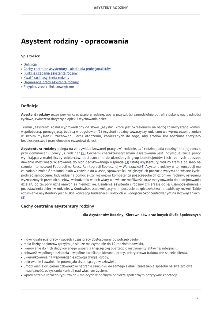 ASYSTENT RODZINY Asystent rodziny - opracowania Spis treści: ● ● ● ● ● ● Definicja Cechy centralne asystentury - ulotka dla profesjonalistów Funkcje i zadania asystenta rodziny Kwalifikacje asystenta rodziny Organizacja pracy asystenta rodziny Przypisy, źródła, linki zewnętrzne Definicja Asystent rodziny przez pewien czas wspiera rodzinę, aby w przyszłości samodzielnie potrafiła pokonywać trudności życiowe, zwłaszcza dotyczące opieki i wychowania dzieci. Termin „asystent” został wyprowadzony od słowa „asysta”, które jest określeniem na osobę towarzyszącą komuś, współobecną, pomagającą, będącą w pogotowiu. (1) Asystent rodziny towarzyszy rodzicom we wprowadzeniu zmian w swoim myśleniu, zachowaniu oraz otoczeniu, koniecznych do tego, aby środowisko rodzinne sprzyjało bezpieczeństwu i prawidłowemu rozwojowi dzieci. Asystentura rodziny polega na zindywidualizowanej pracy „w” rodzinie, „z” rodziną, „dla rodziny” (na jej rzecz), przy dominowaniu pracy „z rodziną”.(2) Cechami charakterystycznymi asystowania jest indywidualizacja pracy wynikająca z małej liczby odbiorców, dostosowanie do określonych grup beneficjentów i ich realnych potrzeb, dawanie możliwości skierowania do nich dedykowanego wsparcia.(3) Istotę asystentury rodziny trafnie opisano na stronie internetowej Federacji na Rzecz Reintegracji Społecznej w Warszawie.(4) Asystent rodziny w tej koncepcji ma za zadanie zmienić stosunek osób w rodzinie do własnej sprawczości, zwiększyć ich poczucie wpływu na własne życie, podnieć samoocenę. Indywidualna pomoc służy rozwojowi kompetencji poszczególnych członków rodziny, osiąganiu wyznaczonych przez nich celów, wzbudzaniu w nich wiary we własne możliwości oraz motywowaniu do podejmowania działań, do tej pory uznawanych za niemożliwe. Działania asystenta i rodziny zmierzają do jej usamodzielnienia i pozostawienia dzieci w rodzinie, w środowisku zapewniającym im poczucie bezpieczeństwa i prawidłowy rozwój. Takie rozumienie asystentury jest bliskie koncepcji budzenia sił ludzkich w Podejściu Skoncentrowanym na Rozwiązaniach. (5) Cechy centralne asystentury rodziny dla Asystentów Rodziny, Kierowników oraz innych Służb Społecznych ● ● ● ● ● ● ● ● indywidualizacja pracy – sposób i czas pracy dostosowany do potrzeb osoby, mała liczby odbiorców (przyjmuje się, że maksymalnie do 12 rodzin/środowisk), kierowanie do nich dedykowanego wsparcia (najczęściej opartego o instrumenty aktywnej integracji), celowość wspólnego działania – wspólne określanie kierunku pracy, priorytetowo traktowane są cele klienta, ukierunkowanie na wspomaganie rozwoju drugiej osoby, odkrywanie i uwalnianie potencjału drzemiącego w człowieku, umożliwienie drugiemu człowiekowi nabrania szacunku do samego siebie i znalezienia sposobu na swą życiową niezależność, odzyskania kontroli nad własnym życiem, wprowadzenie różnego typu zmian – mających w ogólnym odbiorze społecznym pozytywne konotacje, 1 ASYSTENT RODZINY ● ● ● ● ● ● ● ● ● ● ● ● ● ● ● ● ● ● ● ● ● wsparcie w różnym zakresie: emocjonalnym, instrumentalnym, informacyjnym, oddziaływanie na kilku płaszczyznach (podstawowe potrzeby, działania skoncentrowane na opiece i wychowaniu dzieci, zatrudnieniu, poszukiwanie rozwiązań trudności natury psychologicznej, odbudowa więzi rodzinnej, spędzanie wolnego czasu itd.), lub inaczej w kilku sferach (socjalno – bytowej, psychologicznej, zawodowej, społecznej, zdrowotnej), dostosowanie pomocy do grup odbiorców i ich realnych potrzeb oraz celów, które chcą osiągnąć, skoncentrowanie na osobie wspieranej, praca w oparciu o więź, budowanie relacji z osobą wspieraną, danie osobie wspieranej oparcia psychicznego, osobowego, usystematyzowanie działania (ocena, tworzenie celów, planowanie, realizacja planu, ewaluacja), praca „z” osobą - współudział osoby wspieranej we wszystkich etapach metodycznego działania, procesualność – praca małymi etapami, ciągłe rozwijanie i modyfikowanie pracy, elastyczne reagowanie na potrzeby i kryzysy osób wspieranych, dobrowolność zarówno ze strony klienta jak i asystenta, towarzyszenie odbiorcy wsparcia w konkretnych różnych działaniach pozwalających jej wyjść z trudnej sytuacji życiowej oraz w działaniach dnia codziennego, duża częstotliwość spotkań i dostosowanie ich długości do wykonania danego wspólnego działania, dostosowanie tempa pracy do możliwości aktywizowania mechanizmów radzenia sobie i do możliwości wykorzystania zasobów poznawczych jednostki, kompleksowość rozumiana jako uspójnianie wsparcia płynącego do klientów od różnych profesjonalistów i instytucji, zmiana postawy pomagającego z arbitralnego i „urzędniczego” na towarzyszący i partnerski, zapewnienie osobie wspieranej poczucia akceptacji i bezpieczeństwa, przywrócenie wiary we własne możliwości, niwelowanie stresu i aktywizowanie u osoby wspieranej indywidualnych strategii radzenia sobie ze stresem, dawanie nadziei, że pozytywne zmiany są możliwe, udzielanie informacji zwrotnych, stosowanie narzędzi pozbawionych wymiaru finansowego, praca w środowisku przebywania klienta. Asystent rodziny przez pewien czas wspiera rodzinę, aby w przyszłości samodzielnie potrafiła pokonywać trudności życiowe, zwłaszcza dotyczące opieki i wychowania dzieci. Asystent rodziny pomaga zrealizować to, co rodzina chce oraz co inne służby społeczne wymagają od rodziny. Pomaga tylko w tym, co możliwe jest do osiągnięcia. Funkcje i zadania asystenta rodziny Do funkcji asystenta rodziny zaliczono funkcję wsparcia psychiczno – emocjonalnego, diagnostyczno – monitorującą, opiekuńczą, doradczą, mediacyjną, wychowawczą, motywująco – aktywizującą, koordynacji działań skierowanych na rodzinę. Zakres zadań asystenta rodziny obejmuje cztery 