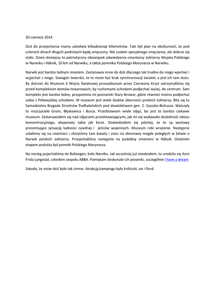 20 czerwca 2014 Dziś do przejechania mamy zaledwie kilkadziesiąt kilometrów. Taki był plan na okoliczność, że pod czterech dniach długich podróżach będę zmęczony. Nie czułem specjalnego zmęczenia, ale dobrze się stało. Dzień dzisiejszy to patriotyczny obowiązek odwiedzenia cmentarzy żołnierzy Wojska Polskiego w Narwiku i Håkvik, 10 km od Narwiku, a także pomnika Polskiego Marynarza w Narwiku. Narwik jest bardzo ładnym miastem. Zastanawia mnie do dziś dlaczego tak trudno do niego wjechać i wyjechać z niego. Szwagier twierdzi, że to może być brak synchronizacji świateł, a jest ich tam dużo. By dotrzeć do Muzeum II Wojny Światowej prowadzonym przez Czerwony Krzyż zatrzymaliśmy się przed kompleksem domów towarowych, by ruchomymi schodami podjechać wyżej, do centrum. Sam kompleks jest bardzo ładny, przypomina mi poznański Stary Browar, gdzie również można podjechać sobie z Półwiejskiej schodami. W muzeum jest wiele śladów obecności polskich żołnierzy. Biła się tu Samodzielna Brygada Strzelców Podhalańskich pod dowództwem gen. Z. Szyszko-Bohusza. Walczyły tu niszczyciele Grom, Błyskawica i Burza. Przedstawiam wiele zdjęć, bo jest to bardzo ciekawe muzeum. Zastanawiałem się nad zdjęciami przedstawiającymi, jak mi się wydawało działalność obozu koncentracyjnego, eksponaty takie jak bicze. Dowiedziałem się później, że to są wystawy prezentujące sytuację ludności cywilnej i jeńców wojennych. Muzeum robi wrażenie. Następnie udaliśmy się na cmentarz i złożyliśmy tam kwiaty i znicz na zbiorowej mogile poległych w bitwie o Narwik polskich żołnierzy. Przejechaliśmy następnie na podobny cmentarz w Håkvik. Ostatnim etapem podróży był pomnik Polskiego Marynarza. Na nocleg pojechaliśmy do Ballangen, koło Narviku. Jak wcześniej już wiedziałem, tu urodziła się Anni Frida Lyngstad, członkini zespołu ABBA. Pamiętam doskonale ich piosenki, szczególnie I have a dream Szkoda, że znów dziś było tak zimno. Atrakcją kampingu były króliczki, no i fiord.