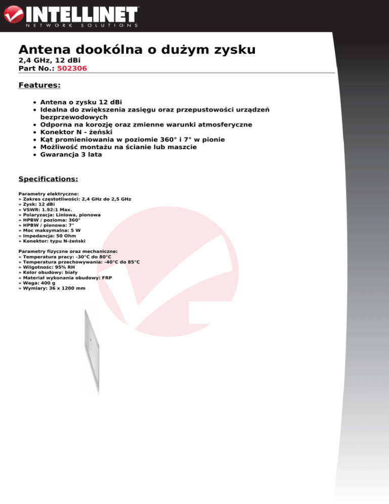 Antena dookólna o dużym zysku 2,4 GHz, 12 dBi Part No.: 502306 Features: Antena o zysku 12 dBi Idealna do zwiększenia zasięgu oraz przepustowości urządzeń bezprzewodowych Odporna na korozję oraz zmienne warunki atmosferyczne Konektor N - żeński Kąt promieniowania w poziomie 360° i 7° w pionie Możliwość montażu na ścianie lub maszcie Gwarancja 3 lata Specifications: Parametry elektryczne: » Zakres częstotliwości: 2,4 GHz do 2,5 GHz » Zysk: 12 dBi » VSWR: 1.92:1 Max. » Polaryzacja: Liniowa, pionowa » HPBW / pozioma: 360° » HPBW / pionowa: 7° » Moc maksymalna: 5 W » Impedancja: 50 Ohm » Konektor: typu N-żeński Parametry fizyczne oraz mechaniczne: » Temperatura pracy: -30°C do 80°C » Temperatura przechowywania: -40°C do 85°C » Wilgotnośc: 95% RH » Kolor obudowy: biały » Materiał wykonania obudowy: FRP » Waga: 400 g » Wymiary: 36 x 1200 mm