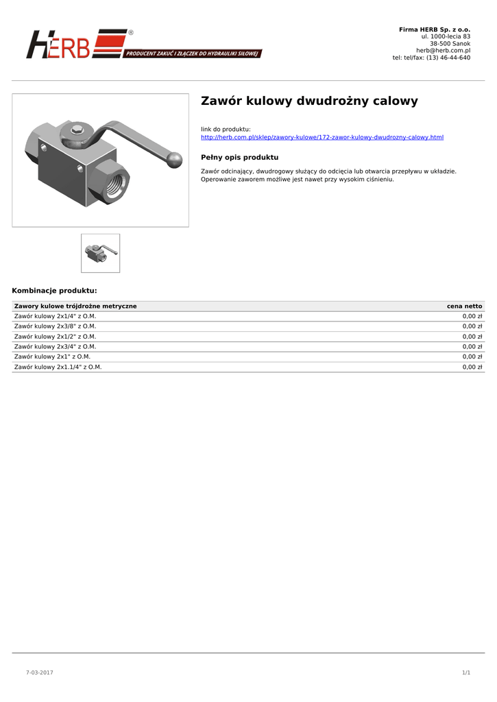 Firma HERB Sp. z o.o. ul. 1000-lecia 83 38-500 Sanok [email protected] tel: tel/fax: (13) 46-44-640 Zawór kulowy dwudrożny calowy link do produktu: http://herb.com.pl/sklep/zawory-kulowe/172-zawor-kulowy-dwudrozny-calowy.html Pełny opis produktu Zawór odcinający, dwudrogowy służący do odcięcia lub otwarcia przepływu w układzie. Operowanie zaworem możliwe jest nawet przy wysokim ciśnieniu. Kombinacje produktu: Zawory kulowe trójdrożne metryczne cena netto Zawór kulowy 2x1/4" z O.M. 0,00 zł Zawór kulowy 2x3/8" z O.M. 0,00 zł Zawór kulowy 2x1/2" z O.M. 0,00 zł Zawór kulowy 2x3/4" z O.M. 0,00 zł Zawór kulowy 2x1" z O.M. 0,00 zł Zawór kulowy 2x1.1/4" z O.M. 0,00 zł 7-03-2017 1/1