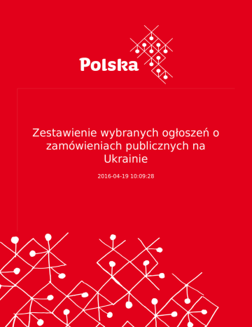 Zestawienie wybranych ogłoszeń o zamówieniach publicznych na Ukrainie 2016-04-19 10:09:28 2 Poniżej przedstawiamy zestawienie wybranych ogłoszeń o zamówieniach publicznych na Ukrainie, w których mogą brać udział zagraniczni oferenci (szczegółowa informacja na temat w/w ogłoszeń wraz z dokumentacją przetagową dostępna jest na Portalu Promocji Eksportu w zakładce „Przetargi”). Jednocześnie przypominany, iż wszystkie ogłoszenia o zamówieniach publicznych na Ukrainie (adresowane zarówno wyłącznie do krajowych oferentów, jak i do wszystkich potencjalnych oferentów, bez ograniczeń) znaleźć można w publicznym portalu zamówień publicznych (http://www.tender.me.gov.ua). Temat przetargu: Budownictwo obiektu: Cmentarz w lewobrzeżnej części miasta Dnieprodzerżyńsk (Ukraina); 005855 Nazwa i dane teleadresowe instytucji ogłaszającej przetarg: Departament Gospodarki Komunalnej i Budownictwa Dnieprodzerżyńskiej Rady Miejskiej Obwodu Dniepropietrowskiego, ul. Moskworecka 14, 51931, Dnieprodzerżyńsk, obwód dniepropietrowski, Ukraina; www.tender.me.gov.ua Osoba kontaktowa: p. Anna Kirsik, tel. +38 (05692) 300-14, faks +38 (0569) 55-07-76, e-mail: [email protected] Planowana cena zakupu: 53,4 mln UAH Termin składania ofert do: 26.05.2016 Państwo/Rynek: Ukraina Informacja o przetargu: - Na Portalu Zamówień Publicznych Ukrainy: https://tender.me.gov.ua/EDZFrontOffice/menu/uk/interAnnounceSearch/view_inter_announce_detail?id=EDZrrmaxSv Rodzaj ogłoszenia międzynarodowego: Przetarg otwarty Numer przetargu: 005855 Numer Biuletynu ogłoszeń międzynarodowych: 72 (14.04.2016) z dn. 14.04.2016 Temat przetargu: Odświeżanie i malowanie oznaczeń poziomych na drogach publicznych o znaczeniu krajowym w obwodzie mikołajowskim (Ukraina); 005853 Nazwa i dane teleadresowe instytucji ogłaszającej przetarg: Służba Dróg Samochodowych w Obwodzie Mikołajowskim, ul. H. Petrowoj 2-a, 54029, Mikołajów, Ukraina; www.tender.me.gov.ua Osoba kontaktowa: tel./faks +38 (0512) 67-51-00, +38 (0512) 56-41-15, e-mail: [email protected] Planowana cena zakupu: 11,6 mln UAH Termin składania ofert do: 25.05.2016 Państwo/Rynek: Ukraina Informacja o przetargu: - Na Portalu Zamówień Publicznych Ukrainy: https://tender.me.gov.ua/EDZFrontOffice/menu/uk/interAnnounceSearch/view_inter_announce_detail?id=EDZrrm9j99 Rodzaj ogłoszenia międzynarodowego: Przetarg otwarty Numer przetargu: 005853 Numer Biuletynu ogłoszeń międzynarodowych: 72 (14.04.2016) z dn. 14.04.2016 3 Temat przetargu: Łatanie dziur na nawierzchni publicznych dróg samochodowych o znaczeniu krajowym metodą injekcji strumieniowych w obwodzie mikołajowskim (Ukraina); 005854 Nazwa i dane teleadresowe instytucji ogłaszającej przetarg: Służba Dróg Samochodowych w Obwodzie Mikołajowskim, ul. H. Petrowoj 2-a, 54029, Mikołajów, Ukraina; www.tender.me.gov.ua Osoba kontaktowa: tel./faks +38 (0512) 67-51-00, +38 (0512) 56-41-15, e-mail: [email protected] Planowana cena zakupu: 12,1 mln UAH Termin składania ofert do: 20.05.2016 Państwo/Rynek: Ukraina Informacja o przetargu: - Na Portalu Zamówień Publicznych Ukrainy: https://tender.me.gov.ua/EDZFrontOffice/menu/uk/interAnnounceSearch/view_inter_announce_detail?id=EDZrrmwGWC Rodzaj ogłoszenia międzynarodowego: Przetarg otwarty Numer przetargu: 005854 Numer Biuletynu ogłoszeń międzynarodowych: 72 (14.04.2016) z dn. 14.04.2016 Temat przetargu: Narzędzia i przyrządy lekarskie, chirurgiczne i stomatologiczne (materiały do dializy) – 13 pozycji (Ukraina); 005836 Nazwa i dane teleadresowe instytucji ogłaszającej przetarg: Departament Opieki Zdrowotnej Organu Kijowskiej Państwowej Administracji Miejskiej, ul. Prorizna 19, 01001, Kijów, Ukraina; www.tender.me.gov.ua, http://tender.finaudit.kiev.ua, www.health.kievcity.gov.ua Osoba kontaktowa: p. Adrij Skybjak, tel./faks +38 (044) 284-08-09, +38 (044) 284-08-75, +38 (044) 278-01-03, email: [email protected] Planowana cena zakupu: 49,9 mln UAH Termin składania ofert do: 25.05.2016 Państwo/Rynek: Ukraina Informacja o przetargu: - Na Portalu Zamówień Publicznych Ukrainy: https://tender.me.gov.ua/EDZFrontOffice/menu/uk/interAnnounceSearch/view_inter_announce_detail?id=EDZrrm9JfB Rodzaj ogłoszenia międzynarodowego: Przetarg otwarty Numer przetargu: 005836 Numer Biuletynu ogłoszeń międzynarodowych: 72 (14.04.2016) z dn. 14.04.2016 Temat przetargu: Gaz ziemny, skroplony lub w stanie gazowym w ilości 2,9 mln m3 (Ukraina); 005858 Nazwa i dane teleadresowe instytucji ogłaszającej przetarg: Wydział Obsługi Mieszkań w Żytomierzu Ministerstwa Obrony Ukrainy, ul. Admirała Szczastnoho 20, 10014, Żytomierz, Ukraina; www.tender.me.gov.ua Osoba kontaktowa: p. Oleksij Kłymenko, tel./faks +38 (0412) 374-598 Planowana cena zakupu: 23 mln UAH Termin składania ofert do: 25.05.2016 Państwo/Rynek: Ukraina Informacja o przetargu: - Na Portalu Zamówień Publicznych Ukrainy: https://tender.me.gov.ua/EDZFrontOffice/menu/uk/interAnnounceSearch/view_inter_announce_detail?id=EDZrrma5S5 Rodzaj ogłoszenia międzynarodowego: Przetarg otwarty Numer przetargu: 005858 Numer Biuletynu ogłoszeń międzynarodowych: 72 (14.04.2016) z dn. 14.04.2016 4 Temat przetargu: Autobusy szkolne w ilości 25 szt. (Ukraina); 005837 Nazwa i dane teleadresowe instytucji ogłaszającej przetarg: Departament Edukacji i Nauki Dniepropietrowskiej Obwodowej Administracji Państwowej, ul. Swerdłowa 70, 49000, Dniepropietrowsk, Ukraina; www.tender.me.gov.ua Osoba kontaktowa: p. Natalija Litwinenko, tel. +38 (0562) 33-89-28, faks +38 (056) 371-70-85, e-mail: [email protected] Planowana cena zakupu: 42 mln UAH Termin składania ofert do: 26.05.2016 Państwo/Rynek: Ukraina Informacja o przetargu: - Na Portalu Zamówień Publicznych Ukrainy: https://tender.me.gov.ua/EDZFrontOffice/menu/uk/interAnnounceSearch/view_inter_announce_detail?id=EDZrrmNH4P Rodzaj ogłoszenia międzynarodowego: Przetarg otwarty Numer przetargu: 005837 Numer Biuletynu ogłosz