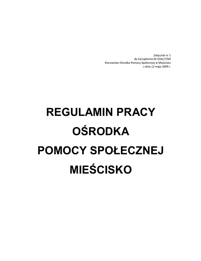 Załącznik nr 1 do Zarządzenia Nr 0161/7/09 Kierownika Ośrodka Pomocy Społecznej w Mieścisku z dnia 12 maja 2009 r. REGULAMIN PRACY OŚRODKA POMOCY SPOŁECZNEJ MIEŚCISKO I. Postanowienia ogólne §1 Ilekroć w regulaminie pracy jest mowa o: a) regulaminie – należy przez to rozumieć Regulamin Pracy Ośrodka Pomocy Społecznej Mieścisko, b) zakładzie pracy, gminnej jednostce organizacyjnej lub ośrodku – należy przez to rozumieć Ośrodek Pomocy Społecznej Mieścisko w imieniu, którego występuje Kierownik, c) kierowniku i pracodawcy - należy przez to rozumieć Kierownika Ośrodka Pomocy Społecznej Mieścisko, d) pracowniku – należy przez to rozumieć osobę zatrudnioną w ośrodku na podstawie umowy o pracę e) stażu i przygotowaniu zawodowym – należy przez to rozumieć nabywanie przez bezrobotnego umiejętności praktycznych do wykonywania pracy przez wykonywanie zadań w ośrodku bez nawiązywania stosunku pracy z pracodawcą. §2 Regulamin pracy ustala organizację i porządek w procesie pracy oraz związane z tym prawa i obowiązki pracodawcy i pracowników. §3 Przepisy regulaminu pracy obowiązują wszystkich pracowników ośrodka, bez względu na sposób nawiązania stosunku pracy, wymiar czasu pracy i zajmowane stanowisko. §4 Wszelkich informacji wychodzących na zewnątrz zakładu pracy, a dotyczących jego funkcjonowania, udziela kierownik lub upoważniona przez niego osoba. §5 1. Pracodawcą Kierownika Ośrodka Pomocy Społecznej Mieścisko jest Wójt Gminy Mieścisko. 2. Interesantów w sprawie skarg i wniosków przyjmuje kierownik w każdy dzień pracy ośrodka w godzinach urzędowania. §6 Niniejszy regulamin podaje do wiadomości każdego przyjmowanego do pracy pracownika kierownik, a zapoznanie się z treścią regulaminu pracownik potwierdza w odrębnym oświadczeniu, własnoręcznym podpisem. II. Obowiązki pracodawcy §7 Pracodawca jest obowiązany w szczególności: 1) zapoznać pracowników podejmujących pracę z zakresem czynności, uprawnień i odpowiedzialności oraz sposobem wykonywania pracy na wyznaczonych stanowiskach oraz podstawowymi uprawnieniami, 2) organizować pracę w sposób zapewniający pełne wykorzystanie czasu pracy, jak również osiąganie przez pracowników przy wykorzystaniu ich uzdolnień i kwalifikacji, wysokiej wydajności i należytej jakości pracy, 3) zapewnić bezpieczne i higieniczne warunki pracy oraz prowadzić systematyczne szkolenia pracowników w zakresie bezpieczeństwa i higieny pracy, 4) terminowo i prawidłowo wypłacać wynagrodzenie, 5) ułatwiać pracownikom podnoszenie kwalifikacji zawodowych, 6) stworzyć pracownikom podejmującym zatrudnienie po ukończeniu szkoły warunki sprzyjające przystosowaniu się do należytego wykonywania pracy, 7) zaspakajać w miarę posiadanych środków socjalne potrzeby pracowników, 8) szanować godność i inne dobra osobiste pracowników, 9) prowadzić dokumentację w sprawach związanych ze stosunkiem pracy oraz akt osobowe pracowników, 10) wpływać na kształtowanie zasad współżycia społecznego. 11) przeciwdziałać mobbingowi, 12) przeciwdziałać dyskryminacji w zatrudnieniu, 13) stosować obiektywne i sprawiedliwe kryteria oceny pracowników, §8 1. Na pracodawcy ciąży obowiązek niezwłocznego potwierdzenia pracownikom na piśmie rodzaju zawartej umowy o pracę i jej warunków. 2. Pracodawca zobowiązany jest poinformować każdego pracownika na piśmie, nie później niż w ciągu 7 dni od dnia zawarcia umowy o pracę, o: a) częstotliwości i terminowości wypłaty wynagrodzenia za pracę, b) normie dobowej i tygodniowej czasu pracy, którymi objęty jest pracownik, c) wymiarze i prawie do urlopu wypoczynkowego, do którego uprawniony jest pracownik, d) długości okresu wypowiedzenia stosunku pracy §9 1. Pracownika samorządowego zatrudnionego na stanowisku urzędniczym, w tym kierowniczym stanowisku urzędniczym, można na jego wniosek lub za jego zgodą przenieść do pracy w innej jednostce organizacyjnej jednostki samorządu terytorialnego, w tej samej lub innej miejscowości, w każdym czasie, jeżeli nie narusza to ważnego interesu jednostki, która dotychczas zatrudniała pracownika samorządowego, oraz przemawiają za tym ważne potrzeby po stronie jednostki przejmującej. 2. W przypadku przeniesienia do innej jednostki pracownika samorządowego zatrudnionego na stanowisku urzędniczym, w tym kierowniczym stanowisku urzędniczym, jego akta osobowe wraz z pozostałą dokumentacją w sprawach związanych ze stosunkiem pracy przekazuje się do jednostki, w której pracownik ma być zatrudniony. § 10 Pracodawca odpowiada za dostarczenie pracownikowi i właściwe używanie przez niego niezbędnych do wykonania pracy materiałów i urządzeń oraz za rzetelne rozliczanie pracownika z używanych materiałów i urządzeń, jego pracy i czasu pracy. III. Prawa i obowiązki pracownika § 11 Pracownik przed rozpoczęciem pracy obowiązany jest przedstawić zaświadczenie lekarskie o braku przeciwwskazań do zatrudnienia na wskazanym stanowisku, wydane przez lekarza medycyny pracy § 12 Pracownik jest obowiązany w szczególności: a) przestrzegać Konstytucji Rzeczypospolitej Polskiej i innych przepisów prawa, b) wykonywać pracę sumiennie i starannie oraz stosować się do poleceń przełożonych, które dotyczą pracy, c) sumiennie, sprawnie i bezstronnie wykonywać zadania, d) przestrzegać czasu pracy ustalonego w zakładzie pracy, e) przestrzegać regulaminu pracy, f) przestrzegać przepisów oraz zasad bezpieczeństwa i higieny pracy, a także przepisów przeciwpożarowych, g) dbać o dobro zakładu pracy, chronić jego mienie, h) przestrzegać tajemnicy określonej w odrębnych przepisach, i) przestrzegać w zakładzie pracy zasad współżycia społecznego, j) zachować się z godnością w miejscu pracy i poza nim, k) złożyć oświadczenia wskazane w odrębnych przepisach, l) podnosić umiejętności i kwalifikacje zawodowe, ł) 