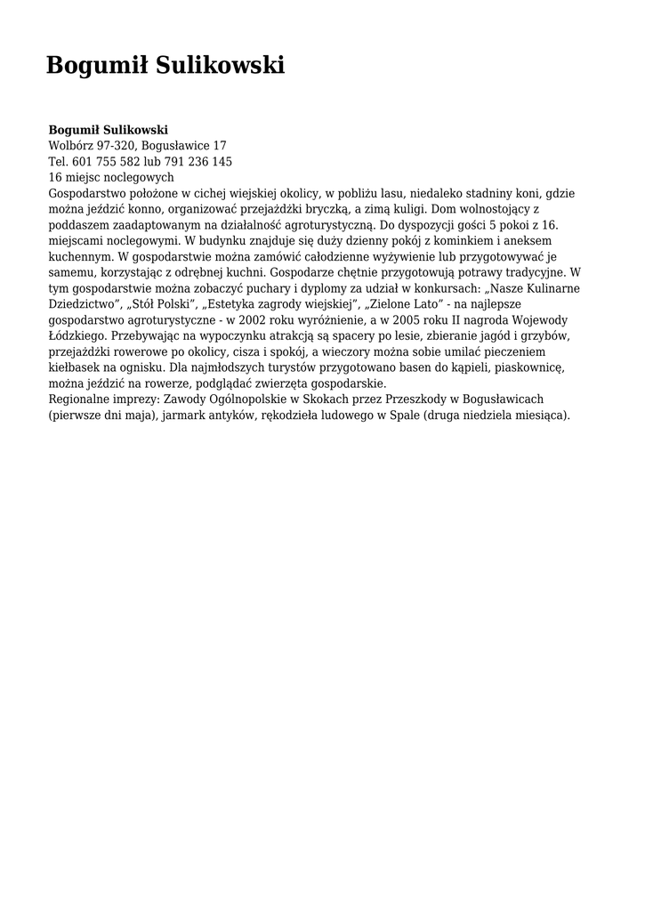 Bogumił Sulikowski Bogumił Sulikowski Wolbórz 97-320, Bogusławice 17 Tel. 601 755 582 lub 791 236 145 16 miejsc noclegowych Gospodarstwo położone w cichej wiejskiej okolicy, w pobliżu lasu, niedaleko stadniny koni, gdzie można jeździć konno, organizować przejażdżki bryczką, a zimą kuligi. Dom wolnostojący z poddaszem zaadaptowanym na działalność agroturystyczną. Do dyspozycji gości 5 pokoi z 16. miejscami noclegowymi. W budynku znajduje się duży dzienny pokój z kominkiem i aneksem kuchennym. W gospodarstwie można zamówić całodzienne wyżywienie lub przygotowywać je samemu, korzystając z odrębnej kuchni. Gospodarze chętnie przygotowują potrawy tradycyjne. W tym gospodarstwie można zobaczyć puchary i dyplomy za udział w konkursach: „Nasze Kulinarne Dziedzictwo”, „Stół Polski”, „Estetyka zagrody wiejskiej”, „Zielone Lato” - na najlepsze gospodarstwo agroturystyczne - w 2002 roku wyróżnienie, a w 2005 roku II nagroda Wojewody Łódzkiego. Przebywając na wypoczynku atrakcją są spacery po lesie, zbieranie jagód i grzybów, przejażdżki rowerowe po okolicy, cisza i spokój, a wieczory można sobie umilać pieczeniem kiełbasek na ognisku. Dla najmłodszych turystów przygotowano basen do kąpieli, piaskownicę, można jeździć na rowerze, podglądać zwierzęta gospodarskie. Regionalne imprezy: Zawody Ogólnopolskie w Skokach przez Przeszkody w Bogusławicach (pierwsze dni maja), jarmark antyków, rękodzieła ludowego w Spale (druga niedziela miesiąca).