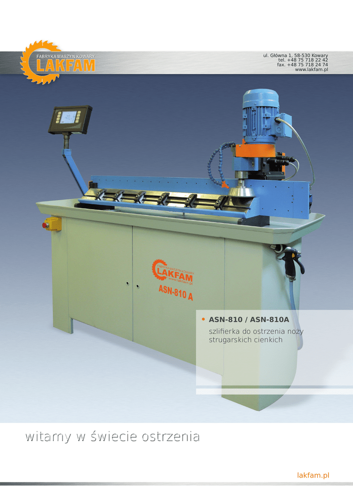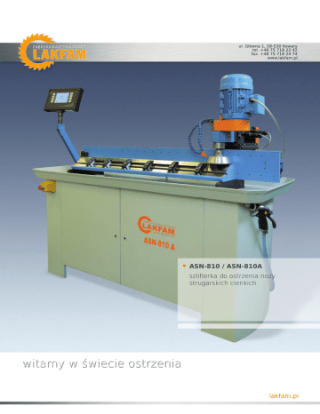 ul. Główna 1, 58-530 Kowary tel. +48 75 718 22 42 fax. +48 75 718 24 74 www.lakfam.pl • ASN-810 / ASN-810A szlifierka do ostrzenia noży strugarskich cienkich witamy w świecie ostrzenia lakfam.pl ul. Główna 1, 58-530 Kowary tel. +48 75 718 22 42 fax. +48 75 718 24 74 www.lakfam.pl ASN-810 szlifierka do ostrzenia noży strugarskich cienkich Szlifierka służy do automatycznego ostrzenia noży strugarskich mocowanych w pakiecie do 4 sztuk. Ostrzenie odbywa się czołem ściernicy garnkowej. Przybranie wióra następuje poza strefą skrawania. Wielkość, ilość przejść roboczych, wyiskrzających, prędkość przesuwu i punkty nawrotu głowicy szlifierskiej - programowane są w mikroprocesorowym sterowniku. Głowica szlifierska przesuwana jest wzdłuż łoża za pomocą napędzanej silnikiem śrubowej przekładni tocznej po prowadnicach tocznych z zamkniętym obiegiem kulek. Kompletna szlifierka ASN-810 zawiera: stolik dla kąta 40 stopni, układ chłodzenia, przystawkę skrętną L=350mm dla kątów innych niż 40 stopni. Wyposażenie dodatkowe: • stolik uchylny L=800mm, • przyrząd do nożyków DANE TECHNICZNE: Max. długość ostrzonego noża 1000 mm Max. ilość noży 4 szt. Grubość noża 3 lub 4 mm Szerokość noża 30, 35, 40 mm Prędkość obrotowa ściernicy 4500 min -1 Zakres średnic ściernicy 100-125 mm Prędkość przesuwu głowicy regulowana bezstopniowo Całkowita moc zainstalowana 0,8 kW Wymiary szlifierki: wysokość 1100 mm długość 1600 mm szerokość 600 mm ciężar ok. 150 kg Szlifierka ASN-810 w wersji specjalnej A Maszyna jest rozbudowaną wersją ASN-810 zachowującą jej wszystkie możliwości techniczne. Szlifierka służy do automatycznego ostrzenia noży przeznaczonych do perforacji, obcinania papieru lub folii, noży ryflowanych oraz brzeszczotów o ostrzach kątowych, wykonanych ze stali HSS lub HSS HM. Podział wynosi od 1 do 10 mm, maksymalna długość noża do 1000 mm z ilością zębów do 999 o zarysie kątowym lub promieniowym (zależnie od kształtu ściernicy) z korektą wzdłużną i wysokościową od 0,01 do 0,2 mm. Istnieje możliwość ostrzenia noży zbieżnych o zbiegu do 2 mm z możliwością zwiększenia. Noże można mocować bezpośrednio do stołu lub za pośrednictwem przystawki skrętnej. lakfam.pl