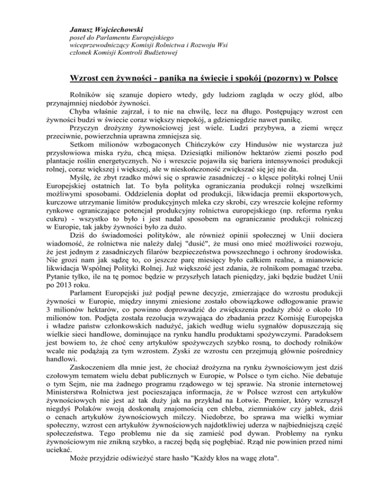 Janusz Wojciechowski poseł do Parlamentu Europejskiego wiceprzewodniczący Komisji Rolnictwa i Rozwoju Wsi członek Komisji Kontroli BudŜetowej Wzrost cen Ŝywności - panika na świecie i spokój (pozorny) w Polsce Rolników się szanuje dopiero wtedy, gdy ludziom zagląda w oczy głód, albo przynajmniej niedobór Ŝywności. Chyba właśnie zajrzał, i to nie na chwilę, lecz na długo. Postępujący wzrost cen Ŝywności budzi w świecie coraz większy niepokój, a gdzieniegdzie nawet panikę. Przyczyn droŜyzny Ŝywnościowej jest wiele. Ludzi przybywa, a ziemi wręcz przeciwnie, powierzchnia uprawna zmniejsza się. Setkom milionów wzbogaconych Chińczyków czy Hindusów nie wystarcza juŜ przysłowiowa miska ryŜu, chcą mięsa. Dziesiątki milionów hektarów ziemi poszło pod plantacje roślin energetycznych. No i wreszcie pojawiła się bariera intensywności produkcji rolnej, coraz większej i większej, ale w nieskończoność zwiększać się jej nie da. Myślę, Ŝe zbyt rzadko mówi się o sprawie zasadniczej - o klęsce polityki rolnej Unii Europejskiej ostatnich lat. To była polityka ograniczania produkcji rolnej wszelkimi moŜliwymi sposobami. Oddzielenia dopłat od produkcji, likwidacja premii eksportowych, kurczowe utrzymanie limitów produkcyjnych mleka czy skrobi, czy wreszcie kolejne reformy rynkowe ograniczające potencjał produkcyjny rolnictwa europejskiego (np. reforma rynku cukru) - wszystko to było i jest nadal sposobem na ograniczanie produkcji rolniczej w Europie, tak jakby Ŝywności było za duŜo. Dziś do świadomości polityków, ale równieŜ opinii społecznej w Unii dociera wiadomość, Ŝe rolnictwa nie naleŜy dalej "dusić", Ŝe musi ono mieć moŜliwości rozwoju, Ŝe jest jednym z zasadniczych filarów bezpieczeństwa powszechnego i ochrony środowiska. Nie grozi nam jak sądzę to, co jeszcze parę miesięcy było całkiem realne, a mianowicie likwidacja Wspólnej Polityki Rolnej. JuŜ większość jest zdania, Ŝe rolnikom pomagać trzeba. Pytanie tylko, ile na tę pomoc będzie w przyszłych latach pieniędzy, jaki będzie budŜet Unii po 2013 roku. Parlament Europejski juŜ podjął pewne decyzje, zmierzające do wzrostu produkcji Ŝywności w Europie, między innymi zniesione zostało obowiązkowe odłogowanie prawie 3 milionów hektarów, co powinno doprowadzić do zwiększenia podaŜy zbóŜ o około 10 milionów ton. Podjęta została rezolucja wzywająca do zbadania przez Komisję Europejska i władze państw członkowskich naduŜyć, jakich według wielu sygnałów dopuszczają się wielkie sieci handlowe, dominujące na rynku handlu produktami spoŜywczymi. Paradoksem jest bowiem to, Ŝe choć ceny artykułów spoŜywczych szybko rosną, to dochody rolników wcale nie podąŜają za tym wzrostem. Zyski ze wzrostu cen przejmują głównie pośrednicy handlowi. Zaskoczeniem dla mnie jest, Ŝe chociaŜ droŜyzna na rynku Ŝywnościowym jest dziś czołowym tematem wielu debat publicznych w Europie, w Polsce o tym cicho. Nie debatuje o tym Sejm, nie ma Ŝadnego programu rządowego w tej sprawie. Na stronie internetowej Ministerstwa Rolnictwa jest pocieszająca informacja, Ŝe w Polsce wzrost cen artykułów Ŝywnościowych nie jest aŜ tak duŜy jak na przykład na Łotwie. Premier, który wzruszył niegdyś Polaków swoją doskonałą znajomością cen chleba, ziemniaków czy jabłek, dziś o cenach artykułów Ŝywnościowych milczy. Niedobrze, bo sprawa ma wielki wymiar społeczny, wzrost cen artykułów Ŝywnościowych najdotkliwiej uderza w najbiedniejszą część społeczeństwa. Tego problemu nie da się zamieść pod dywan. Problemy na rynku Ŝywnościowym nie znikną szybko, a raczej będą się pogłębiać. Rząd nie powinien przed nimi uciekać. MoŜe przyjdzie odświeŜyć stare hasło "KaŜdy kłos na wagę złota".