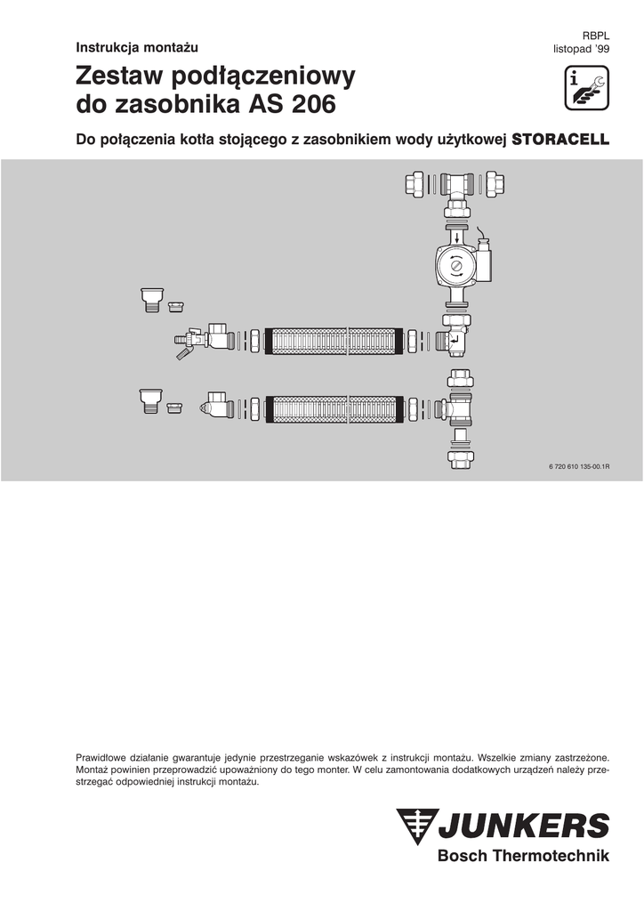 Instrukcja monta¿u RBPL listopad ’99 Zestaw pod³¹czeniowy do zasobnika AS 206 Do po³¹czenia kot³a stoj¹cego z zasobnikiem wody u¿ytkowej S T O R A C E L L 6 720 610 135-00.1R Prawid³owe dzia³anie gwarantuje jedynie przestrzeganie wskazówek z instrukcji monta¿u. Wszelkie zmiany zastrze¿one. Monta¿ powinien przeprowadziæ upowa¿niony do tego monter. W celu zamontowania dodatkowych urz¹dzeñ nale¿y przestrzegaæ odpowiedniej instrukcji monta¿u. Spis treœci: strona 1. Informacje o urz¹dzeniu 3 1.1 1.2 1.3 1.4 Zastosowanie Zakres dostawy Dane Techniczne Minimalne wymiary zabudowy 3 3 4 4 2. 2.1 2.2 Instalacja Monta¿ Pod³¹czenie elektryczne 5 5 5 3. 3.1 3.2 Uruchomienie Pompa ³aduj¹ca zasobnik Zawór zwrotny obiegu ³adowania zasobnika 6 7 2 7 1. Informacje o urz¹dzeniu 1.1 Zastosowanie Zestaw pod³¹czeniowy AZ 206 przewidziany jest do po³¹czenia kot³a stoj¹cego z zasobnikiem wody u¿ytkowej z przy³¹czeniami R 3/4", R 1" lub R 11/4". 1.2 Zakres dostawy 6 720 610 135-01.1R Rys. 1 Elementy sk³adowe zestawu: Przy³¹cza: 1 2 3 4 5 6 7 8 9 10 11 HV HR KV KR VSp RSp E 12 13 14 15 16 17 18 19 20 œrubunek pod³¹czeniowy R1" do zasilenia c.o. kot³a uszczelka trójnik do pod³¹czenia zasilenia c.o. ze œrubunkiem pompa ³aduj¹ca zasobnik z kablem pod³¹czeniowym œrubunek do pod³¹czenia zasilenia instalacji c.o. pierœcieñ nakrêtka z³¹czkowa koñcówka do wê¿a izolacyjnego elastyczna rura falista ze stali szlachetnej w¹¿ izolacyjny kolano 90° na zasileniu R 1" od zasobnika z kurkiem spustowym redukcja na R 3/4" do kolana 90° mufka redukcyjna na R 11/4" do kolana 90° kolano 90° na powrocie R 1" od zasobnika z rêcznym zaworem odpowietrzaj¹cym trójnik na powrocie do zasobnika œrubunek do pod³¹czenia powrotu instalacji c.o. œrubunek do pod³¹czenia powrotu c.o. z zaworem odcinaj¹cym zawór zwrotny z uszczelnieniem do powrotu instalacji c.o. kolano z zaworem zwrotnym do obiegu ³adowania zasobnika zaœlepka do zamkniêcia zasilenia c.o. (jeœli wymagane) zasilanie instalacji c.o. R 1" powrót z instalacji c.o. R 1" zasilanie c.o. kot³a powrót c.o. kot³a zasilanie zasobnika R 3/4" lub R 1' lub R 11/4" powrót zasobnika R 3/4" lub R 1' lub R 11/4" spust Przy pod³¹czeniu do obiegu instalacji c.o. potrzebne s¹ œrubunki pod³¹czeniowe (5) i (16). Przy zastosowaniu innego osprzêtu pod³¹czeniowego, nie stosuje siê tych kszta³tek Jeœli nie pod³¹czamy do instalacji c.o., zaœlepiamy koñcówkê przy pomocy nakrêtki (5) i kr¹¿ka. 3 1.3 Dane techniczne 1.4 Pompa ³adowania zasobnika UPS 25-60, R1" Napiêcie zasilania Minimalne wymiary zabudowy 1.4.1 z zasobnikiem SK 130-1E 220V AC Prze³¹cznik w poz. I (krzywa 1) Pr¹d znamionowy Moc znamionowa Liczba obrotów 0,17 A 35 W 700 U/min Prze³¹cznik w poz. II (krzywa 2) Pr¹d znamionowy Moc znamionowa Liczba obrotów 0,3 A 65 W 1100 U/min Prze³¹cznik w poz. III (krzywa 3) Pr¹d znamionowy Moc znamionowa Liczba obrotów 0,45 A 100 W 1800 U/min Stopieñ ochrony IP42 6 720 610 135-02.1R Rys. 3 1.4.2 z zasobnikiem cylindrycznym SK.../SO... H 0,7 (bar) 0,6 UPS 25-60, R1" max. 110°C 0,5 0,4 3 0,3 0,2 2 0,1 1 0,5 1,0 1,5 2,0 2,5 3,0 3,5 4,0 4,5 5,0 Q (m3/h) 3934-03.1J Rys. 2: Charakterystyka pompy 6 720 610 135-03.1R Rys. 4 1.4.3 z zasobnikiem le¿¹cym SL... 6 720 610 135-04.1R Rys. 5 4 2. Instalacja 2.1 Monta¿ Rozdzia³ 1.4 opisuje minimalne wymiary zabudowy urz¹dzenia w miejscu monta¿u. Wszystkie elementy zestawu ³¹czone na sta³e, s¹ wyposa¿one w uszczelki. Wykonanie pod³¹czeñ: Rozdzia³ 1.2 opisuje pojedyncze czêœci sk³adowe zestawu i pod³¹czenia. 6 720 610 135-07.1R Rys. 6: Przyk³ad monta¿u z zasobnikiem SK 130-1E Przygotowanie rury falistej: Dopasowaæ d³ugoœæ rury (9) odpowiednio do pozycji zasobnika: 1. Oznaczyæ wymagan¹ d³ugoœæ rury 2. Doci¹æ rurê (9) we wg³êbieniu przy pomocy obcinarki do rur lub pi³ki do metalu. 6 720 610 136-06.1R Rys. 8: Kompletowanie koñcówki rury falistej Wykonanie po³¹czenia kocio³ – zasobnik - Œrubunki na rurze falistej dobrze naci¹gn¹æ najpierw bez uszczelek, dziêki czemu pierwsza fala rury zostanie sprasowana na powierzchni uszczelniaj¹cej. 6 720 610 136-05.1R Rys. 7: Skracanie rury falistej (9) 3. Oczyœciæ powierzchniê ciêcia. 4. Dopasowaæ w¹¿ izolacyjny do d³ugoœci rury falistej. 5. W¹¿ izolacyjny (10) z koñcówk¹ (8) i przeciwnakrêtk¹ (7) nasun¹æ na rurê falist¹ i wcisn¹æ kr¹¿ek (6) w pierwsze wg³êbienie rury falistej. 6. Przeciwnakrêtkê (7) przesun¹æ przez kr¹¿ek (6) i przesun¹æ w¹¿ izolacyjny (10) razem z koñcówk¹ (8). 7. Powtórzyæ czynnoœci dla pozosta³ych koñcówek wê¿a. Przy nie stosowaniu siê do powy¿szych wymagañ uszczelka (2) mo¿e zostaæ uszkodzona. Nie zakrywaæ pod³¹czeñ do urz¹dzeñ przez rurê falist¹. Odpowietrzenie: – Rury faliste uk³adaæ w sposób umo¿liwiaj¹cy ich odpowietrzenie. Przy trudnych warunkach odpowietrzenia: – Za³¹czone rêczne zawory odpowietrzaj¹ce wymieniæ na automatyczne p³ywakowe zawory odpowietrzaj¹ce. – Przewidzieæ miejsca lub zbiorniczki odpowietrzaj¹ce do przejmowania powietrza z instalacji. 5 2.2 Pod³¹czenie elektryczne Przed pod³¹czeniem elektrycznym, od³¹czyæ napiêcie od kot³a. 1. U³o¿yæ kabel pod³¹czeniowy przez przewidziany do tego przepust w tylnej œciance kot³a. 2. Odci¹¿yæ kabel pod³¹czeniowy w kotle (zaciski odci¹¿aj¹ce). 3. Kolorowe przewody kabla pod³¹czeniowego przy³¹czyæ w sposób nastêpuj¹cy: br¹zowy niebieski zielono/¿ó³ty = L (faza) = N (neutralny) = PE (ochronny) W instrukcji instalacji kot³a opisany jest sposób pod³¹czenia pompy ³aduj¹cej zasobnika. 6 3 Uruchomienie 3.1 Pompa ³aduj¹ca zasobnika W ¿adnym wypadku nie uruchamiaæ pompy bez wody w instalacji. – Aby polepszyæ wymianê ciep³a miêdzy powierzchni¹ grzewcz¹ wê¿ownicy zasobnika a wod¹ u¿ytkow¹, nastawiæ maksymaln¹ moc pompy na pozycjê prze³¹cznika III. Charakterystyka 