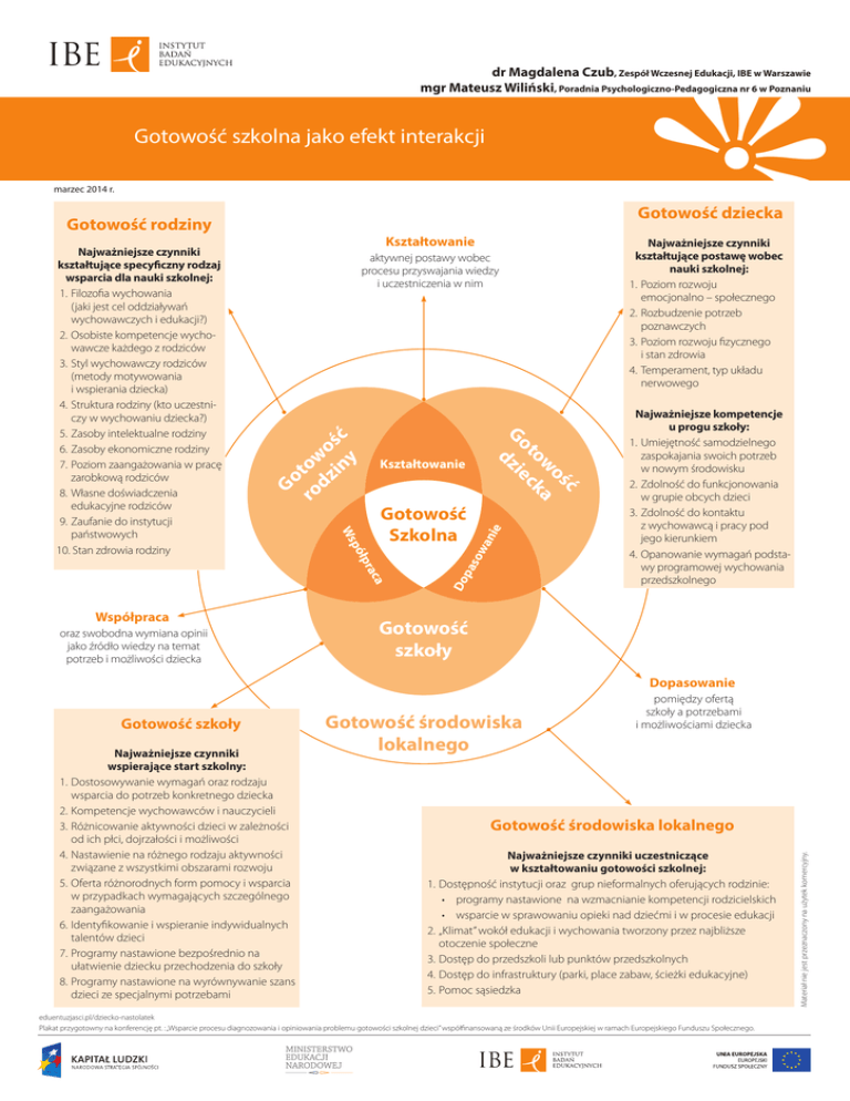 dr Magdalena Czub, Zespół Wczesnej Edukacji, IBE w Warszawie mgr Mateusz Wiliński, Poradnia Psychologiczno-Pedagogiczna nr 6 w Poznaniu Gotowość szkolna jako efekt interakcji marzec 2014 r. Gotowość dziecka Gotowość rodziny Kształtowanie oraz swobodna wymiana opinii jako źródło wiedzy na temat potrzeb i możliwości dziecka pa Do a rac ółp Współpraca so wa n Gotowość Szkolna ie Kształtowanie ć oś w a to ck Go dzie Go ro tow dz o in ść y aktywnej postawy wobec procesu przyswajania wiedzy i uczestniczenia w nim p Ws Najważniejsze czynniki kształtujące specyficzny rodzaj wsparcia dla nauki szkolnej: 1.Filozofia wychowania (jaki jest cel oddziaływań wychowawczych i edukacji?) 2.Osobiste kompetencje wychowawcze każdego z rodziców 3.Styl wychowawczy rodziców (metody motywowania i wspierania dziecka) 4.Struktura rodziny (kto uczestniczy w wychowaniu dziecka?) 5.Zasoby intelektualne rodziny 6.Zasoby ekonomiczne rodziny 7.Poziom zaangażowania w pracę zarobkową rodziców 8.Własne doświadczenia edukacyjne rodziców 9.Zaufanie do instytucji państwowych 10. Stan zdrowia rodziny Najważniejsze czynniki kształtujące postawę wobec nauki szkolnej: 1.Poziom rozwoju emocjonalno – społecznego 2.Rozbudzenie potrzeb poznawczych 3.Poziom rozwoju fizycznego i stan zdrowia 4.Temperament, typ układu nerwowego Najważniejsze kompetencje u progu szkoły: 1.Umiejętność samodzielnego zaspokajania swoich potrzeb w nowym środowisku 2.Zdolność do funkcjonowania w grupie obcych dzieci 3.Zdolność do kontaktu z wychowawcą i pracy pod jego kierunkiem 4.Opanowanie wymagań podstawy programowej wychowania przedszkolnego Gotowość szkoły Dopasowanie Najważniejsze czynniki wspierające start szkolny: 1.Dostosowywanie wymagań oraz rodzaju wsparcia do potrzeb konkretnego dziecka 2.Kompetencje wychowawców i nauczycieli 3.Różnicowanie aktywności dzieci w zależności od ich płci, dojrzałości i możliwości 4.Nastawienie na różnego rodzaju aktywności związane z wszystkimi obszarami rozwoju 5.Oferta różnorodnych form pomocy i wsparcia w przypadkach wymagających szczególnego zaangażowania 6.Identyfikowanie i wspieranie indywidualnych talentów dzieci 7.Programy nastawione bezpośrednio na ułatwienie dziecku przechodzenia do szkoły 8.Programy nastawione na wyrównywanie szans dzieci ze specjalnymi potrzebami Gotowość środowiska lokalnego Gotowość środowiska lokalnego Najważniejsze czynniki uczestniczące w kształtowaniu gotowości szkolnej: 1.Dostępność instytucji oraz grup nieformalnych oferujących rodzinie: • programy nastawione na wzmacnianie kompetencji rodzicielskich • wsparcie w sprawowaniu opieki nad dziećmi i w procesie edukacji 2.„Klimat” wokół edukacji i wychowania tworzony przez najbliższe otoczenie społeczne 3.Dostęp do przedszkoli lub punktów przedszkolnych 4.Dostęp do infrastruktury (parki, place zabaw, ścieżki edukacyjne) 5.Pomoc sąsiedzka eduentuzjasci.pl/dziecko-nastolatek Plakat przygotowny na konferencję pt. : „Wsparcie procesu diagnozowania i opiniowania problemu gotowości szkolnej dzieci” współfinansowaną ze środków Unii Europejskiej w ramach Europejskiego Funduszu Społecznego. Materiał nie jest przeznaczony na użytek komercyjny. Gotowość szkoły pomiędzy ofertą szkoły a potrzebami i możliwościami dziecka