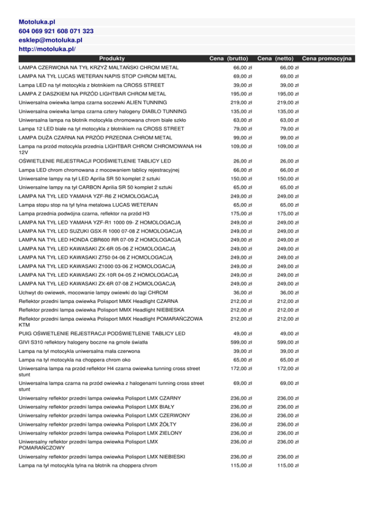 Motoluka.pl 604 069 921 608 071 323 [email protected] http://motoluka.pl/ Produkty Cena (brutto) Cena (netto) LAMPA CZERWONA NA TYŁ KRZYŻ MALTAŃSKI CHROM METAL 66,00 zł 66,00 zł LAMPA NA TYŁ LUCAS WETERAN NAPIS STOP CHROM METAL 69,00 zł 69,00 zł Lampa LED na tył motocykla z błotnikiem na CROSS STREET 39,00 zł 39,00 zł LAMPA Z DASZKIEM NA PRZÓD LIGHTBAR CHROM METAL 195,00 zł 195,00 zł Uniwersalna owiewka lampa czarna soczewki ALIEN TUNNING 219,00 zł 219,00 zł Uniwersalna owiewka lampa czarna cztery halogeny DIABLO TUNNING 135,00 zł 135,00 zł Uniwersalna lampa na błotnik motocykla chromowana chrom białe szkło 63,00 zł 63,00 zł Lampa 12 LED białe na tył motocykla z błotnikiem na CROSS STREET 79,00 zł 79,00 zł LAMPA DUŻA CZARNA NA PRZÓD PRZEDNIA CHROM METAL 99,00 zł 99,00 zł 109,00 zł 109,00 zł OŚWIETLENIE REJESTRACJI PODŚWIETLENIE TABLICY LED 26,00 zł 26,00 zł Lampa LED chrom chromowana z mocowaniem tablicy rejestracyjnej 66,00 zł 66,00 zł 150,00 zł 150,00 zł 65,00 zł 65,00 zł LAMPA NA TYŁ LED YAMAHA YZF-R6 Z HOMOLOGACJĄ 249,00 zł 249,00 zł Lampa stopu stop na tył tylna metalowa LUCAS WETERAN 65,00 zł 65,00 zł Lampa przednia podwójna czarna, reflektor na przód H3 175,00 zł 175,00 zł LAMPA NA TYŁ LED YAMAHA YZF-R1 1000 09- Z HOMOLOGACJĄ 249,00 zł 249,00 zł LAMPA NA TYŁ LED SUZUKI GSX-R 1000 07-08 Z HOMOLOGACJĄ 249,00 zł 249,00 zł LAMPA NA TYŁ LED HONDA CBR600 RR 07-09 Z HOMOLOGACJĄ 249,00 zł 249,00 zł LAMPA NA TYŁ LED KAWASAKI ZX-6R 05-06 Z HOMOLOGACJĄ 249,00 zł 249,00 zł LAMPA NA TYŁ LED KAWASAKI Z750 04-06 Z HOMOLOGACJĄ 249,00 zł 249,00 zł LAMPA NA TYŁ LED KAWASAKI Z1000 03-06 Z HOMOLOGACJĄ 249,00 zł 249,00 zł LAMPA NA TYŁ LED KAWASAKI ZX-10R 04-05 Z HOMOLOGACJĄ 249,00 zł 249,00 zł LAMPA NA TYŁ LED KAWASAKI ZX-6R 07-08 Z HOMOLOGACJĄ 249,00 zł 249,00 zł 36,00 zł 36,00 zł Reflektor przedni lampa owiewka Polisport MMX Headlight CZARNA 212,00 zł 212,00 zł Reflektor przedni lampa owiewka Polisport MMX Headlight NIEBIESKA 212,00 zł 212,00 zł Reflektor przedni lampa owiewka Polisport MMX Headlight POMARAŃCZOWA KTM 212,00 zł 212,00 zł 49,00 zł 49,00 zł Lampa na przód motocykla przednia LIGHTBAR CHROM CHROMOWANA H4 12V Uniwersalne lampy na tył LED Aprilia SR 50 komplet 2 sztuki Uniwersalne lampy na tył CARBON Aprilia SR 50 komplet 2 sztuki Uchwyt do owiewek, mocowanie lampy owiewki do lagi CHROM PUIG OŚWIETLENIE REJESTRACJI PODŚWIETLENIE TABLICY LED GIVI S310 reflektory halogeny boczne na gmole światła 599,00 zł 599,00 zł Lampa na tył motocykla uniwersalna mała czerwona 39,00 zł 39,00 zł Lampa na tył motocykla na choppera chrom oko 65,00 zł 65,00 zł 172,00 zł 172,00 zł 69,00 zł 69,00 zł Uniwersalny reflektor przedni lampa owiewka Polisport LMX CZARNY 236,00 zł 236,00 zł Uniwersalny reflektor przedni lampa owiewka Polisport LMX BIAŁY 236,00 zł 236,00 zł Uniwersalny reflektor przedni lampa owiewka Polisport LMX CZERWONY 236,00 zł 236,00 zł Uniwersalny reflektor przedni lampa owiewka Polisport LMX ŻÓŁTY 236,00 zł 236,00 zł Uniwersalny reflektor przedni lampa owiewka Polisport LMX ZIELONY 236,00 zł 236,00 zł Uniwersalny reflektor przedni lampa owiewka Polisport LMX POMARAŃCZOWY 236,00 zł 236,00 zł Uniwersalny reflektor przedni lampa owiewka Polisport LMX NIEBIESKI 236,00 zł 236,00 zł Lampa na tył motocykla tylna na błotnik na choppera chrom 115,00 zł 115,00 zł Uniwersalna lampa na przód reflektor H4 czarna owiewka tunning cross street stunt Uniwersalna lampa czarna na przód owiewka z halogenami tunning cross street stunt Cena promocyjna