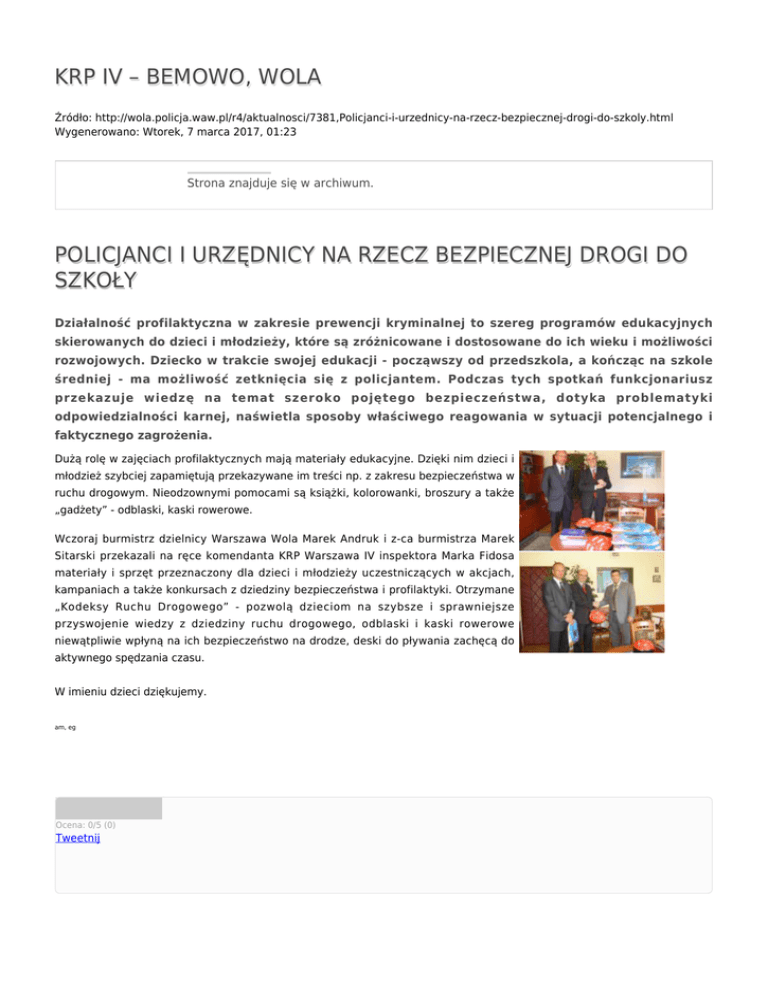 KRP IV – BEMOWO, WOLA Źródło: http://wola.policja.waw.pl/r4/aktualnosci/7381,Policjanci-i-urzednicy-na-rzecz-bezpiecznej-drogi-do-szkoly.html Wygenerowano: Wtorek, 7 marca 2017, 01:23 Strona znajduje się w archiwum. POLICJANCI I URZĘDNICY NA RZECZ BEZPIECZNEJ DROGI DO SZKOŁY Działalność profilaktyczna w zakresie prewencji kryminalnej to szereg programów edukacyjnych skierowanych do dzieci i młodzieży, które są zróżnicowane i dostosowane do ich wieku i możliwości rozwojowych. Dziecko w trakcie swojej edukacji - począwszy od przedszkola, a kończąc na szkole średniej - ma możliwość zetknięcia się z policjantem. Podczas tych spotkań funkcjonariusz przekazuje wiedzę na temat szeroko pojętego bezpieczeństwa, dotyka problematyki odpowiedzialności karnej, naświetla sposoby właściwego reagowania w sytuacji potencjalnego i faktycznego zagrożenia. Dużą rolę w zajęciach profilaktycznych mają materiały edukacyjne. Dzięki nim dzieci i młodzież szybciej zapamiętują przekazywane im treści np. z zakresu bezpieczeństwa w ruchu drogowym. Nieodzownymi pomocami są książki, kolorowanki, broszury a także „gadżety” - odblaski, kaski rowerowe. Wczoraj burmistrz dzielnicy Warszawa Wola Marek Andruk i z-ca burmistrza Marek Sitarski przekazali na ręce komendanta KRP Warszawa IV inspektora Marka Fidosa materiały i sprzęt przeznaczony dla dzieci i młodzieży uczestniczących w akcjach, kampaniach a także konkursach z dziedziny bezpieczeństwa i profilaktyki. Otrzymane „Kodeksy Ruchu Drogowego” - pozwolą dzieciom na szybsze i sprawniejsze przyswojenie wiedzy z dziedziny ruchu drogowego, odblaski i kaski rowerowe niewątpliwie wpłyną na ich bezpieczeństwo na drodze, deski do pływania zachęcą do aktywnego spędzania czasu. W imieniu dzieci dziękujemy. am, eg Ocena: 0/5 (0) Tweetnij