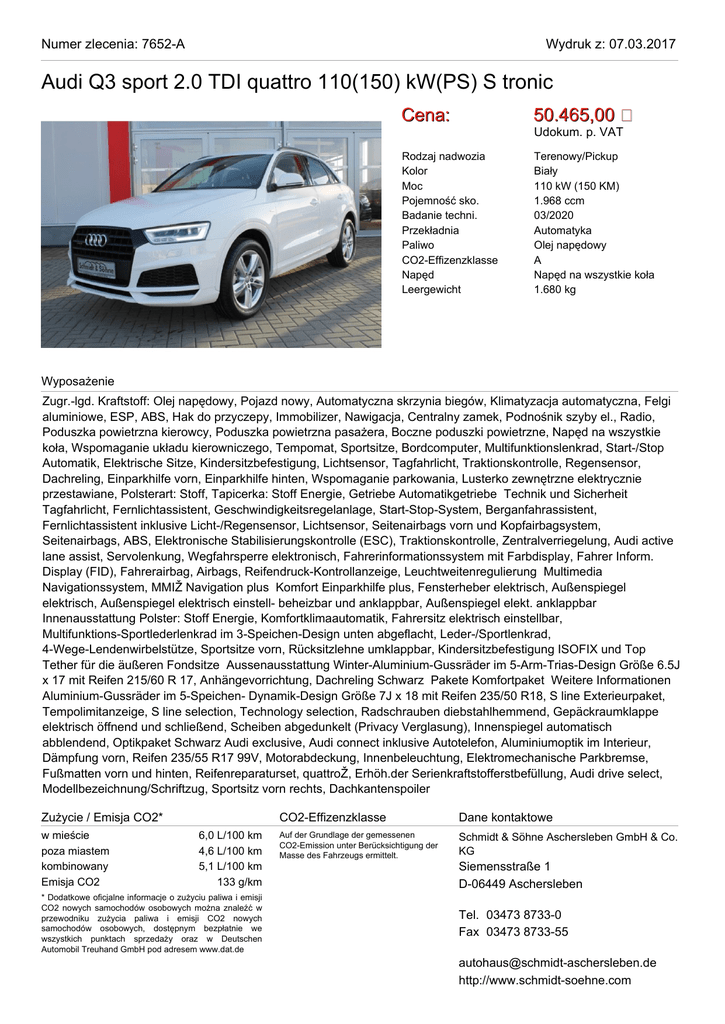 Numer zlecenia: 7652-A Wydruk z: 07.03.2017 Audi Q3 sport 2.0 TDI quattro 110(150) kW(PS) S tronic Cena: 50.465,00 Rodzaj nadwozia Kolor Moc Pojemność sko. Badanie techni. Przekładnia Paliwo CO2-Effizenzklasse Napęd Leergewicht Terenowy/Pickup Biały 110 kW (150 KM) 1.968 ccm 03/2020 Automatyka Olej napędowy A Napęd na wszystkie koła 1.680 kg Udokum. p. VAT Wyposażenie Zugr.-lgd. Kraftstoff: Olej napędowy, Pojazd nowy, Automatyczna skrzynia biegów, Klimatyzacja automatyczna, Felgi aluminiowe, ESP, ABS, Hak do przyczepy, Immobilizer, Nawigacja, Centralny zamek, Podnośnik szyby el., Radio, Poduszka powietrzna kierowcy, Poduszka powietrzna pasażera, Boczne poduszki powietrzne, Napęd na wszystkie koła, Wspomaganie układu kierowniczego, Tempomat, Sportsitze, Bordcomputer, Multifunktionslenkrad, Start-/Stop Automatik, Elektrische Sitze, Kindersitzbefestigung, Lichtsensor, Tagfahrlicht, Traktionskontrolle, Regensensor, Dachreling, Einparkhilfe vorn, Einparkhilfe hinten, Wspomaganie parkowania, Lusterko zewnętrzne elektrycznie przestawiane, Polsterart: Stoff, Tapicerka: Stoff Energie, Getriebe Automatikgetriebe Technik und Sicherheit Tagfahrlicht, Fernlichtassistent, Geschwindigkeitsregelanlage, Start-Stop-System, Berganfahrassistent, Fernlichtassistent inklusive Licht-/Regensensor, Lichtsensor, Seitenairbags vorn und Kopfairbagsystem, Seitenairbags, ABS, Elektronische Stabilisierungskontrolle (ESC), Traktionskontrolle, Zentralverriegelung, Audi active lane assist, Servolenkung, Wegfahrsperre elektronisch, Fahrerinformationssystem mit Farbdisplay, Fahrer Inform. Display (FID), Fahrerairbag, Airbags, Reifendruck-Kontrollanzeige, Leuchtweitenregulierung Multimedia Navigationssystem, MMIŽ Navigation plus Komfort Einparkhilfe plus, Fensterheber elektrisch, Außenspiegel elektrisch, Außenspiegel elektrisch einstell- beheizbar und anklappbar, Außenspiegel elekt. anklappbar Innenausstattung Polster: Stoff Energie, Komfortklimaautomatik, Fahrersitz elektrisch einstellbar, Multifunktions-Sportlederlenkrad im 3-Speichen-Design unten abgeflacht, Leder-/Sportlenkrad, 4-Wege-Lendenwirbelstütze, Sportsitze vorn, Rücksitzlehne umklappbar, Kindersitzbefestigung ISOFIX und Top Tether für die äußeren Fondsitze Aussenausstattung Winter-Aluminium-Gussräder im 5-Arm-Trias-Design Größe 6.5J x 17 mit Reifen 215/60 R 17, Anhängevorrichtung, Dachreling Schwarz Pakete Komfortpaket Weitere Informationen Aluminium-Gussräder im 5-Speichen- Dynamik-Design Größe 7J x 18 mit Reifen 235/50 R18, S line Exterieurpaket, Tempolimitanzeige, S line selection, Technology selection, Radschrauben diebstahlhemmend, Gepäckraumklappe elektrisch öffnend und schließend, Scheiben abgedunkelt (Privacy Verglasung), Innenspiegel automatisch abblendend, Optikpaket Schwarz Audi exclusive, Audi connect inklusive Autotelefon, Aluminiumoptik im Interieur, Dämpfung vorn, Reifen 235/55 R17 99V, Motorabdeckung, Innenbeleuchtung, Elektromechanische Parkbremse, Fußmatten vorn und hinten, Reifenreparaturset, quattroŽ, Erhöh.der Serienkraftstofferstbefüllung, Audi drive select, Modellbezeichnung/Schriftzug, Sportsitz vorn rechts, Dachkantenspoiler Zużycie / Emisja CO2* w mieście poza miastem kombinowany Emisja CO2 6,0 L/100 km 4,6 L/100 km 5,1 L/100 km 133 g/km * Dodatkowe oficjalne informacje o zużyciu paliwa i emisji CO2 nowych samochodów osobowych można znaleźć w przewodniku zużycia paliwa i emisji CO2 nowych samochodów osobowych, dostępnym bezpłatnie we wszystkich punktach sprzedaży oraz w Deutschen Automobil Treuhand GmbH pod adresem www.dat.de CO2-Effizenzklasse Dane kontaktowe Auf der Grundlage der gemessenen CO2-Emission unter Berücksichtigung der Masse des Fahrzeugs ermittelt. Schmidt & Söhne Aschersleben GmbH & Co. KG Siemensstraße 1 D-06449 Aschersleben Tel. 03473 8733-0 Fax 03473 8733-55 [email protected] http://www.schmidt-soehne.com Numer zlecenia: 7652-A Wydruk z: 07.03.2017 Audi Q3 sport 2.0 TDI quattro 110(150) kW(PS) S tronic Numer zlecenia: 7652-A Wydruk z: 07.03.2017 Audi Q3 sport 2.0 TDI quattro 110(150) kW(PS) S tronic Numer zlecenia: 7652-A Wydruk z: 07.03.2017 Audi Q3 sport 2.0 TDI quattro 110(150) kW(PS) S tronic