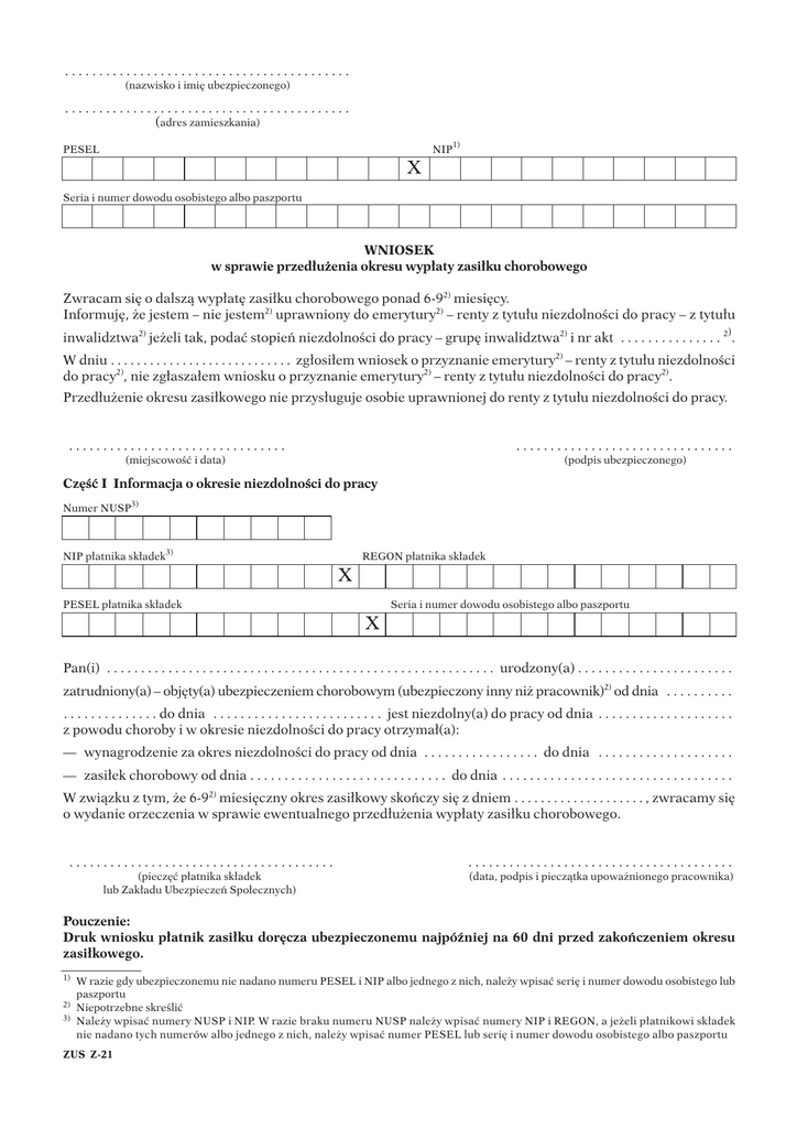 .......................................... (nazwisko i imi´ ubezpieczonego) .......................................... (adres zamieszkania) 1) PESEL NIP X Seria i numer dowodu osobistego albo paszportu WNIOSEK w sprawie przed∏u˝enia okresu wyp∏aty zasi∏ku chorobowego Zwracam si´ o dalszà wyp∏at´ zasi∏ku chorobowego ponad 6-92) miesi´cy. Informuj´, ˝e jestem – nie jestem2) uprawniony do emerytury2) – renty z tytu∏u niezdolnoÊci do pracy – z tytu∏u ) inwalidztwa2) je˝eli tak, podaç stopieƒ niezdolnoÊci do pracy – grup´ inwalidztwa2) i nr akt . . . . . . . . . . . . . . . 2 . W dniu . . . . . . . . . . . . . . . . . . . . . . . . . . . . zg∏osi∏em wniosek o przyznanie emerytury2) – renty z tytu∏u niezdolnoÊci do pracy2), nie zg∏asza∏em wniosku o przyznanie emerytury2) – renty z tytu∏u niezdolnoÊci do pracy2). Przed∏u˝enie okresu zasi∏kowego nie przys∏uguje osobie uprawnionej do renty z tytu∏u niezdolnoÊci do pracy. ................................ ................................ (miejscowoÊç i data) (podpis ubezpieczonego) Cz´Êç I Informacja o okresie niezdolnoÊci do pracy 3) Numer NUSP 3) NIP p∏atnika sk∏adek REGON p∏atnika sk∏adek X PESEL p∏atnika sk∏adek Seria i numer dowodu osobistego albo paszportu X Pan(i) . . . . . . . . . . . . . . . . . . . . . . . . . . . . . . . . . . . . . . . . . . . . . . . . . . . . . . . . . urodzony(a) . . . . . . . . . . . . . . . . . . . . . . . zatrudniony(a) – obj´ty(a) ubezpieczeniem chorobowym (ubezpieczony inny ni˝ pracownik)2) od dnia . . . . . . . . . . . . . . . . . . . . . . . . do dnia . . . . . . . . . . . . . . . . . . . . . . . . . jest niezdolny(a) do pracy od dnia . . . . . . . . . . . . . . . . . . . . z powodu choroby i w okresie niezdolnoÊci do pracy otrzyma∏(a): — wynagrodzenie za okres niezdolnoÊci do pracy od dnia . . . . . . . . . . . . . . . . . do dnia . . . . . . . . . . . . . . . . . . . . — zasi∏ek chorobowy od dnia . . . . . . . . . . . . . . . . . . . . . . . . . . . . . do dnia . . . . . . . . . . . . . . . . . . . . . . . . . . . . . . . . . . W zwiàzku z tym, ˝e 6-92) miesi´czny okres zasi∏kowy skoƒczy si´ z dniem . . . . . . . . . . . . . . . . . . . . , zwracamy si´ o wydanie orzeczenia w sprawie ewentualnego przed∏u˝enia wyp∏aty zasi∏ku chorobowego. ....................................... ....................................... (piecz´ç p∏atnika sk∏adek lub Zak∏adu Ubezpieczeƒ Spo∏ecznych) (data, podpis i pieczàtka upowa˝nionego pracownika) Pouczenie: Druk wniosku p∏atnik zasi∏ku dor´cza ubezpieczonemu najpóêniej na 60 dni przed zakoƒczeniem okresu zasi∏kowego. 1) 2) 3) W razie gdy ubezpieczonemu nie nadano numeru PESEL i NIP albo jednego z nich, nale˝y wpisaç seri´ i numer dowodu osobistego lub paszportu Niepotrzebne skreÊliç Nale˝y wpisaç numery NUSP i NIP. W razie braku numeru NUSP nale˝y wpisaç numery NIP i REGON, a je˝eli p∏atnikowi sk∏adek nie nadano tych numerów albo jednego z nich, nale˝y wpisaç numer PESEL lub seri´ i numer dowodu osobistego albo paszportu ZUS Z-21 Cz´Êç II Wniosek lekarza leczàcego ............................................ . . . . . . . . . . . . . . . . . . . . . . , dnia . . . . . . . . . . . . (piecz´ç zak∏adu opieki zdrowotnej lub gabinetu prywatnego) 1. Rozpoznanie (w j´zyku polskim) Choroba podstawowa Choroby wspó∏istniejàce 2. Opis przebiegu choroby, stosowanego leczenia i rehabilitacji 3. Wyniki badaƒ dodatkowych 4. Badany(a) jest nadal niezdolny(a) do pracy z powodu choroby lecz dalsze leczenie lub rehabilitacja rokujà 4. odzyskanie zdolnoÊci do pracy po wykorzystaniu przed∏u˝onego okresu zasi∏kowego: – tak – nie1) 5. Uzasadnienie wniosku 6. Ubezpieczony jest: zdolny(a) – niezdolny(a)1) do odbycia podró˝y na badanie przez lekarza orzecznika 6. (konsultanta) ZUS z powodu ................................ ................................ (miejscowoÊç i data) (podpis i piecz´ç lekarza leczàcego) (nr identyfikacyjny nadany przez ZUS) Lekarz wyst´pujàcy z wnioskiem zobowiàzany jest do do∏àczenia do wniosku dokumentacji leczenia oraz wyników badaƒ pomocniczych uzasadniajàcych celowoÊç przed∏u˝enia okresu zasi∏kowego. Cz´Êç III Orzeczenie lekarza orzecznika Zak∏adu Ubezpieczeƒ Spo∏ecznych Stwierdzam, ˝e przed∏u˝enie okresu zasi∏kowego: – jest – nie jest1) celowe 1) Niepotrzebne skreÊliç . . . . . . . . . . . . . . . . . . . . . . . . . . . . , dnia . . . . . . . . . . . . . . . . . . ................................ (podpis i piecz´ç lekarza orzecznika) ZUS Z-21