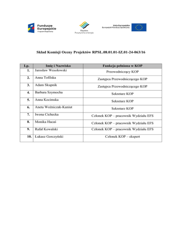 Skład Komisji Oceny Projektów RPSL.08.01.01-IZ.01-24-063/16 Lp. 1. Imię i Nazwisko Jarosław Wesołowski Funkcja pełniona w KOP Przewodniczący KOP 2. Anna Tofilska Zastępca Przewodniczącego KOP 3. Adam Skupnik Zastępca Przewodniczącego KOP 4. Barbara Szymocha Sekretarz KOP 5. Anna Kocimska Sekretarz KOP 6. Aneta Woźniczak-Kaniut Sekretarz KOP 7. Iwona Cichecka Członek KOP – pracownik Wydziału EFS 8. Monika Hacaś Członek KOP – pracownik Wydziału EFS 9. Rafał Kowalski Członek KOP – pracownik Wydziału EFS 10. Łukasz Gorczyński Członek KOP – ekspert