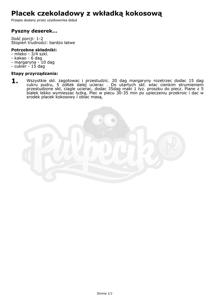 Placek czekoladowy z wkładką kokosową Przepis dodany przez użytkownika diduś Pyszny deserek... Ilość porcji: 1-2 Stopień trudności: bardzo łatwe Potrzebne składniki: - mleko - 3/4 szkl. - kakao - 6 dag - margaryna - 10 dag - cukier - 15 dag Etapy przyrządzania: 1. Wszystkie skł. zagotowac i przestudzic. 20 dag margaryny rozetrzec dodac 15 dag cukru pudru, 5 zółtek dalej ucierac . Do utartych skł. wlac cienkim strumieniem przestudzone skł, ciagle ucierac, dodac 35dag maki 1 łyz. proszku do piecz. Piane z 5 białek lekko wymieszac łyżką. Piec w piecu 30-35 min po upieczeniu przekroic i dac w srodek placek kokosowy i oblac masą. Strona 1/1