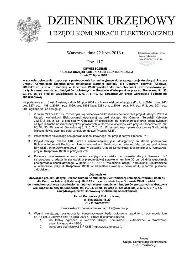 DZIENNIK URZĘDOWY URZĘDU KOMUNIKACJI ELEKTRONICZNEJ Warszawa, dnia 22 lipca 2016 r. Elektronicznie podpisany przez: Dariusz Kołtunowicz Data: 2016-07-22 12:13:54 Poz. 117 OBWIESZCZENIE PREZESA URZĘDU KOMUNIKACJI ELEKTRONICZNEJ z dnia 20 lipca 2016 r. w sprawie ogłoszenia rozpoczęcia postępowania konsultacyjnego dotyczącego projektu decyzji Prezesa Urzędu Komunikacji Elektronicznej ustalającej warunki dostępu dla Centrum Telewizji Kablowej JIM-SAT sp. z o.o. z siedzibą w Gorzowie Wielkopolskim do nieruchomości oraz posadowionych na tych nieruchomościach budynków położonych w Gorzowie Wielkopolskim przy ul. Słonecznej 91, 92, 93, 94, 95, 96 oraz ul. Gwiaździstej 3, 5, 6, 7, 8, 10, 12, zarządzanych przez Gorzowską Spółdzielnię Mieszkaniową Na podstawie art. 16 ust. 1 ustawy z dnia 16 lipca 2004 r. - Prawo telekomunikacyjne (Dz. U. z 2014 r. poz. 243, poz. 827 i poz. 1198, z 2015 r. poz. 1069, poz. 1893 i poz. 2281 oraz z 2016 r. poz. 147, poz. 542, poz. 903 i poz. 904) ogłasza się, co następuje: 1. Z dniem 22 lipca 2016 r. rozpoczyna się postępowanie konsultacyjne dotyczące projektu decyzji Prezesa Urzędu Komunikacji Elektronicznej ustalającej warunki dostępu dla Centrum Telewizji Kablowej JIM-SAT sp. z o.o. z siedzibą w Gorzowie Wielkopolskim do nieruchomości oraz posadowionych na tych nieruchomościach budynków położonych w Gorzowie Wielkopolskim przy ul. Słonecznej 91, 92, 93, 94, 95, 96 oraz ul. Gwiaździstej 3, 5, 6, 7, 8, 10, 12, zarządzanych przez Gorzowską Spółdzielnię Mieszkaniową, zwanego dalej „projektem decyzji Prezesa UKE”. 2. Przedmiotem niniejszego postępowania konsultacyjnego jest projekt decyzji Prezesa UKE. 3. Projekt decyzji Prezesa UKE, wraz z uzasadnieniem, jest udostępniony na stronie podmiotowej Biuletynu Informacji Publicznej Urzędu Komunikacji Elektronicznej, zwanej dalej „stroną podmiotową BIP UKE”, (http://www.uke.gov.pl) oraz w siedzibie Urzędu Komunikacji Elektronicznej w Warszawie, przy ul. Kasprzaka 18/20, w pokoju nr 220. 4. Podmioty zainteresowane wyrażeniem swojego stanowiska do projektu decyzji Prezesa UKE są proszone o składanie stanowisk w przedmiotowej sprawie w terminie 30 dni od dnia rozpoczęcia postępowania konsultacyjnego, w godz. 8.15 - 16.15, w siedzibie Urzędu Komunikacji Elektronicznej w Warszawie, przy ul. Kasprzaka 18/20, w Kancelarii Głównej – pokój nr 4, w formie pisemnej, z dopiskiem: „Stanowisko dotyczące projektu decyzji Prezesa Urzędu Komunikacji Elektronicznej ustalającej warunki dostępu dla Centrum Telewizji Kablowej JIM-SAT sp. z o.o. z siedzibą w Gorzowie Wielkopolskim do nieruchomości oraz posadowionych na tych nieruchomościach budynków położonych w Gorzowie Wielkopolskim przy ul. Słonecznej 91, 92, 93, 94, 95, 96 oraz ul. Gwiaździstej 3, 5, 6, 7, 8, 10, 12, zarządzanych przez Gorzowską Spółdzielnię Mieszkaniową Urząd Komunikacji Elektronicznej ul. Kasprzaka 18/20 01-211 Warszawa” oraz elektronicznej na adres e-mail: [email protected] 5. Wyniki niniejszego postępowania konsultacyjnego będą ogłoszone zgodnie z postanowieniami art. 16 ust. 2 ustawy z dnia 16 lipca 2004 r. - Prawo telekomunikacyjne: 1) na tablicy ogłoszeń w siedzibie Urzędu Komunikacji Elektronicznej w Warszawie, przy ul. Kasprzaka 18/20; 2) na stronie podmiotowej BIP UKE (http://www.uke.gov.pl). Prezes Urzędu Komunikacji Elektronicznej z up. Krzysztof Dyl