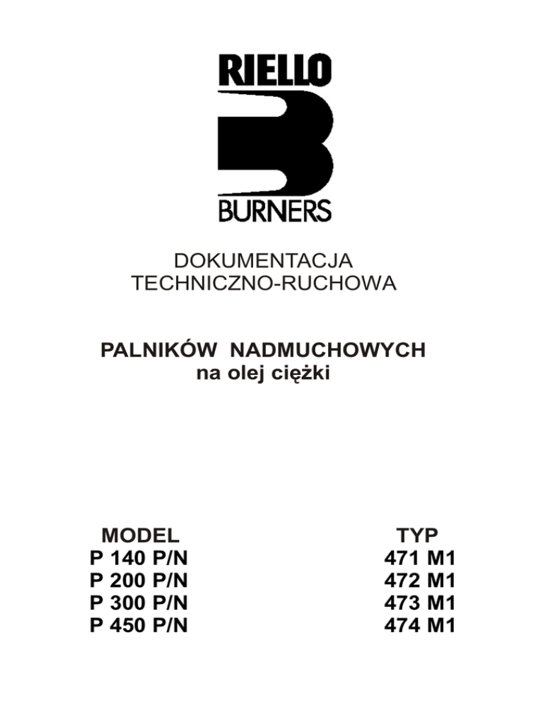 DOKUMENTACJA TECHNICZNO-RUCHOWA PALNIKÓW NADMUCHOWYCH na olej ciê¿ki MODEL P 140 P/N P 200 P/N P 300 P/N P 450 P/N TYP 471 M1 472 M1 473 M1 474 M1 SPIS TREŒCI P 140 P/N, P 200 P/N, P 300 P/N, P 450 P/N PODRÊCZNIK DO PRZEKAZANIA U¯YTKOWNIKOWI PALNIKA. Niniejszy podrêcznik stanowi integraln¹ czêœæ wyrobu, i nie powinien wystêpowaæ oddzielnie. Nale¿y go uwa¿nie przeczytaæ, poniewa¿ dostarcza on wa¿nych uwag dotycz¹cych instalacji, u¿ytkowania i konserwacji palnika. Nale¿y go starannie przechowywaæ i zagl¹daæ do niego w razie potrzeby. Producent zrzeka siê wszelkiej odpowiedzialnoœci umownej lub pozaumownej z tytu³u szkód na osobach, zwierzêtach i przedmiotach, spowodowanych b³êdami w instalacji, regulacji i konserwacji palnika, jego niew³aœciwym, nieprawid³owym lub nieracjonalnym u¿ytkowaniem, nieprzestrzeganiem zaleceñ tego podrêcznika, jak równie¿ napraw wykonywanych przez nieupowa¿niony personel. SPIS TREŒCI . ZALECENIA ODNOŒNIE BEZPIECZEÑSTWA ......................... 3 INSTRUKCJE DLA U¯YTKOWNIKA PALNIKA ......................... 5 SPECYFIKACJA TECHNICZNA..................................................6 Dane techniczne...........................................................................6 Opis palnika..................................................................................6 Akcesoria......................................................................................7 Wymiary .......................................................................................8 Zakresy mocy............................................................................... 8 INSTALACJA............................................................................... 9 P³yta kot³a.....................................................................................9 Linia zasilania paliwem.................................................................9 Pod³¹czenia elektryczne (wewnêtrzne)........................................ 11 Pod³¹czenia prze³¹cznika gwiazda/trójk¹t....................................13 Pod³¹czenia elektryczne (zewnêtrzne)........................................ 14 Pod³¹czenia elektryczne (zewnêtrzne)........................................ 15 Podzespo³y palnika.................................................................... 16 A Serwomotor.............................................................................. 16 B Pompa......................................................................................16 C Starter...................................................................................... 16 D PrzekaŸnik czasowy.................................................................16 Regulacja palnika:...................................................................... 17 A Wydajnoœæ................................................................................17 B Ciœnienie oleju..........................................................................18 C Regulacja g³owicy.................................................................... 20 D Regulacja przepustnicy powietrza........................................... 21 E Temperatura oleju.....................................................................22 Cykl startowy palnika.................................................................24 Wymiana dyszy........................................................................... 24 Schemat hydrauliczny................................................................ 25 2 ZALECENIA ODNOŒNIE BEZPIECZEÑSTWA P 140 P/N, P 200 P/N, P 300 P/N, P 450 P/N ZALECENIA ODNOŒNIE BEZPIECZEÑSTWA POMIESZCZENIE PALNIKA * Pomieszczenie palnika powinno posiadaæ otwory wychodz¹ce na zewn¹trz, zgodnie z obowi¹zuj¹cymi normami. W przypadkach w¹tpliwoœci, radzimy wykonanie pomiaru CO2 w spalinach przy palniku pracuj¹cym na maksymalnej wydajnoœci, i przy zasilaniu powietrzem tylko przez otwory nawiewowe, a nastêpnie powtórzenie pomiaru przy otwartych drzwiach. Wartoœæ CO2 nie powinna zmieniaæ siê. Je¿eli w tym samym pomieszczeniu znajduje siê wiêksza liczba palników lub urz¹dzeñ pobieraj¹cych powietrze, mog¹cych pracowaæ razem, próba powinna byæ wykonana przy równoczesnej pracy wszystkich urz¹dzeñ. * Nie zatykaæ otworów, s³u¿¹cych do przewietrzania pomieszczenia, otworu ss¹cego wentylatora palnika, ewentualnych ruroci¹gów powietrznych, oraz kratek ss¹cych lub wylotowych, w celu unikniêcia: - pozostawania w pomieszczeniu ewentualnych toksycznych i/lub wybuchowych mieszanin; - spalania przy braku powietrza: niebezpiecznego, kosztownego i zanieczyszczaj¹cego atmosferê. * Palnik powinien byæ chroniony przed deszczem, œniegiem i mrozem. * Pomieszczenie, w którym znajduje siê palnik, powinno byæ czyste i wolne od substancji lotnych, które, zassane przez wentylator, mog³yby spowodowaæ zatkanie wewnêtrznych przewodów palnika lub g³owicy spalaj¹cej. D³ugotrwa³e zapylenie tak¿e mo¿e byæ szkodliwe. Odk³adaj¹cy siê na ³opatkach wirnika py³ mo¿e powodowaæ zmniejszenie wydajnoœci wentylatora i, w konsekwencji, spalanie zanieczyszczaj¹ce atmosferê. Ponadto, py³ i kurz mog¹ odk³adaæ siê na tylnej czêœci tarczy zawirowywacza p³omienia w g³owicy spalaj¹cej, bêd¹c przyczyn¹ tworzenia siê nieprawid³owej mieszaniny powietrza i paliwa. PALIWO Palnik powinien byæ zasilany rodzajem paliwa, które jest dla niego przeznaczone. Jest ono wyszczególnione na tabliczce znamionowej palnika i w specyfikacjach technicznych w tym podrêczniku. - Ciœnienie paliwa na wejœciu do pompy nie mo¿e przekraczaæ wartoœci wyszczególnionych w tym podrêczniku. - Instalacja paliwowa zasilaj¹ca palnik winna byæ szczelna, aby unikn¹æ dostania siê powietrza do pompy. Powinna równie¿ byæ dobrana w zale¿noœci od odleg³oœci i ró¿nicy poziomu od zbiornika, stosownie do zaleceñ tego¿ podrêcznika. Instalacja paliwowa winna byæ ponadto wyposa¿ona