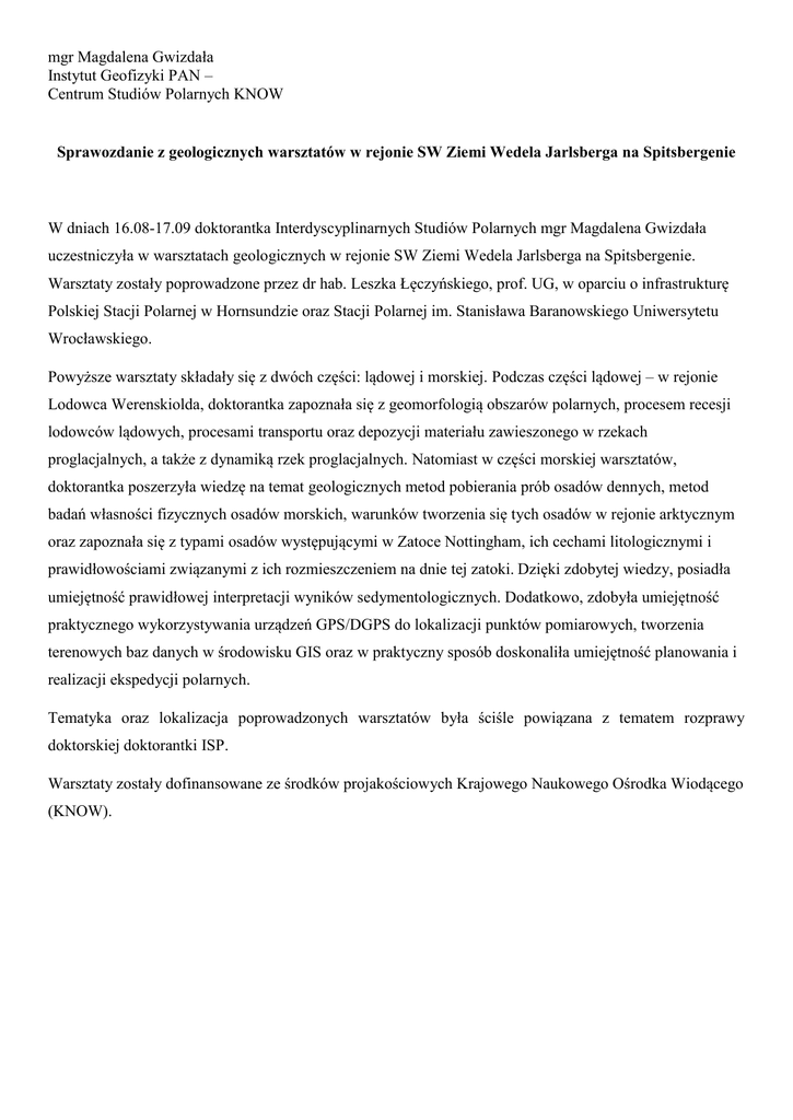 mgr Magdalena Gwizdała Instytut Geofizyki PAN – Centrum Studiów Polarnych KNOW Sprawozdanie z geologicznych warsztatów w rejonie SW Ziemi Wedela Jarlsberga na Spitsbergenie W dniach 16.08-17.09 doktorantka Interdyscyplinarnych Studiów Polarnych mgr Magdalena Gwizdała uczestniczyła w warsztatach geologicznych w rejonie SW Ziemi Wedela Jarlsberga na Spitsbergenie. Warsztaty zostały poprowadzone przez dr hab. Leszka Łęczyńskiego, prof. UG, w oparciu o infrastrukturę Polskiej Stacji Polarnej w Hornsundzie oraz Stacji Polarnej im. Stanisława Baranowskiego Uniwersytetu Wrocławskiego. Powyższe warsztaty składały się z dwóch części: lądowej i morskiej. Podczas części lądowej – w rejonie Lodowca Werenskiolda, doktorantka zapoznała się z geomorfologią obszarów polarnych, procesem recesji lodowców lądowych, procesami transportu oraz depozycji materiału zawieszonego w rzekach proglacjalnych, a także z dynamiką rzek proglacjalnych. Natomiast w części morskiej warsztatów, doktorantka poszerzyła wiedzę na temat geologicznych metod pobierania prób osadów dennych, metod badań własności fizycznych osadów morskich, warunków tworzenia się tych osadów w rejonie arktycznym oraz zapoznała się z typami osadów występującymi w Zatoce Nottingham, ich cechami litologicznymi i prawidłowościami związanymi z ich rozmieszczeniem na dnie tej zatoki. Dzięki zdobytej wiedzy, posiadła umiejętność prawidłowej interpretacji wyników sedymentologicznych. Dodatkowo, zdobyła umiejętność praktycznego wykorzystywania urządzeń GPS/DGPS do lokalizacji punktów pomiarowych, tworzenia terenowych baz danych w środowisku GIS oraz w praktyczny sposób doskonaliła umiejętność planowania i realizacji ekspedycji polarnych. Tematyka oraz lokalizacja poprowadzonych warsztatów była ściśle powiązana z tematem rozprawy doktorskiej doktorantki ISP. Warsztaty zostały dofinansowane ze środków projakościowych Krajowego Naukowego Ośrodka Wiodącego (KNOW). Fot. 1. Zajęcia terenowe na przedpolu Lodowca Werenskiolda (fot. L. Łęczyński). Fot. 2. Przygotowania do części morskiej warsztatów (fot. L. Łęczyński). Fot. 3. Prowadzący warsztaty dr hab. Leszek Łęczyński, prof. UG (fot. M. Gwizdała).