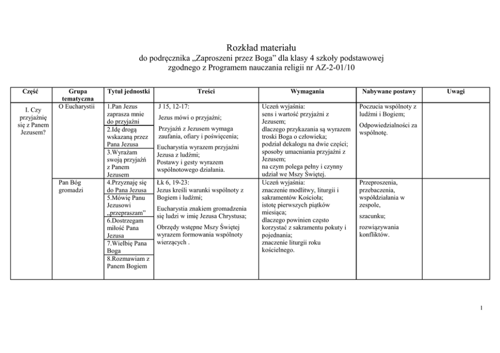 Rozkład materiału do podręcznika „Zaproszeni przez Boga” dla klasy 4 szkoły podstawowej zgodnego z Programem nauczania religii nr AZ-2-01/10 Część I. Czy przyjaźnię się z Panem Jezusem? Grupa tematyczna O Eucharystii Pan Bóg gromadzi Tytuł jednostki 1.Pan Jezus zaprasza mnie do przyjaźni 2.Idę drogą wskazaną przez Pana Jezusa 3.Wyrażam swoją przyjaźń z Panem Jezusem 4.Przyznaję się do Pana Jezusa 5.Mówię Panu Jezusowi „przepraszam” 6.Dostrzegam miłość Pana Jezusa 7.Wielbię Pana Boga 8.Rozmawiam z Panem Bogiem Treści J 15, 12-17: Jezus mówi o przyjaźni; Przyjaźń z Jezusem wymaga zaufania, ofiary i poświęcenia; Eucharystia wyrazem przyjaźni Jezusa z ludźmi; Postawy i gesty wyrazem wspólnotowego działania. Łk 6, 19-23: Jezus kreśli warunki wspólnoty z Bogiem i ludźmi; Eucharystia znakiem gromadzenia się ludzi w imię Jezusa Chrystusa; Obrzędy wstępne Mszy Świętej wyrazem formowania wspólnoty wierzących . Wymagania Nabywane postawy Uczeń wyjaśnia: sens i wartość przyjaźni z Jezusem; dlaczego przykazania są wyrazem troski Boga o człowieka; podział dekalogu na dwie części; sposoby umacniania przyjaźni z Jezusem; na czym polega pełny i czynny udział we Mszy Świętej. Uczeń wyjaśnia: znaczenie modlitwy, liturgii i sakramentów Kościoła; istotę pierwszych piątków miesiąca; dlaczego powinien często korzystać z sakramentu pokuty i pojednania; znaczenie liturgii roku kościelnego. Poczucia wspólnoty z ludźmi i Bogiem; Uwagi Odpowiedzialności za wspólnotę. Przeproszenia, przebaczenia, współdziałania w zespole, szacunku; rozwiązywania konfliktów. 1 II. Kiedy poznaję Pana Boga? Pan Bóg daje się poznać Pan Bóg przemawia Pan Bóg czeka na odpowiedź 9.Pan Bóg pozwala mi poznać siebie 10.Odkrywam słowo Boże 11.Uczę się korzystać z Pisma Świętego 12.Razem z innymi poznaję Pana Boga 13.Słucham słów Pana Boga 14.Śpiewam Panu Bogu 15.Poznaję nauczanie Pana Jezusa 16.Chcę zrozumieć Ewangelię 17.Przyjmuję Dobrą Nowinę 18.Jestem apostołem Pana Jezusa 19.Żyję słowem Bożym 20.Wyznaję wiarę w Pana Boga 21.Pamiętam o innych Hbr 1, 1-3: Bóg w historii zbawienia objawia człowiekowi siebie i swoje zamiary wobec świata; Działanie Boga w liturgii; Rok liturgiczny; Wspólnota Kościoła poznaje treści wiary, wyznaje ją i świętuje. Uczeń wymienia: nazwy wybranych ksiąg Pisma Świętego, ich autorów; Uczeń wyjaśnia: Pojęcia: Liturgia Słowa, objawienie Boże, natchnienie biblijne, Stary i Nowy Testament, Ewangelia; Związek historii zbawienia z obchodami roku liturgicznego. Słuchania Słowa Bożego; Gotowości poznawania historii zbawienia objawionej w słowie Bożym. Łk 4, 42-43: Istota wiary religijnej na przykładzie postaci biblijnych; Sens Ewangelii. Uczeń wyjaśnia: Czym jest wiara religijna; Co znaczy, że Ewangelia jest Dobrą Nowiną o zbawieniu w Jezusie Chrystusie; Dlaczego są cztery Ewangelie; Miejsce Starego i Nowego Testamentu w Liturgii Słowa; Wiary i wdzięczności za objawienie Boże i dar zbawienia; Gotowości poznawania Jezusa Chrystusa; Zaufania Jezusowi. Kościół wyjaśnia słowo Boże; Odpowiedź człowieka na usłyszane słowo Boże (wyznanie wiary, życie wiarą – dekalog, modlitwa). Uczeń wyjaśnia: Znaczenie wiary w życiu człowieka; Możliwości poznawania, rozwijania i umacniania wiary. Otwartości na usłyszane słowo Boże; Gotowości głoszenia słowa Bożego w codziennym życiu. 2 III. Dlaczego mam kochać Pana Boga i ludzi? Pan Bóg obdarowuje 22.Pan Bóg mnie stworzył 23.Otrzymałem wyjątkowe dary 24.Ja też tworzę kulturę Rdz 1, 1 – 2, 3: Boże dzieło stworzenia: Bóg stwarza – człowiek tworzy; Dary naturalne i duchowe; Człowiek twórcą kultury. Uczeń wyjaśnia: Związek Biblii z życiem człowieka; Na czym polega chrześcijański wymiar kultury. Syn Boży składa ofiarę 25.Dzielę się z innymi 26.Przynoszę Panu Bogu swoje dary 27.Dziękuję Panu Bogu za dar wyzwolenia 28.Sławię wielkość Pana Boga 29.Mam kochać jak Pan Jezus 30.Mówię Panu Bogu „Amen” 31.Modlę się do mojego Ojca 32.Rozumiem naukę Pana Jezusa 33.Przyjmuję Pana Jezusa Łk 9, 12-17: Akty czci okazywane Bogu; Sens czynów miłosierdzia; Elementy naturalne występujące w Liturgii Eucharystycznej i ich symboliczny charakter; Znaczenie przynoszonych darów i ich związek z życiem ludzi; Dziękczynienie za Boże dzieło zbawienia; Ofiara Jezusa Chrystusa; Udział w ofierze Jezusa Chrystusa. Uczeń wyjaśnia: Dlaczego miłość Boga jest najwyższą wartością w życiu człowieka; Znaczenie ofiary Jezusa Chrystusa i jej uobecnianie podczas Mszy Świętej; Znaczenie uczynków miłosiernych w codziennym życiu. Dz 2, 14. 22-24. 32-34. 36-38. 41-42: Uczeń wyjaśnia: Znaczenie przekazywanego podczas Mszy Świętej znaku pokoju; Znaczenie indywidualnego i wspólnotowego dziękczynienia po Komunii Świętej. Syn Boży daje siebie za pokarm Treść Modlitwy Pańskiej; Modlitwa Kościoła o pokój i jedność; Msza Święta ucztą ofiarną Jezusa Chrystusa; Znaczenie obrzędu Komunii Świętej podczas Mszy Świętej. Wdzięczności za dar stworzenia; Gotowości wykorzystywania darów naturalnych i nadprzyrodzonych; Kształtowania hierarchii wartości. Ofiary, poświęcenia się i służby; Współofiarowania z Jezusem Bogu; Wrażliwości na potrzeby bliźnich. . Miłości, jedności, zgody. 3 IV. Dokąd zmierzam, idąc za Panem Jezusem? Pan Jezus zaprasza do przebywania z Nim Pan Bóg opiekuje się światem Pan Bóg posyła 34.Pan Jezus zaprasza mnie do domu Ojca 35.Wierzę Panu Jezusowi 36.Naśladuję Pana Jezusa J 14,1-12: Niebo celem życia człowieka; Chrystus Drogą, Prawdą i Życiem; Czyny miłości warunkiem spełnienia ludzkiego życia. 37.Czuję obecność Pana Boga 38. Doświadczam opieki Pana Boga 39.Mogę być szczęśliwy 40.Potrzebuję błogosławieństwa Pana Boga 41.Znalazłem Przewodnika Opatrzność Boża; Błogosławieństwo znakiem opiek