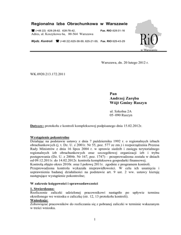 Regionalna Izba Obrachunkowa w Warszawie (+48 22) 628-28-62, 628-78-42, Adres, ul. Koszykowa 6a, 00-564 Warszawa Wydz. Kontroli Fax. RIO 628-31-16 (+48 22) 625-38-59, 625-21-55, Fax. RIO 629-43-29 Warszawa, dn. 20 lutego 2012 r. WK.0920.213.172.2011 Pan Andrzej Zaręba Wójt Gminy Raszyn ul. Szkolna 2A 05–090 Raszyn Dotyczy: protokołu z kontroli kompleksowej podpisanego dnia 15.02.2012r. Wystąpienie pokontrolne Działając na podstawie ustawy z dnia 7 października 1992 r. o regionalnych izbach obrachunkowych (j. t. Dz. U. z 2001r. Nr 55, poz. 577 ze zm.) i rozporządzenia Prezesa Rady Ministrów z dnia 16 lipca 2004 r. w sprawie siedzib i zasięgu terytorialnego regionalnych izb obrachunkowych oraz szczegółowej organizacji izb i trybu postępowania (Dz. U. z 2004r. Nr 167, poz. 1747) – przeprowadzona została w dniach od 09.12.2011r. do 14.02.2012r. kontrola kompleksowa gospodarki finansowej. Kontrolą objęto okres 2010r. oraz I połowę 2011r. zgodnie z programem kontroli. Przeprowadzona kontrola wykazała nieprawidłowości. W celu ich usunięcia i usprawnienia badanej działalności na podstawie art. 9 ust. 2 ww. ustawy kieruję następujące wystąpienie pokontrolne; W zakresie księgowości i sprawozdawczości 1. Stwierdzono: Rozliczenie zaliczki udzielonej pracownikowi nastąpiło po upływie terminu określonego we wniosku o zaliczkę (str. 12, 13 protokołu kontroli). Wnioskuję: Zobowiązać pracowników do rozliczania się z pobranej zaliczki w terminie wskazanym w treści wniosku. 1 2. Stwierdzono: Nie zachowano terminu przekazania do Regionalnej Izby Obrachunkowej: - Bilansu jednostki budżetowej na dzień 31.12.2010r., - Sprawozdania z wysokości średnich wynagrodzeń nauczycieli na poszczególnych stopniach awansu zawodowego w szkołach prowadzonych przez jednostkę samorządu terytorialnego za 2010r. (str. 16 protokołu kontroli) Wnioskuję: Przestrzegać terminów określonych w: - § 26 ust. 4 rozporządzenia Ministra Finansów z dnia 5 lipca 2010r. w sprawie szczególnych zasad rachunkowości oraz planów kont dla budżetu państwa, budżetów jednostek samorządu terytorialnego, jednostek budżetowych, samorządowych zakładów budżetowych, państwowych funduszy celowych oraz państwowych jednostek budżetowych mających siedzibę poza granicami Rzeczypospolitej Polskiej (Dz. U. z 2010r. Nr 128, poz.861), - art. 30a ust. 5 ustawy z dnia 26 stycznia 1982r. - Karta Nauczyciela (Dz. U. z 2006r. Nr 97, poz. 674 ze zm. ). W zakresie budżetu jednostki samorządu terytorialnego 3. Stwierdzono: Naliczano i pobierano odsetki za zwłokę od zaległości podatkowych w przypadku, gdy wysokość odsetek nie przekraczała trzykrotności wartości opłaty dodatkowej pobieranej przez "Pocztę Polską Spółkę Akcyjną" za polecenie przesyłki listowej (str. 20, 26 protokołu kontroli). Wnioskuję: Przestrzegać zapisów wynikających z art. 54 § 1 pkt 5 ustawy z dnia 29 sierpnia 1997r. Ordynacja podatkowa (Dz. U. z 2005 r. Nr 8, poz. 60 ze zm.). 4. Stwierdzono: Podatek rolny ustalono w zaniżonej wysokości, w wyniku przyjęcia nieprawidłowej powierzchni gruntów oraz stawki (str. 22 protokołu kontroli). Wnioskuję: Podatek rolny za dany rok podatkowy ustalać zgodnie z zasadami określonymi w art. 6 ust. 1 ustawy z dnia 15 listopada 1984 r. o podatku rolnym (Dz. U. z 2006r. Nr 136, poz. 969 ze zm.). 5. Stwierdzono: Na indywidualnych kontach podatników, księgowano przypisy lub odpisy wynikające z wydanych decyzji w sprawie wymiaru podatków lub umorzenia podatków (na wniosek podatników) przed doręczeniem decyzji (str. 25, 26, 29 protokołu kontroli). Wnioskuję: Przypisu lub odpisu podatku na koncie podatnika dokonywać po doręczeniu decyzji, stosownie do przepisów § 4 ust. 1 pkt 2 i ust. 2 pkt 6 rozporządzenia Ministra Finansów z dnia 25 października 2010 r. w sprawie zasad rachunkowości oraz planów kont dla organów podatkowych jednostek samorządu terytorialnego (Dz. U. z 2010r. Nr 208, poz. 1375), w związku z art. 212 ustawy z dnia 29 sierpnia 1997r. - Ordynacja podatkowa (Dz. U. z 2005r. Nr 8, poz.60 ze zm.), z którego wynika, iż organ podatkowy, który wydał decyzję, jest nią związany od chwili jej doręczenia. 2 6. Stwierdzono: Na indywidualnym koncie podatnika, dokonano odpisu podatku od środków transportowych, pomimo nie złożenia przez podatnika korekty deklaracji i wydania przez organ podatkowy decyzji określającej wysokość zobowiązania podatkowego. (str. 25 protokołu kontroli) Wnioskuję: Odpisu podatku na koncie podatnika dokonywać na podstawie deklaracji, z których wynika kwota zmniejszająca zobowiązanie lub decyzji, stosownie do przepisów § 4 ust. 1 pkt 1 i 2 rozporządzenia Ministra Finansów z dnia 25 października 2010 r. w sprawie zasad rachunkowości oraz planów kont dla organów podatkowych jednostek samorządu terytorialnego (Dz. U. z 2010r. Nr 208, poz. 1375). 7. Stwierdzono: Opłatę za zajęcie pasa drogowego ustalono w nieprawidłowej wysokości, poprzez przyjęcie stawki niezgodnej z obowiązującą uchwałą (str. 31 protokołu kontroli). Wnioskuję: Przy naliczaniu opłaty za zajęcie pasa drogowego stosować stawki określone przez Radę Gminy uchwałą Nr XXIV/174/04 z dnia 18.03.2004r. w sprawie: określenia wysokości stawek opłaty za zajęcie 1 m kw. pasa drogowego za jeden dzień na cele niezwiązane z budową, przebudową, remontem, utrzymaniem i ochroną dróg a także określenia stawek opłaty za umieszczenie w pasie drogowym 1 m kw. urządzeń infrastruktury technicznej i obiektów budowlanych niezwiązanych z potrzebami zarządzania drogami lub potrzebami ruchu drogowego. 8. Stwierdzono: Nie doręczono stronom wydanych w 2010r. decyzji zezwalających na zajęcie pasa drogowego i ustalających opłatę z tego tytułu (str. 31, 32 protokołu kontroli). Wnioskuję: Stosownie do art. 109 § 1 ustawy z dnia 14 czerwca 1960r. – Kodeks postępowania administracyjnego (j. t. Dz. U. z 2000r. Nr 98