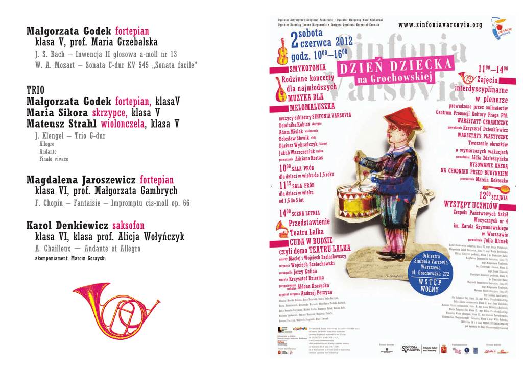 Małgorzata Godek fortepian klasa V, prof. Maria Grzebalska J. S. Bach – Inwencja II głosowa a-moll nr 13 W. A. Mozart – Sonata C-dur KV 545 „Sonata facile” TRIO Małgorzata Godek fortepian, klasaV Maria Sikora skrzypce, klasa V Mateusz Strahl wiolonczela, klasa V J. Klengel – Trio G-dur Allegro Andante Finale vivace Magdalena Jaroszewicz fortepian klasa VI, prof. Małgorzata Gambrych F. Chopin – Fantaisie – Impromptu cis-moll op. 66 Karol Denkiewicz saksofon klasa VI, klasa prof. Alicja Wołyƒczyk A. Chailleux – Andante et Allegro akompaniament: Marcin Gorayski WYST¢PY UCZNIÓW Zespołu Paƒstwowych Szkół Muzycznych nr 4 im. Karola Szymanowskiego w Warszawie prowadzenie Julia Klimek PROGRAM CHÓR klas IV i V oraz ZESPÓŁ INSTRUMENTALNY pod dyrekcjà prof. Anny Perzanowskiej-Tarasiuk Piosenki dla dzieci „Szymanowski dzieciom” Maksymilian Wojciechowski fortepian klasa I prof. Wilia Ochocka J. GarÊcia – Sonatina C-dur Michał Gorayski perkusja klasa I, prof. Stanisław Halat N. Zivkovicz – Das kleine Zirkuspony akompaniament: Marcin Gorayski Iwo Kozłowski klarnet klasa II, prof. Zenon Kitowski C. M. Weber – Pieʃ MyÊliwych G. Verdi – Matador akompaniament: Hanna Sosiƒska-Kraski Marta Tab´cka flet klasa II, prof. Maria Peradzyƒska-Filip J. Andersen – Temat z wariacjami Stanisław Krasiƒski perkusja klasa II prof. Stanislaw Halat N. Zivkowicz – Schottisches Lied akompaniament: Marcin Gorayski Zofia Sikora wiolonczela klasa II, prof. Anna Skibiƒska O. Rieding – Koncert d-moll (cz. I) akompaniament: Oksana Svekla Weronika Weiss skrzypce klasa III, prof. Bo˝ena Powichrowska O. Rieding – Concertino a-moll w stylu w´gierskim akompaniament: Katarzyna Zadro˝na Ola Salamon flet klasa III, prof. Maria Peradzyƒska-Filip E. Kohler – Perła Północy akompaniament: Michał Salamon Wojciech Łuczniewski fortepian klasa IV, prof. Małgorzata Gambrych F. Chopin – Preludium e-moll op.28 nr 4 Mateusz Onuch skrzypce klasa IV, prof. Łukasz Łosakiewicz J.S. Bach – Koncert a-moll Mateusz Strahl wiolonczela klasa V prof. Anna Skibiƒska-Haponiuk G. Goltermann – Burza akompaniament: Oksana Svekla