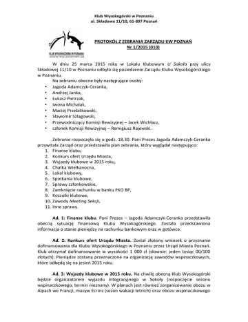 Klub Wysokogórski w Poznaniu ul. Składowa 11/10, 61-897 Poznań PROTOKÓŁ Z ZEBRANIA ZARZĄDU KW POZNAŃ Nr 1/2015 (010) W dniu 25 marca 2015 roku w Lokalu Klubowym U Sokoła przy ulicy Składowej 11/10 w Poznaniu odbyło się posiedzenie Zarządu Klubu Wysokogórskiego w Poznaniu. Na zebraniu obecne były następujące osoby: • Jagoda Adamczyk-Ceranka, • Andrzej Janka, • Łukasz Pietrzak, • Iwona Michalak, • Maciej Przebitkowski, • Sławomir Szlagowski, • Przewodniczący Komisji Rewizyjnej – Jacek Wichłacz, • członek Komisji Rewizyjnej – Remigiusz Rajewski. Zebranie rozpoczęło się o godz. 18.30. Pani Prezes Jagoda Adamczyk-Ceranka przywitała Zarząd oraz przedstawiła plan zebrania, który wyglądał następująco: 1. Finanse klubu, 2. Konkurs ofert Urzędu Miasta, 3. Wyjazdy klubowe w 2015 roku, 4. Chatka Wielkanocna, 5. Lokal klubowy, 6. Spotkania klubowe, 7. Sprawy członkowskie, 8. Zamknięcie rachunku w banku PKO BP, 9. Koszulki klubowe, 10. Zawody Meeting Sekcji, 11. Inne sprawy. Ad. 1: Finanse klubu. Pani Prezes – Jagoda Adamczyk-Ceranka przedstawiła obecną sytuację finansową Klubu Wysokogórskiego. Została przedstawiona informacja o stanie pieniędzy na rachunku bankowym oraz w gotówce. Ad. 2: Konkurs ofert Urzędu Miasta. Został złożony wniosek o przyznanie dofinansowania dla Klubu Wysokogórskiego w Poznaniu przez Urząd Miasta Poznań. Klub otrzymał dofinansowanie w wysokości 1 000 zł (słownie: jeden tysiąc 00/100 złotych). Pieniądze zostaną przeznaczone na organizację zawodów wspinaczkowych, które odbędą się na jesień 2015 roku. Ad. 3: Wyjazdy klubowe w 2015 roku. Na chwilę obecną Klub Wysokogórski będzie organizatorem wyjazdu integracyjnego w Sokoły (rozpoczęcie sezonu wspinaczkowego, termin nieznany). W planach jest również zorganizowanie obozu w Alpach we Francji, masyw Ecrins (sezon wakacji letnich) oraz obozu wspinaczkowego Klub Wysokogórski w Poznaniu ul. Składowa 11/10, 61-897 Poznań na Sardynii (termin nieznany). W sierpniu planowany jest wyjazd do Gruzji. Członek Zarządu KW Krzysztof Mularski planuje zorganizować wyprawę na Kaukaz w sierpniu, którego zostałby kierownikiem. Ad. 4: Chatka Wielkanocna. Maciej Przebitkowski, opiekun Chatki Wielkanocnej poinformował, że w Chatce został zainstalowany nowy piec. Również Zarząd KW stara się o uzyskanie od Karkonoskiego Parku Narodowego oficjalnej umowy na dzierżawę obiektu. Po uzyskaniu takiej umowy Klub rozpocznie kolejne remonty obiektu. Prezes Klubu Jagoda Adamczyk-Ceranka wystosuje oficjalne pismo do Zarządu KPN o otrzymanie umowy dzierżawy. Ad. 5: Lokal klubowy. Klub Wysokogórski zakupił nowe chwyty do lokalu klubowego na ul. Składowej w Poznaniu. Wszelkie sprawy remontowe w lokalu klubowym odłożono na czas późniejszy. Również Zarząd planuje wyznaczenie nowego opiekuna lokalu klubowego, na chwile obecną sprawa została przełożona na termin późniejszy. Ad. 6: Spotkania klubowe. V-ce Prezes, Andrzej Janka poinformował, że 17 kwietnia będzie zorganizowany pokaz prowadzony przez Pawła Marchlewicza na ścianie wspinaczkowej Blok Haus w Poznaniu pod patronatem Klubu Wysokogórskiego w Poznaniu oraz sklepu górskiego Rock&Ice. W maju swoją prezentację przedstawi członek Zarządu KW, Sławomir Szlagowski. Ad. 7: Sprawy członkowskie. Została przedstawiona lista osób, które nie opłaciły składki członkowskiej za rok 2014. Osoby te zostaną ponownie poinformowane o zaległości. Jeżeli nie uiszczą opłaty członkowskiej za 2014 rok do końca marca 2015 roku zostaną automatycznie usunięci z listy członków KW Poznań. Do Polskiego Związku Alpinistycznego do końca marca należy podać liczbę członków za 2014 rok, oraz do końca maja dokonać wpłaty do PZA za członków KW Poznań. Ad. 8: Zamknięcie rachunku w banku PKO BP. Zostało ustalone, że stary rachunek bankowy, który został założony w banku PKO BP do następnego zebrania Zarządu KW zostanie zlikwidowany. Sekretarz Klubu, Łukasz Pietrzak zajmie się likwidacją w/w rachunku bankowego. Ad. 9: Koszulki klubowe. Prezes Klubu, Jagoda Adamczyk-Ceranka złoży zamówienie do firmy robiącej koszulki klubowe o dodatkowe koszulki w różnych kolorach i rozmiarach Decyzja ta uwarunkowana jest dużym zainteresowaniem kupna koszulek klubowych przez osoby zainteresowane. Ad. 10: Zawody Meeting Sekcji. W sobotę, 28 marca 2015 roku na ściankach wspinaczkowych Klubu Wysokogórskiego w Poznaniu, Blok Haus oraz Avana zostaną zorganizowane zawody wspinaczkowe dla osób uczęszczających na sekcje wspinaczkowe na terenie Poznania. Wpływy z opłat wpisowych zostaną przekazane na opłacenie poszczególnych bulderowni, gdzie organizowane są zawody oraz na zakup nagród. Również sponsorzy przekażą swoje nagrody dla uczestników. Klub Wysokogórski w Poznaniu ul. Składowa 11/10, 61-897 Poznań Ad. 11: Inne sprawy. Przewodniczący Komisji Rewizyjnej Jacek Wichłacz przedstawił protokół wraz ze swoimi uwagami po kontroli pierwszych czterech sporządzonych protokołów z zebrań Zarządu Klubu Wysokogórskiego w Poznaniu z kadencji 2013-2016. Uwagi te zostaną przeanalizowane przez Sekretarza Klubu, Łukasza Pietrzak i zostaną one wprowadzone w życie. Kolejne zebranie Zarządu Klubu Wysokogórskiego odbędzie się w ciągu dwóch miesięcy. Protokół sporządził Sekretarz Klubu Wysokogórskiego w Poznaniu Łukasz Pietrzak 2015-03-26