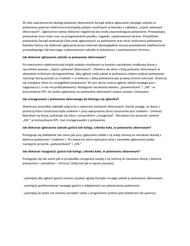 W celu usprawnienia obsługi polowań zbiorowych Zarząd zaleca zgłaszanie swojego udziału w polowaniu poprzez elektroniczną książkę pobytu myśliwych w łowisku z zakładce „rejestr polowań zbiorowych”. Zgłoszenia należy dokonać najpóźniej do środy poprzedzającej polowanie. Prowadzący polowanie musi mieć czas na przygotowanie posiłku, naganki, zaplanowania terenu. Przeddzień polowania Zarząd wydrukuje listę osób zgłoszonych na polowanie oraz druk rozliczenia polowania. Koledzy którzy nie dokonali zgłoszenia przez Internet bezwzględnie muszą powiadomić telefonicznie prowadzącego lub łowczego o planowanym udziale w polowaniu z zachowaniem terminu. Jak dokonać zgłoszenia udziału w polowaniu zbiorowym? Po otworzeniu elektronicznej książki pobytu myśliwych w łowisku naciskamy środkową ikonę z rysunkiem postaci „rejestr polowań zbiorowych”. Otwiera się okno z listą polowań zbiorowych w obwodzie w którym się logowaliśmy. Aby zgłosić swój udział w polowaniu należy wybrać polowanie, nacisnąć ikonę postaci ze znakiem + w wierszu z datą polowania (po prawej stronie wiersza). Otworzy się następne okno ze szczegółami polowania. W tym oknie można zgłosić udział swojego psa i naganiacza ( u nas nie praktykowane). Następnie naciskamy klawisz „potwierdzam” i „OK.” w komunikacie EPI. Już jesteś zgłoszony na polowanie zbiorowe!! Łatwe, proste i intuicyjne. Jak zrezygnować z polowania zbiorowego do którego się zgłosiłeś? Otwierasz wszystkie zakładki włącznie z rejestrem polowań zbiorowych. Zwróć uwagę, że ikona z postacią która oznaczona była znakiem + przy wpisywaniu teraz oznaczona jest znakiem – (minus). Naciskasz tą ikonę, pokazuje się okno z przyciskiem „rezygnacja”. Naciskasz ten przycisk i potem „OK.” w komunikacie EPI. I już zrezygnowałeś z polowania. Jak dokonać zgłoszenia udziału gościa lub kolegi, członka koła, w polowaniu zbiorowym? Postępuje się dokładnie tak samo jak przy zgłaszaniu siebie z tą małą różnicą że naciskasz ikonkę z dwoma postaciami i znakiem +. Po otwarciu okna wpisujesz imię i nazwisko zgłaszanej osoby następnie przycisk „potwierdzam” i „OK.” Jak dokonać rezygnacji gościa lub kolegi, członka koła, w polowaniu zbiorowym? Postępuje się tak samo jak w przypadku rezygnacji swojej z tą różnicą że naciskasz ikonę z dwoma postaciami i znaczkiem – (minus). Dalej tak jak w opisie powyżej. -‐ pamiętaj aby zgłosić gościa musisz uzyskać zgodę Zarządu na jego udział w polowaniu zbiorowym -‐ pamiętaj poinformować swojego gościa o odpłatności po zakończeniu polowania -‐ pamiętaj że jeżeli nie możesz poradzić sobie z programem jestem pod telefonem do pomocy