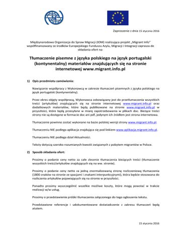 Zaproszenie z dnia 15 stycznia 2016 Międzynarodowa Organizacja do Spraw Migracji (IOM) realizująca projekt „Migrant Info” współfinansowany ze środków Europejskiego Funduszu Azylu, Migracji i Integracji zaprasza do składania ofert na: Tłumaczenie pisemne z języka polskiego na język portugalski (kontynentalny) materiałów znajdujących się na stronie internetowej www.migrant.info.pl 1) Opis przedmiotu zamówienia: Nawiązanie współpracy z Wykonawcą w zakresie tłumaczeń pisemnych z języka polskiego na język portugalski (kontynentalny). Przez okres objęty współpracą, Wykonawca zobowiązany jest do przetłumaczenia wszystkich treści (artykułów) znajdujących się na stronie internetowej www.migrant.info.pl oraz dodatkowych materiałów, które będą publikowane na stronie www.migrant.info.pl w przyszłości, które będą przesyłane w miarę zapotrzebowania w plikach doc. Bieżące treści strony nie są dostępne w formacie doc ani pdf, jedynym ich źródłem jest strona internetowa. Tłumaczenie powinno zostać wykonane na bazie polskiej wersji strony www.migrant.info.pl. Tłumaczeniu NIE podlega aplikacja znajdująca się pod linkiem www.aplikacja.migrant.info.pl. Tłumaczeniu NIE podlega dział Aktualności. Teksty dotyczą szeroko rozumianych kwestii związanych z pobytem migrantów w Polsce. 2) Sposób składania ofert: Prosimy o podanie ceny netto za całe zlecenie tłumaczenia bieżących treści (tłumaczenie wszystkich treści/artykułów znajdujących się na ww. stronie). Prosimy o podanie ceny netto za jedną znormalizowaną stronę rozliczeniową tłumaczenia (1800 znaków na stronie ze spacjami i znakami interpunkcyjnymi), która będzie stosowana do rozliczenia artykułów pojawiających się na stronie w przyszłości. Ponadto prosimy wyszczególnić wszelkie możliwe koszty, które mogą powstać w trakcie realizacji w/w usług. Prosimy o przedstawienie próbki tłumaczenia załączonego do tego ogłoszenia tekstu. Przedstawione referencje i udokumentowane doświadczenie z zakresu tłumaczeń będą atutem. 15 stycznia 2016 3) Kryteria oceny oferty: - wyska jakość dostarczonej próbki tłumaczenia – 70% - cena – 30% 4) Sposób wyboru oferty: - ocena próbek tłumaczenia przez IOM pod kątem poprawności / wymagane bezbłędne tłumaczenie - porównanie jakości dostarczonych próbek - porównanie cen - wybór oferenta potwierdzony podpisaniem protokołu 5) Prawa autorskie Wykonawca przekaże Zamawiającemu bez wyjątku wszelkie autorskie prawa majątkowe i prawa pokrewne do wyników (rezultatów) prac powstałych w ramach realizacji przedsięwzięcia, stanowiących utwory w rozumieniu ustawy z dnia 4 lutego 1994r. o prawie autorskim i prawach pokrewnych (Dz. U. z 1994r., Nr 24, poz. 83, z późn. zm.) 6) Forma rozliczenia Z wybranym Wykonawcą zostanie podpisana umowa w języku angielskim na szablonie umowy zaproponowanym przez IOM na okres do 30.06.2017. W treści umowy zostanie wskazana kwota wykonanego przez Wykonawcę tłumaczenia bieżących treści oraz kwota jednej strony tłumaczenia, która będzie stosowana do rozliczenia przyszłych treści. Płatność za tłumaczenia będzie dokonywana w terminie do 21 dni od momentu dostarczenia i zatwierdzenia przez IOM rachunku/faktury wystawionej przez Wykonawcę po przekazaniu i zatwierdzeniu materiałów przez IOM. Nie istnieje możliwość zapłacenia zaliczki. Wszystkie szczegółowe kwestie merytoryczne, techniczne i organizacyjne zostaną uzgodnione między IOM a Wykonawcą przed podpisaniem umowy oraz będą na bieżąco konsultowane między Stronami w celu zapewnienia najwyższej jakości świadczonej usługi. 7) Informacja o Zleceniodawcy: Międzynarodowa Organizacja do spraw Migracji (IOM) jest organizacją międzyrządową, w skład której wchodzi 162 krajów członkowskich, w tym Polska od 1992 r. IOM działa w myśl zasady, że uporządkowane migracje z poszanowaniem praw człowieka przynoszą korzyści migrantom, krajom i społeczeństwom. Międzynarodowa Organizacja do spraw Migracji (IOM) zaprasza wszystkie zainteresowane firmy do składania ofert, z następującymi zastrzeżeniami: 15 stycznia 2016 1. IOM zastrzega sobie prawo skontaktowania się tylko z wybranymi oferentami. 2. IOM zastrzega sobie prawo do przedłużenia terminu składania ofert wg własnego uznania. 3. Złożenie oferty przez Oferenta nie może być podstawą do jakichkolwiek roszczeń w stosunku do IOM. 4. IOM zastrzega sobie – bez konieczności podawania przyczyn – prawo odstąpienia od rozpatrywania otrzymanej oferty zarówno w odniesieniu do całości jak i jej poszczególnych elementów. 5. IOM zastrzega sobie prawo do przeprowadzenia negocjacji z wybranymi oferentami. Dane zamawiającego: Międzynarodowa Organizacja do Spraw Migracji (IOM) ul. Mariensztat 8, 00-302 Warszawa tel. 22 53 89 103, fax. 22 53 89 140 Oferty wykonania zlecenia prosimy nadsyłać na adres [email protected] w terminie do dnia 31.01.2016 r. do godz. 23.59 z adnotacją „FM0446 Tłumaczenia jęz. portugalski” Zamawiający odrzuci oferty złożone po terminie. Wykonawcy ponoszą wszelkie koszty własne związane z przygotowaniem i złożeniem oferty, niezależnie od wyniku postępowania. TEKST DO PRZETŁUMACZENIA: W trakcie trwającego postępowania odwoławczego nie można złożyć kolejnego wniosku o uzyskanie zezwolenia na pobyt czasowy. Wykluczają taką możliwość przepisy kodeksu postepowania administracyjnego - nie można równolegle prowadzić dwóch postepowań administracyjnych w tej samej sprawie. Jeśli organ drugiej instancji podtrzyma decyzję negatywną cudzoziemiec będzie musiał w ciągu 30 dni opuścić Polskę. Jeśli dopełni tego obowiązku w terminie, będzie mógł aplikować w swoim kraju pochodzenia o wizę (np. z tytułu pracy) i na tej podstawie ponownie przyjechać do Polski. 15 stycznia 2016