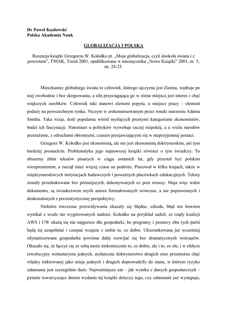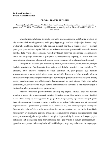 Dr Paweł Kozłowski Polska Akademia Nauk GLOBALIZACJA I POLSKA Recenzja książki Grzegorza W. Kołodko pt. „Moja globalizacja, czyli dookoła świata i z powrotem”, TNOiK, Toruń 2001, opublikowana w miesięczniku „Nowe Książki” 2001, nr 5, str. 24-25. Mieszkaniec globalnego świata to człowiek, którego ojczyzna jest Ziemia, wędruje po niej swobodnie i bez skrępowania, a siła przyciągającą go w różne miejsca jest interes i chęć większych zarobków. Człowiek taki stanowi element popytu, a miejsce pracy – element podaży na powszechnym rynku. Niczym w zrekonstruowanym przez wnuki marzeniu Adama Smitha. Taka wizja, dość popularna wśród myślących prostymi kategoriami ekonomistów, budzi ich fascynacje. Natomiast u polityków wywołuje raczej niepokój, a u wielu narodów przerażenie, z odruchami obronnymi, czasem przejawiającymi się w nieprzyjemnej postaci. Grzegorz W. Kołodko jest ekonomistą, ale nie jest ekonomistą doktrynerskim, ani tym bardziej prostackim. Problematyka jego najnowszej książki również o tym świadczy. To obszerny zbiór tekstów pisanych w ciągu ostatnich lat, gdy przestał być polskim wicepremierem, a zaczął mieć więcej czasu na podróże. Pracował w kilku krajach, także w międzynarodowych instytucjach badawczych i poważnych placówkach edukacyjnych. Teksty zostały przedrukowane bez późniejszych, dokonywanych ex post retuszy. Maja więc walor dokumentu, są świadectwem myśli autora formułowanych wówczas, a nie poprawionych i doskonalonych z prezentystycznej perspektywy. Niektóre ówczesne przewidywania okazały się błędne, szkoda, błąd ten bowiem wynikał z wcale nie wygórowanych nadziei. Kołodko na przykład sadził, ze rządy koalicji AWS i UW okażą się nie najgorsze dla gospodarki, bo programy i postawy obu tych partii będą się uzupełniać i czerpać wzajem z siebie to, co dobre. Ukierunkowana już wcześniej zdynamizowana gospodarka powinna dalej rozwijać się bez dramatycznych wstrząsów. Okazało się, że łączyć się ze sobą może niekoniecznie to, co dobre, ale i to, co złe, i w efekcie rewolucyjny woluntaryzm jednych, archaiczne doktrynerstwo drugich oraz przemożna chęć władzy traktowanej jako misja jednych i drugich doprowadziły do stanu, w którym ryzyko załamania jest szczególnie duże. Najważniejsze zaś – jak wynika z danych gospodarczych – pytanie towarzyszące dniom wydania tej książki dotyczy tego, czy załamanie już występuje, tyle ze rozłożone na raty, czy mimo takiego mrożącego spadku gospodarczego czeka nas jeszcze gwałtowny i głęboki wstrząs. Już w tytule książki połączona została perspektywa osobista, człowieka przeżywającego, z perspektywą naukowca i polityka gospodarczego, osoby chłodno analizującej i ważącej argumenty. Globalizacja dla autora to nie tylko wędrówka w przestrzeni otwartego rynku. Nie wszystkie motywy postępowania człowieka mają treść finansową, dla wielu najważniejsze są inne powody nadające sens życiu – nie jedynie rynek z jego podażą, popytem i towarem, ale również ojczyzna, przywiązanie do tego co swoje i dzięki czemu można być sobą. O ruchu ludności, o migracjach decyduje nie wyłącznie rynek pracy, ale również te względy, pomijane w uproszczonych analizach skoncentrowanych na wymyślonym Homo Oeconomicus. Kołodko jest przykładem człowieka, który kieruje się w życiu tymi właśnie, głębszymi powodami, poznaje świat, korzysta z jego otwierania się, ale zarazem wie, gdzie jest u siebie, choć czasem to przywiązanie do miejsca i do narodu przyczynia też sporo bolesnych doznanych doznań. Książka jest o Polsce i o globalizacji, o naszych ważnych problemach i o tym, jaka powinniśmy ustosunkować się do świata szybko przybierającego nowa postać. Globalizacja bywa często, szczególnie u nas, traktowana jak coś oczywistego i nieuchronnego, niczym zjawisko przyrodnicze, i zgodnie z taką deterministyczną postawą należy się jej po prostu podporządkować. Im bardziej będziemy się na nią otwierać, tym – jakoby – postępujemy mądrzej. Znajdziemy się bowiem w głównym nurcie naturalnych i koniecznych przemian. WW gospodarce w zamian za pełną dostępność oznacza to korzystanie z obfitego, zewnętrznego zasilania finansowego, inwestycji bezpośrednich i portfelowych, handlu bez granic i ograniczeń, przepływu ludzi itp. Ale też jest postawa przeciwna, u nas obecna, choć publicznie wyrażana rzadziej. To reakcja na globalizację polegająca na zamknięciu, izolowaniu się, ochronie tego, co uważa się za najważniejsze i lepsze od otoczenia, dbanie o tzw. substancję narodową za cenę lekceważenia spraw gospodarczych i podstaw materialnych. Grzegorz Kołodko odrzuca oba te punkty widzenia: zarówno pasywno-uległy jak i izolacjonistyczno-defensywny. Wybiera stanowisko trzecie. Dostrzega globalizację i docenia fakt, że to dominujący proces przełomu wieków. Jest on złożony i ma rozmaite konsekwencje, zarówno dobre jak i złe. Potrzebna jest zatem postawa aktywna i światła, co tym bardziej oznacza konieczność prowadzenia polityki gospodarczej, szczególnie przez taki kraj jak Polska. Państwa duże i silne na globalizacji mogą tylko zyskać, państwa mniejsze i słabsze, o nieustabilizowanej strukturze instytucjonalnej, mogą zarówno zyskać jak i stracić. 2 Od władzy – i politycznej, i gospodarczej – wymaga się więc szczególnych umiejętności, obywatele mają prawo do dobrego rządu, rozumiejącego potrzeby kraju i jego sytuację. Przyjęcie doktrynerskiej postawy pełnego oddania jest równie niebezpieczne jak radykalizm obronnego izolacjonizmu. Na jednym i drugim możemy stracić, nie mówiąc o tym, że obie te postawy są wynikiem bezradności. Globalizacja dotyka nie tylko Polskę, top proces wszechobejmujący. Z nim związany jest też problem światowy: czy ma ona przebiegać w sposób nieograniczony, podporządkowana jed