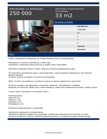 Warszawa, Praga-Południe, Grochowska MIESZKANIE na SPRZEDAŻ 250 000 33 m2 342/5612/OMS 250 000 PLN 7 576 PLN 33 1 1 4 Separate Secondary Opis Ładne, odświeżone mieszkanie na Pradze Południe przy ul Grochowskiej. Mieszkanie 2 stronne w kamienicy z 1953 roku Kawalerka z oddzielną widną kuchnią w pobliżu Placu Szembeka. Pierwotna wysokość ponad 3 metry. Obecnie zrobione podwieszane sufity. W mieszkaniu wymienione piony, nowe kaloryfery, nowa instalacja elektryczna. Na ścianach gładzie gipsowe. Z salonu wyjście na balkon od strony Grochowskiej. Okna z kuchni od podwórza, na którym można za darmo zaparkować samochód. W kuchni zostaje cała zabudowa, zmywarka, piekarnik, mikrofalówka i lodówka. Budynek po remoncie. Nowe okna. Nowa elewacja, nowe drzwi wejściowe do klatek. Klatka czysta. Czynsz wraz z funduszem remontowy 350 zł Pomieszczenia: Salon 20 m2 Kuchnia 7 m2 Łazienka 3 m2 Przedpokój 3 m2 Mieszkanie własnościowe z czystą KW. Serdecznie zapraszam na prezentację. Mieszkanie idealnie nadaje się na wynajem a także jako pierwsza nieruchomość na start. Doradcy kredytowi Finamax udzielą bezpłatnej pomocy w uzyskaniu kredytu hipotecznego. Finamax Nieruchomości Łukasz Kozłowski tel. 600 989 302 email: [email protected] Finamax Nieruchomości Powered by TCPDF (www.tcpdf.org)