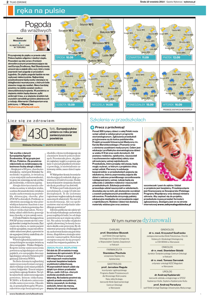 2 Środa 10 września 2014 | Gazeta Wyborcza | wyborcza.pl TYLKO ZDROWIE ręka na pulsie pą Pogoda Gdańsk 16°C dla wrażliwych Gdańsk 18°C Szczecin 16°C Rafał Maszewski Białystok 18°C Szczecin 18°C Gdańsk 19°C Białystok 20°C Szczecin 20°C Poznań 19°C Poznań 17°C Białystok 23°C Poznań 21°C 20°C Warszawa 22°C Warszawa 19°C l KLIMATOLOG Z UMK W TORUNIU Wrocław 17°C Lublin 20°C Przynajmniej do piątku w prawie całej Polsce będzie wilgotno i niezbyt ciepło. Powodem są niże wraz z frontami atmosferycznymi przemieszczające się nad Europą Środkową. Nad Skandynawią umocni się w piątek silny wyż, który może poprawić nam pogodę w przyszłym tygodniu. Do piątku pogoda będzie na nas wpływać niekorzystnie. Najbardziej poszkodowane będą osoby cierpiące na dolegliwości reumatyczne, u których bóle stawów mogą się nasilać. Nieco bardziej powinny na siebie uważać osoby z niewydolnością krążenia. W powietrzu w stężeniu niskim będą obecne pyłki ambrozji i traw, a w stężeniu średnim lub wysokim zarodniki grzybów pleśniowych z rodzaju Alternaria i Cladosporium oraz pokrzywy. f Więcej na: Wyborcza.pl/tylkozdrowie Wrocław 19°C Kraków 18°C Wrocław 18°C Lublin 19°C ŚRODA 10.09 Lublin 23°C Kraków 20°C CZWARTEK 11.09 PIĄTEK 12.09 Kraków 18°C Gdańsk 23°C Gdańsk 23°C Gdańsk 21°C Szczecin 20°C Poznań 22°C Gdańsk 21°C Szczecin 21°C Szczecin 21°C Białystok 23°C Wrocław 22°C Wrocław 23°C Wrocław 20°C SOBOTA 13.09 Warszawa 24°C Warszawa 24°C Warszawa 22°C Lublin 22°C Kraków 21°C Poznań 23°C Poznań 22°C Poznań 21°C Lublin 22°C Lublin 25°C Lublin 24°C Kraków 22°C Kraków 20°C NIEDZIELA 14.09 Białystok 25°C Białystok 24°C Białystok 22°C Warszawa 22°C Wrocław 19°C Szczecin 21°C PONIEDZIAŁEK 15.09 Kraków 23°C WTOREK 16.09 PROGNOZĘ DOSTARCZA METEOGROUP 430 tys. Europejczyków umiera co roku przez zanieczyszczone powietrze Elżbieta Cichocka l GAZETA WYBORCZA Tak wynika z danych Europejskiej Agencji Środowiska. W tej grupie jest 45 tys. Polaków. Złe powietrze odpowiada za zwiększającą się lawinowo liczbę alergii u dzieci. – Alergia jest w100 proc. chorobą środowiskową – mówi prof. Bolesław Samoliński i wyjaśnia, że świadczą o tym statystyki zachorowalności, bo geny nie zmieniają się tak szybko jak środowisko, w którym żyjemy. Alergia dziecięca naraża człowieka na astmę w młodym wieku, a astma dwunastokrotnie zwiększa ryzyko zachorowania na przewlekłą obturacyjną chorobę płuc (POChP) u dorosłych. Problemy ze zdrowiem zaczynają się więc przewlekłym katarem i kaszlem u małych dzieci, a kończą poważną chorobą w wieku dojrzałym. Niewydolny układ oddechowy generuje inne choroby, w tym zawały serca. Z2,5 mln Polaków chorujących na POChP aż trzy czwarte nie wie oswojej chorobie izostaje bez leczenia. Zbyt często się zdarza, że zanim pacjent trafi do specjalisty, ma już nieodwracalnie zniszczone płuca, aprzecież to nie są pacjenci, którzy znaleźli się ulekarza po raz pierwszy. Wśród najbardziej zanieczyszczonych krajów na mapie świata są dwa europejskie – Polska i Bułgaria. Krajowe normy zanieczyszczenia powietrza są łagodniejsze od europejskich, a te europejskie dwa razy łagodniejsze od norm Światowej Organizacji Zdrowia (WHO). Na liście dziesięciu najbardziej zanieczyszczonych miast europejskich widnieje sześć miast polskich i cztery bułgarskie. Trzecie miejsce na tej liście zajmuje Kraków. Nie tylko samochody zanieczyszczają nam powietrze, którym oddychamy. W 2009 r. w Krakowie zmierzono źródła zanieczyszczenia. Okazało się, że ponad połowa pyłu i 90 proc. rakotwórczego benzopirenu powww.facebook.com/tylkozdrowie chodziło z dymu wydostającego się z kominów domów jednorodzinnych. Przestarzałe piece, złej jakości, najtańszy węgiel, aco gorsza, spalanie w piecach plastikowych śmieci powodują, że nieświadomie zatruwamy siebie, nasze dzieci i sąsiadów. W Małopolsce koszty leczenia ludzi chorujących wskutek złego powietrza to 2,8 mld zł rocznie. Dodatkowych kosztów cierpienia chorych nie da się przeliczyć na złotówki. W Polsce jest 5 mln domów jednorodzinnych, z czego 3,5 mln niedocieplonych. Te źle izolowane i ogrzewane węglem należą do mniej zamożnych właścicieli. Nie stać ich na modernizację. Ale czy społeczeństwo stać na wdychanie szkodliwego powietrza? Zdrowie publiczne nie zależy tylko od indywidualnego zachowania poszczególnych ludzi, bo od złego powietrza nie są w stanie się uchronić. Nie zależy też tylko od jakości opieki zdrowotnej, bo koszty leczenia to skutki, a nie przyczyny. By eliminować przyczyny zwiększających się zachorowań konieczna jest świadoma, długofalowa strategia ministerstw i samorządów. Rewolucji energetycznej nie da się przeprowadzić bez wsparcia państwa. f ZBADAJ PŁUCA. BEZPŁATNIE Od dziś do 20 września trwają światowe dni spirometrii. W tym czasie w Polsce w ponad 100 miejscach można będzie wykonać bezpłatne badania wydolności oddechowej. W poprzednich latach udało się dzięki tym dniom przebadać 30 tys. osób i 4,5 tys. chorych szybciej uzyskało pomoc lekarską. Na badania powinni się zgłosić przede wszystkim ci, którzy zauważyli, że dostają zadyszki, łatwo się męczą, dręczy ich uporczywy kaszel. Szkolenia w przedszkolach + Precz z próchnicą! Ponad 300 tysięcy dzieci z całej Polski może wziąć udział w edukacyjnym programie stomatologicznym. Zgłoszenia przedszkoli przyjmowane są do końca października. Projekt prowadzi Uniwersytet Medyczny im. Karola Marcinkowskiego z Poznania wraz z ośmioma uczelniami medycznymi. Celem jest edukacja i profilaktyka stomatologiczna dzieci w wieku 0-5 lat oraz osób dorosłych. Od postawy rodziców, opiekunów, nauczycieli i wychowawców najbardziej zależy stan zdrowia jamy ustnej najmłodszych. Przedszkola, które przejdą rekrutację, będą mog