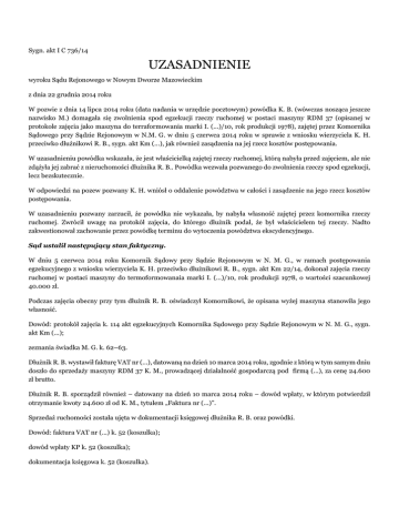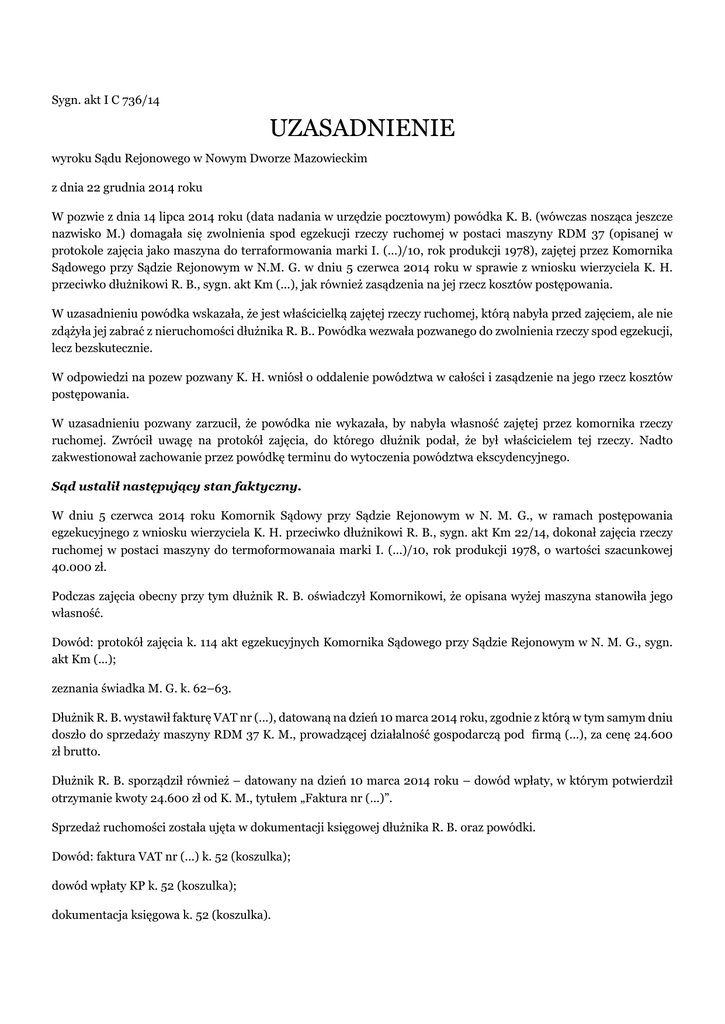Sygn. akt I C 736/14 UZASADNIENIE wyroku Sądu Rejonowego w Nowym Dworze Mazowieckim z dnia 22 grudnia 2014 roku W pozwie z dnia 14 lipca 2014 roku (data nadania w urzędzie pocztowym) powódka K. B. (wówczas nosząca jeszcze nazwisko M.) domagała się zwolnienia spod egzekucji rzeczy ruchomej w postaci maszyny RDM 37 (opisanej w protokole zajęcia jako maszyna do terraformowania marki I. (...)/10, rok produkcji 1978), zajętej przez Komornika Sądowego przy Sądzie Rejonowym w N.M. G. w dniu 5 czerwca 2014 roku w sprawie z wniosku wierzyciela K. H. przeciwko dłużnikowi R. B., sygn. akt Km (...), jak również zasądzenia na jej rzecz kosztów postępowania. W uzasadnieniu powódka wskazała, że jest właścicielką zajętej rzeczy ruchomej, którą nabyła przed zajęciem, ale nie zdążyła jej zabrać z nieruchomości dłużnika R. B.. Powódka wezwała pozwanego do zwolnienia rzeczy spod egzekucji, lecz bezskutecznie. W odpowiedzi na pozew pozwany K. H. wniósł o oddalenie powództwa w całości i zasądzenie na jego rzecz kosztów postępowania. W uzasadnieniu pozwany zarzucił, że powódka nie wykazała, by nabyła własność zajętej przez komornika rzeczy ruchomej. Zwrócił uwagę na protokół zajęcia, do którego dłużnik podał, że był właścicielem tej rzeczy. Nadto zakwestionował zachowanie przez powódkę terminu do wytoczenia powództwa ekscydencyjnego. Sąd ustalił następujący stan faktyczny. W dniu 5 czerwca 2014 roku Komornik Sądowy przy Sądzie Rejonowym w N. M. G., w ramach postępowania egzekucyjnego z wniosku wierzyciela K. H. przeciwko dłużnikowi R. B., sygn. akt Km 22/14, dokonał zajęcia rzeczy ruchomej w postaci maszyny do termoformowanaia marki I. (...)/10, rok produkcji 1978, o wartości szacunkowej 40.000 zł. Podczas zajęcia obecny przy tym dłużnik R. B. oświadczył Komornikowi, że opisana wyżej maszyna stanowiła jego własność. Dowód: protokół zajęcia k. 114 akt egzekucyjnych Komornika Sądowego przy Sądzie Rejonowym w N. M. G., sygn. akt Km (...); zeznania świadka M. G. k. 62–63. Dłużnik R. B. wystawił fakturę VAT nr (...), datowaną na dzień 10 marca 2014 roku, zgodnie z którą w tym samym dniu doszło do sprzedaży maszyny RDM 37 K. M., prowadzącej działalność gospodarczą pod firmą (...), za cenę 24.600 zł brutto. Dłużnik R. B. sporządził również – datowany na dzień 10 marca 2014 roku – dowód wpłaty, w którym potwierdził otrzymanie kwoty 24.600 zł od K. M., tytułem „Faktura nr (...)”. Sprzedaż ruchomości została ujęta w dokumentacji księgowej dłużnika R. B. oraz powódki. Dowód: faktura VAT nr (...) k. 52 (koszulka); dowód wpłaty KP k. 52 (koszulka); dokumentacja księgowa k. 52 (koszulka). Powódka prowadzi działalność gospodarczą od listopada 2013 roku. Początkowo zajmowała się wynajmem samochodów, od lutego–marca 2014 roku zmieniła profil działalności na produkcję opakowań. Z dłużnikiem R. B. nie prowadziła interesów. Zakup maszyn takich, jak objęta żądaniem pozwu, stanowi w jej działalności poważną, wyjątkową transakcję. O zajęciu ruchomości objętej żądaniem pozwu powódka dowiedziała się 16 czerwca 2014 roku, po ślubie z dłużnikiem R. B., który miał miejsce na początku czerwca. Dowód: zeznania powódki k. 64–65. Stan faktyczny Sąd ustalił na podstawie powołanych dokumentów oraz zeznań świadka M. G. i powódki. Protokół zajęcia ruchomości stanowi dokument urzędowy, bowiem został sporządzony przez komornika sądowego w ramach przysługujących mu kompetencji (art. 244 k.p.c.). Jego autentyczność nie została zakwestionowana przez strony. Nie został przeprowadzony również dowód na okoliczność, by protokół nie odzwierciedlał rzeczywistego stanu rzeczy, w tym oświadczenia dłużnika wciągniętego do protokołu. Dokumenty księgowe przedłożone przez powódkę miały ograniczoną moc dowodową. Nie sposób dokumentom tym przyznać większej wartości, niż dokumentom prywatnym (art. 245 k.p.c.), co oznacza, że mogą stanowić dowód złożenia przez podpisane pod nimi osoby oświadczeń określonej treści. Same dokumenty księgowe nie pozwalają na ustalenie, że strony łączyła umowa określonej treści, jak i tego czy i w jakim zakresie umowa ta została zrealizowana (por. wyrok Sądu Apelacyjnego w Białymstoku z dnia 9 stycznia 2014 roku, sygn. akt I ACa 622/13, SIP LEX nr 1425358, dotyczący faktury VAT). Z tych przyczyn konieczne jest przytoczenie innych dowodów na te okoliczności. Podpisany pod fakturą i dowodem wpłaty R. B. odmówił jednak składania zeznań. Zeznaniom świadka M. G. Sąd w całości dał wiarę. Brak podstaw, by zeznania te kwestionować, są one nadto częściowo poparte omówionym wyżej protokołem. Istotne było potwierdzenie przez Komornika, że oświadczenie dotyczące własności rzeczy ruchomej wynikało z wyraźnego przyznania przez dłużnika praw do rzeczy. Zeznaniom powódki Sąd dał natomiast wiarę jedynie częściowo. Brak było podstaw, by podważać jej wiarygodność co do samego faktu prowadzenia przez nią działalności gospodarczej czy też daty, w jakiej dowiedziała się o zajęciu ruchomości objętej żądaniem pozwu. Sąd nie uznał jednak za wiarygodne jej zeznań co do tego, że w drodze umowy nabyła tę rzecz ruchomą. Powódka w tej kwestii zeznawała niejasno. Jak przyznała, tego rodzaju umowa stanowi zdarzenie wyjątkowe w jej działalności, zatem można było się spodziewać, że będzie pamiętać transakcję. Nie można oczywiście oczekiwać, że zapamięta wszystkie szczegóły, ale powódka nie była nawet pewna, czy w ogóle taką umowę zawarła, operując przy tym zwrotami typu „nie pamiętam, czy była umowa”, „chyba była umowa” czy „wydaje mi się, że umowa była” (k. 64). Potem co prawda stwierdziła, że była umowa pisemna, ale nie potrafiła jej odnaleźć, co znów budzi spore wątpliwości, jeśli by