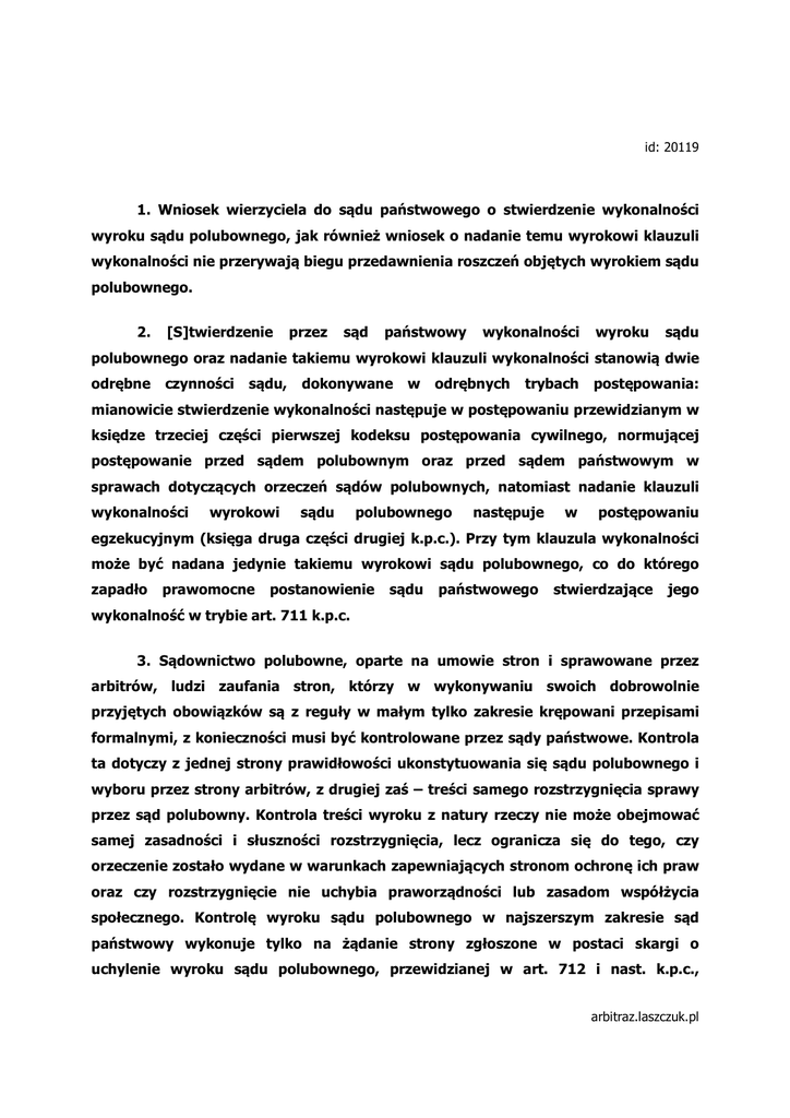 id: 20119 1. Wniosek wierzyciela do sądu państwowego o stwierdzenie wykonalności wyroku sądu polubownego, jak również wniosek o nadanie temu wyrokowi klauzuli wykonalności nie przerywają biegu przedawnienia roszczeń objętych wyrokiem sądu polubownego. 2. [S]twierdzenie przez sąd państwowy wykonalności wyroku sądu polubownego oraz nadanie takiemu wyrokowi klauzuli wykonalności stanowią dwie odrębne czynności sądu, dokonywane w odrębnych trybach postępowania: mianowicie stwierdzenie wykonalności następuje w postępowaniu przewidzianym w księdze trzeciej części pierwszej kodeksu postępowania cywilnego, normującej postępowanie przed sądem polubownym oraz przed sądem państwowym w sprawach dotyczących orzeczeń sądów polubownych, natomiast nadanie klauzuli wykonalności wyrokowi sądu polubownego następuje w postępowaniu egzekucyjnym (księga druga części drugiej k.p.c.). Przy tym klauzula wykonalności może być nadana jedynie takiemu wyrokowi sądu polubownego, co do którego zapadło prawomocne postanowienie sądu państwowego stwierdzające jego wykonalność w trybie art. 711 k.p.c. 3. Sądownictwo polubowne, oparte na umowie stron i sprawowane przez arbitrów, ludzi zaufania stron, którzy w wykonywaniu swoich dobrowolnie przyjętych obowiązków są z reguły w małym tylko zakresie krępowani przepisami formalnymi, z konieczności musi być kontrolowane przez sądy państwowe. Kontrola ta dotyczy z jednej strony prawidłowości ukonstytuowania się sądu polubownego i wyboru przez strony arbitrów, z drugiej zaś – treści samego rozstrzygnięcia sprawy przez sąd polubowny. Kontrola treści wyroku z natury rzeczy nie może obejmować samej zasadności i słuszności rozstrzygnięcia, lecz ogranicza się do tego, czy orzeczenie zostało wydane w warunkach zapewniających stronom ochronę ich praw oraz czy rozstrzygnięcie nie uchybia praworządności lub zasadom współżycia społecznego. Kontrolę wyroku sądu polubownego w najszerszym zakresie sąd państwowy wykonuje tylko na żądanie strony zgłoszone w postaci skargi o uchylenie wyroku sądu polubownego, przewidzianej w art. 712 i nast. k.p.c., arbitraz.laszczuk.pl ograniczonej terminem i zakresem podstaw zaskarżenia wyroku. Natomiast kontrola zgodności wyroku z zasadami praworządności oraz z zasadami współżycia społecznego dokonywana jest przez sąd państwowy z urzędu i temu celowi służy instytucja stwierdzenia wykonalności wyroku. 4. Postanowienie stwierdzające wykonalność wyroku sądu polubownego, choć jest konieczną przesłanką dopuszczalności wykonywania tego wyroku w drodze przymusu państwowego, samo przez się nie stanowi jednak czynności zmierzającej do jego wykonania. Zgłoszenie żądania stwierdzenia wykonalności nie należy zatem do czynności podjętych „bezpośrednio w celu dochodzenia lub ustalenia albo zaspokojenia lub zabezpieczenia” zasądzonego wyrokiem roszczenia w rozumieniu art. 123 § 1 pkt 1 k.c. Uchwała Sądu Najwyższego z dnia 20 lutego 1974 r. III CZP 2/74 Skład orzekający: SSN J. Majorowicz (przewodniczący) SSN K. Olejniczak SSN Z. Masłowski (sprawozdawca) Sąd Najwyższy, w sprawie z powództwa Bolesława J. przeciwko Marii N. i Zofii N. o pozbawienie wykonalności tytułu wykonawczego, po rozpoznaniu na posiedzeniu jawnym dnia 20 lutego 1974 r. następującego zagadnienia prawnego przekazanego przez Sąd Wojewódzki dla m.st. Warszawy postanowieniem z dnia 10 grudnia 1973 r. do rozstrzygnięcia w trybie art. 391 k.p.c.: „Czy wniosek wierzyciela do sądu państwowego o stwierdzenie wykonalności wyroku sądu polubownego i nadanie klauzuli wykonalności temu wyrokowi jest czynnością przed sądem w rozumieniu art. 123 § 1 kodeksu cywilnego, przedsięwziętą bezpośrednio w celu dochodzenia arbitraz.laszczuk.pl roszczenia, i czy wskutek tego przerywa bieg terminu przedawnienia roszczenia objętego wyrokiem sądu polubownego?”, postanowił udzielić następującej odpowiedzi: Wniosek wierzyciela do sądu państwowego o stwierdzenie wykonalności wyroku sądu polubownego, jak również wniosek o nadanie temu wyrokowi klauzuli wykonalności nie przerywają biegu przedawnienia roszczeń objętych wyrokiem sądu polubownego. Uzasadnienie Sąd Powiatowy wyrokiem z dnia 3.IX.1973 r. oddalił powództwo Bolesława J. o pozbawienie wykonalności tytułu wykonawczego – wyroku sądu polubownego, oparte na zarzucie przedawnienia roszczeń objętych tym wyrokiem. Rozpoznając sprawę na skutek rewizji powoda, Sąd Wojewódzki przedstawił Sądowi Najwyższemu w trybie art. 391 § 1 k.p.c. budzące wątpliwości zagadnienie prawne, przytoczone na wstępie. Udzielając odpowiedzi, Sąd Najwyższy miał na uwadze, co następuje: Według przepisu art. 711 k.p.c. wyrok sądu polubownego uzyskuje moc prawną na równi z wyrokiem sądu państwowego dopiero po stwierdzeniu przez sąd państwowy jego wykonalności. Stwierdzenie wykonalności następuje w odrębnym postępowaniu i staje się skuteczne po uprawomocnieniu się postanowienia sądu. Sąd, stwierdzając wykonalność wyroku sądu polubownego, bada, czy wyrok ten swą treścią nie uchybia praworządności lub zasadom współżycia społecznego w Polskiej Rzeczypospolitej Ludowej. Po uprawomocnieniu się postanowienia stwierdzającego wykonalność wyrok sądu polubownego jest tytułem egzekucyjnym w rozumieniu art. 776 k.p.c. Wyrok taki, zaopatrzony w klauzulę wykonalności w trybie art. 781 § 4 k.p.c., staje się tytułem wykonawczym, który może być podstawą wszczęcia egzekucji. arbitraz.laszczuk.pl Jak wynika z przytoczonych przepisów, stwierdzenie przez sąd państwowy wykonalności wyroku sądu polubownego oraz nadanie takiemu wyrokowi klauzuli wykonalności stanowią dwie odrębne czynności sądu, dokonywane w odrębnych trybach postępowania: postępowaniu mianowicie przewidzianym w stwierdzenie księdze trzeciej wykonalności części następuje pierwszej w kodek