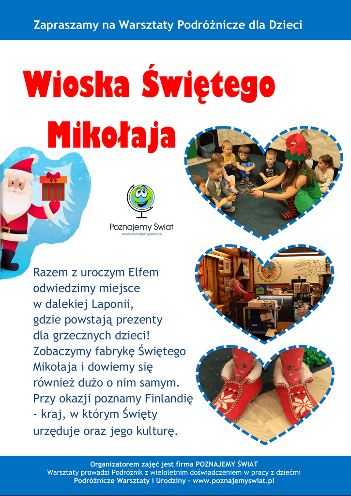 Zapraszamy na Warsztaty Podróżnicze dla Dzieci Wioska Świętego Mikołaja Razem z uroczym Elfem odwiedzimy miejsce w dalekiej Laponii, gdzie powstają prezenty dla grzecznych dzieci! Zobaczymy fabrykę Świętego Mikołaja i dowiemy się również dużo o nim samym. Przy okazji poznamy Finlandię - kraj, w którym Święty urzęduje oraz jego kulturę. Organizatorem zajęć jest firma POZNAJEMY ŚWIAT Warsztaty prowadzi Podróżnik z wieloletnim doświadczeniem w pracy z dziećmi Podróżnicze Warsztaty i Urodziny - www.poznajemyswiat.pl